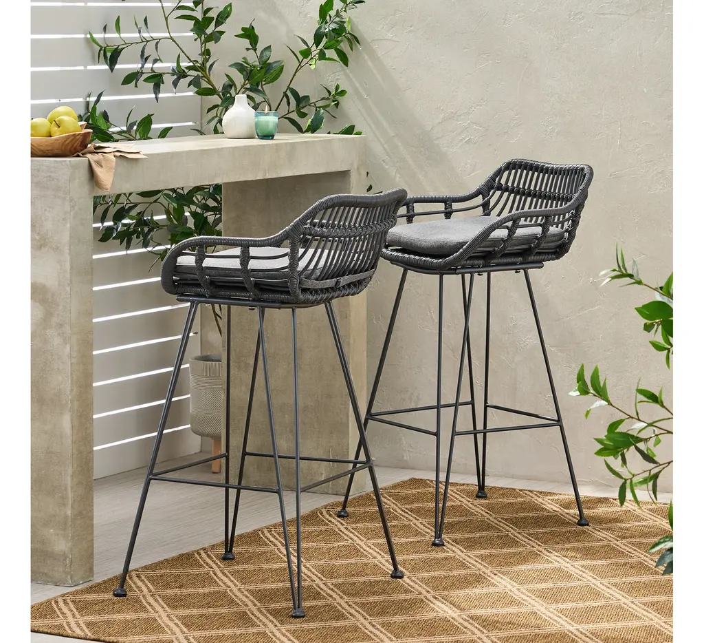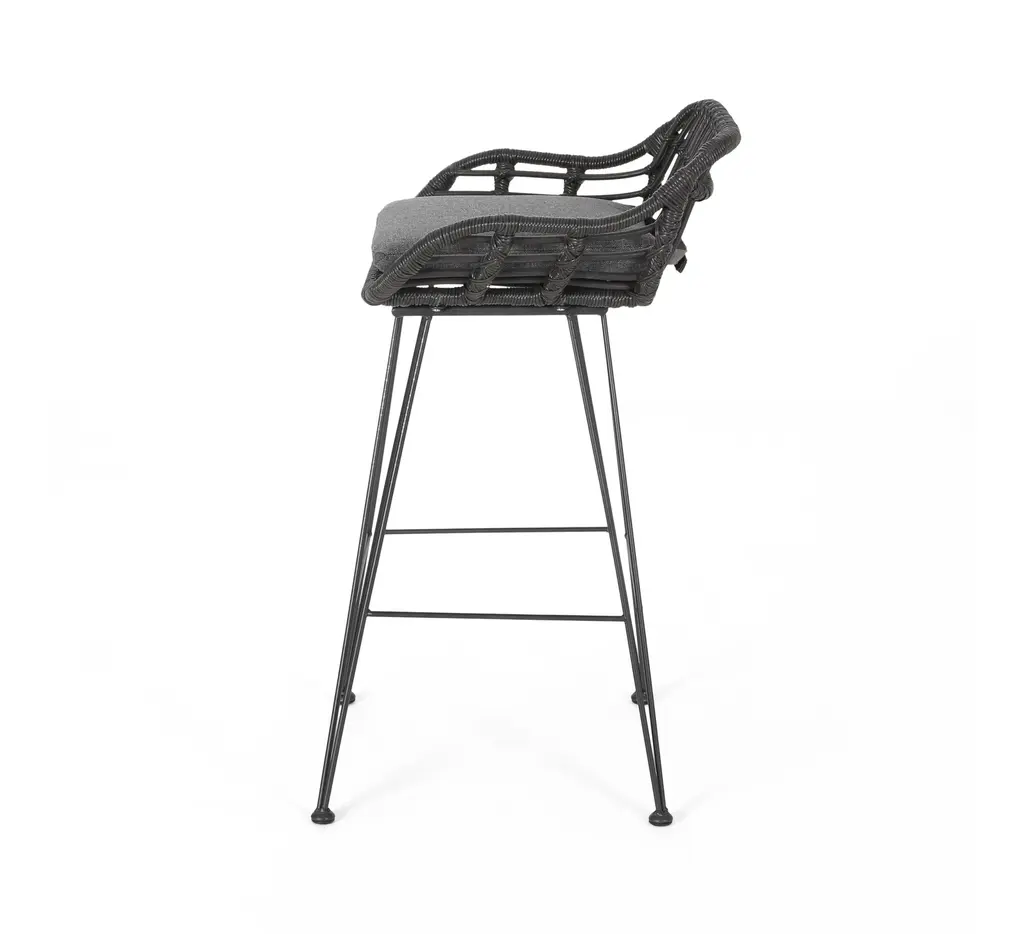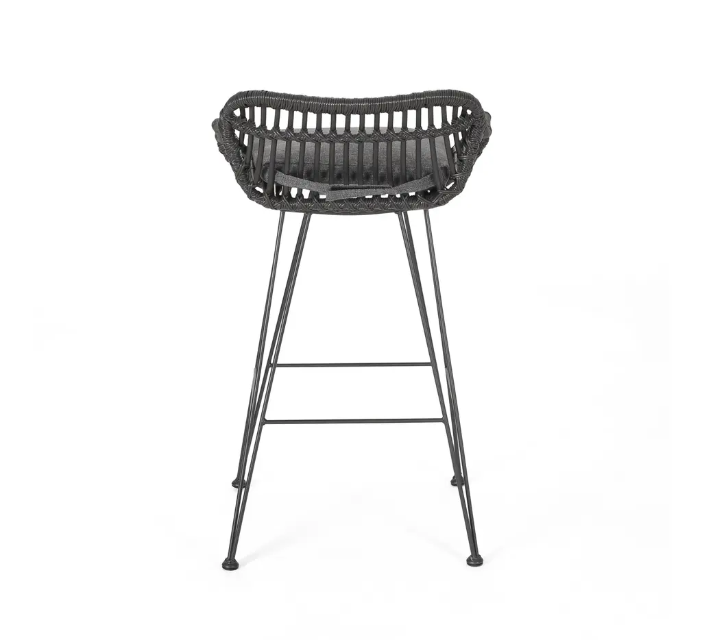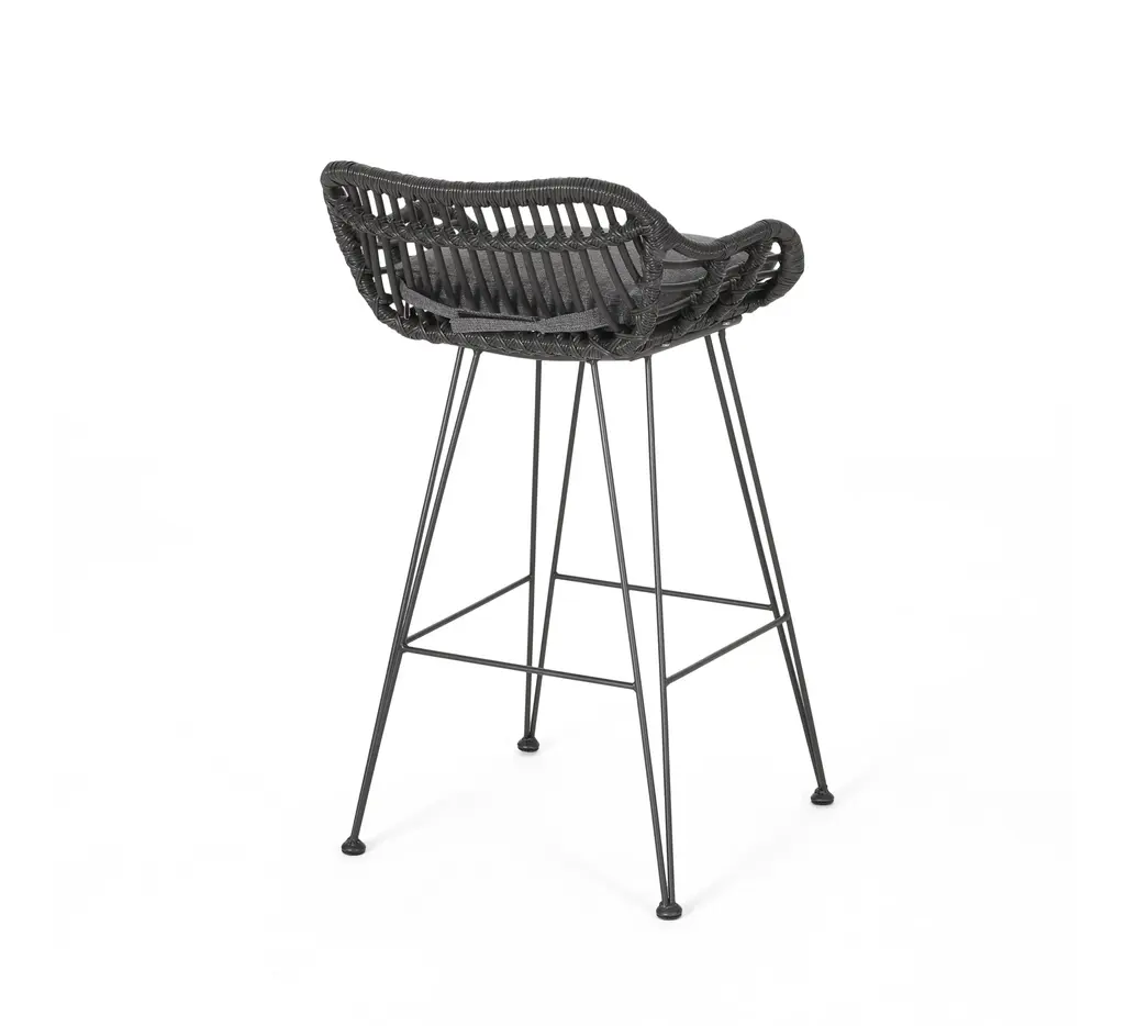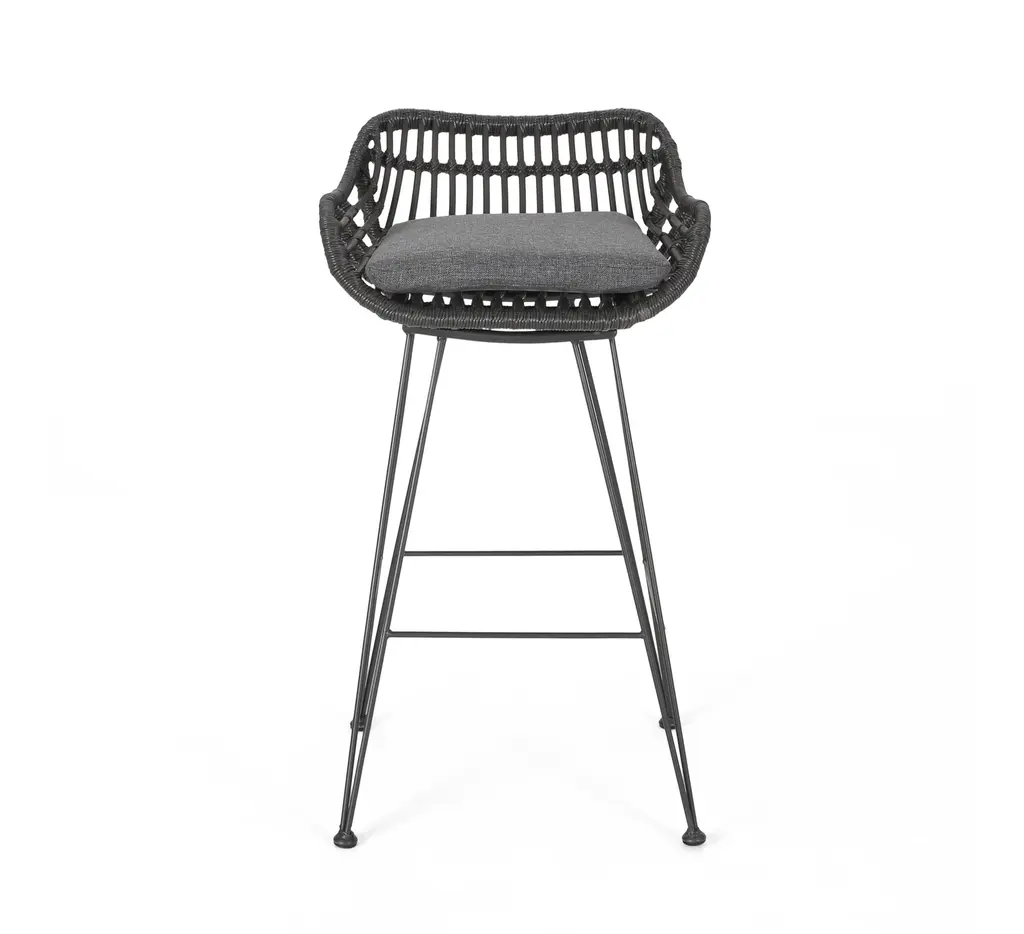 Give your outdoor space an exclusive feel with a sensible and stylish bar stool set. Featuring a delightful hand-wrapped look, our bar stool set provides a timeless style to your home while providing ultimate comfort. This set of stools consists of a metal frame and rattan material, bringing a modern twist to a classic look that is ideal for any style of decor. With a thin angled frame, this charming bar stool set also provides a minimalistic yet durable structure that offers a stylish flair to your space.MODERN: With clean lines contrasted perfectly by its round edges, our rattan bar stool is the ideal modern accessory for your outdoor space. Finished with thin angled legs, this stool not only has a sleek, minimalistic look but also provides a stable structure.POLYETHYLENE RATTAN: Featuring a long-lasting woven seat, this style is not only incredibly durable but also provides a versatile appearance. The handcrafted details of this material allow this piece to blend seamlessly with your outdoor decor.WATER-RESISTANT CUSHIONS: Our cushions are covered with a non-porous material that makes cleaning any spill a breeze. Please note that these cushions are water-resistant and not waterproof. Please do not submerge in water.BARSTOOL HEIGHT: This stool has a seat height of 28.75 inches, making this perfect for a backyard bar or a bistro bar set.ASSEMBLY REQUIRED: Some assembly is required for this set. All of the instructions and tools needed for assembly are included. This comes as a set of two.Includes: Two (2) BarstoolsMaterial: Faux RattanFrame Material: IronCushion Material: Water Resistant FabricCushion Composition: 100% PolyesterFinish: GrayFrame Finish: BlackCushion Color: Dark GrayHand-Crafted DetailsAssembly RequiredDimensions: 23.25 inches deep x 22.00 inches wide x 38.00 inches highSeat Dimensions: 15.50 inches deep x 16.00 inches wide x 30.00 inches highFootrail Height: 12.00 inches