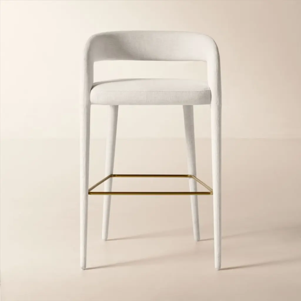 Designed by fashion-designer-turned-home-designer Brett Beldock, this sculptural bar stool brings sophistication to any space. Updating the traditional barrel chair design, this fresh take is more open and lighter in feeling. Upholstered in white performance fabric, bar stool stands up to dirt and stains. CB2 exclusive.