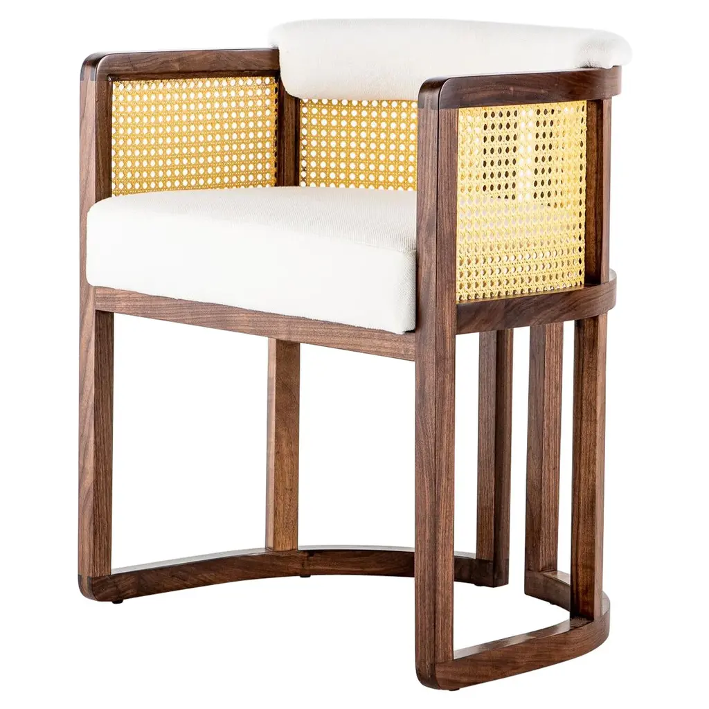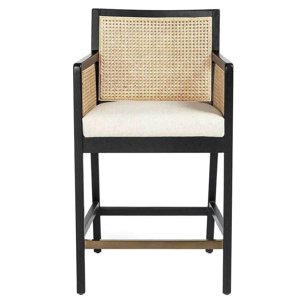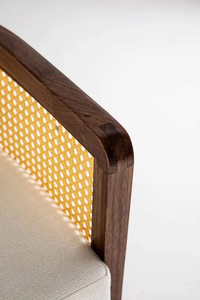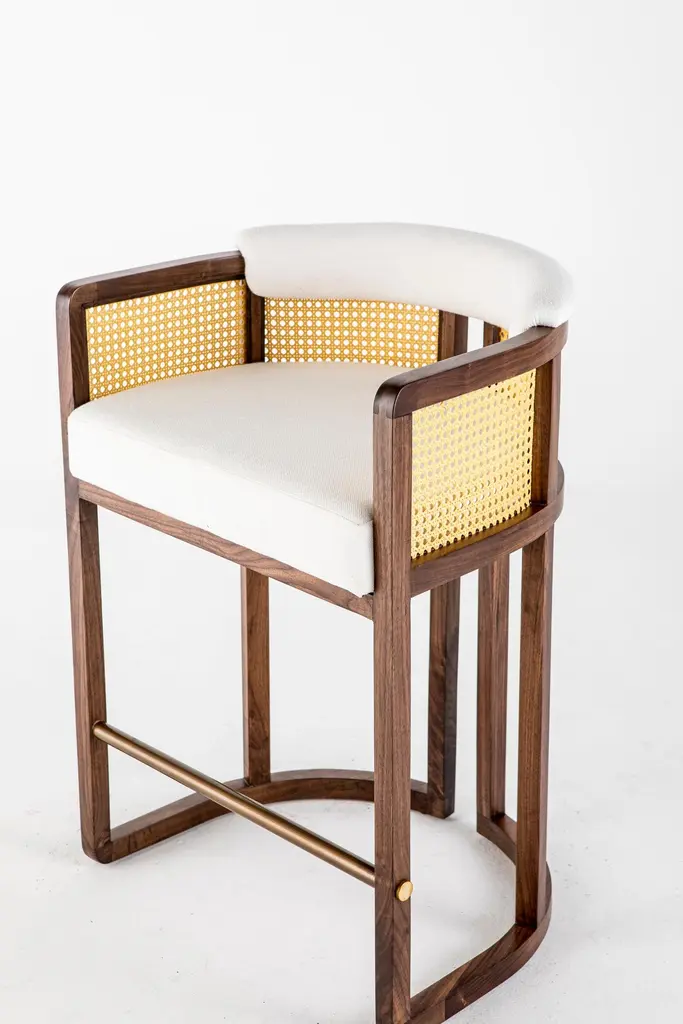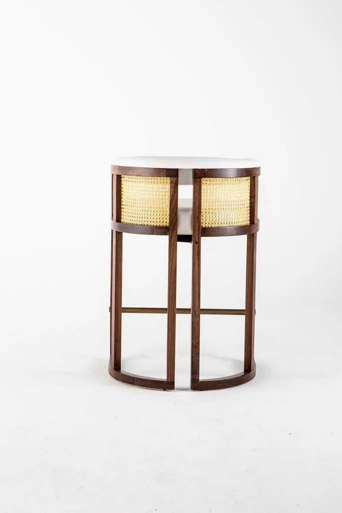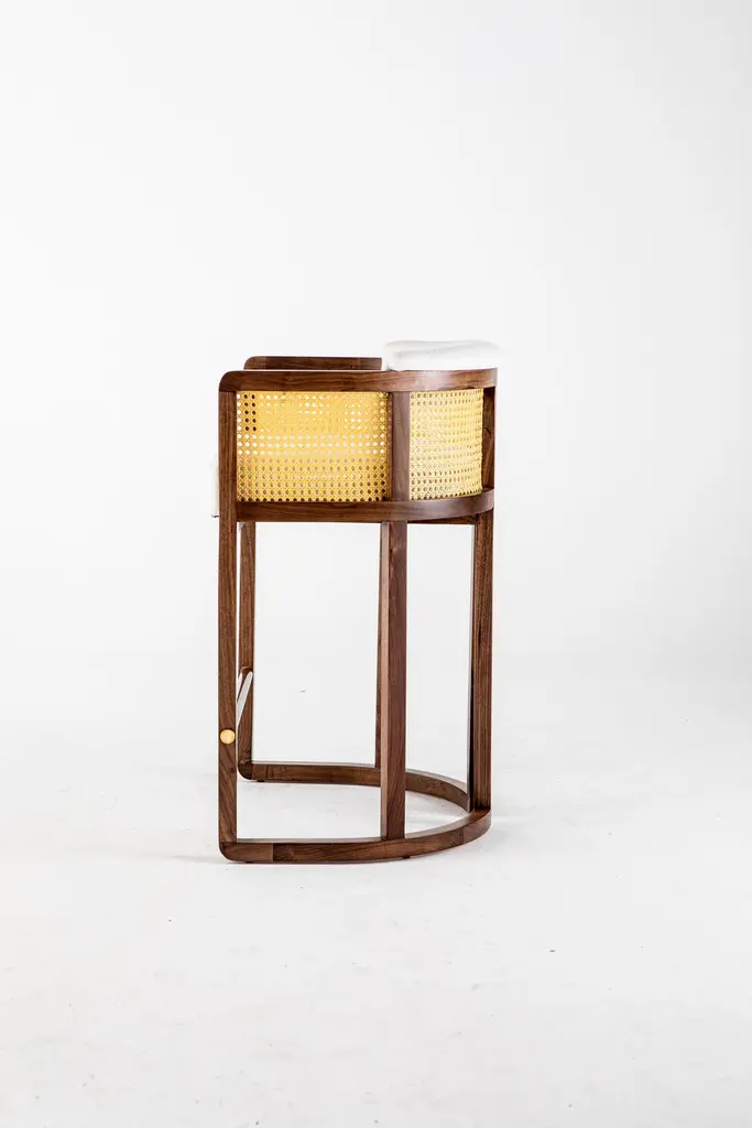 Livingston bar stool by Egg Designs.Dimensions: 62 L X 49 D X 90 H cmMaterials: walnut timber, synthetic rattan, linen upholstery.Founded by South Africans and life partners, Greg and Roche Dry - Egg is a unique perspective in contemporary furniture inspired with a soul that’s deeply rooted in the African continent.We believe Egg has a distinctive African design dialect.We dream that our products will not only be judged by their function and form, but by the beauty of their eternal narrative.In everything we create we must answer the question, “Is it Egg enough?”Egg, is a spirited blend of heritage, passion, meaning and African soul. It stands the test of time. It’s curiosities that make you smile. It’s love and truth that can be seen from afar and equally found in the minutest details. That’s why every piece we craft comes from Africa and carries within it a part of the African soul. We’re a melting pot of tribal craft, African heritage and modern luxurious expression.“If it’s not Egg enough, it’s not worth doing!”We have widened the prism of contemporary African design in Modern Antiques, high-end Furniture, lighting and custom interiors inspired by an African provenance for a modern, international customer.