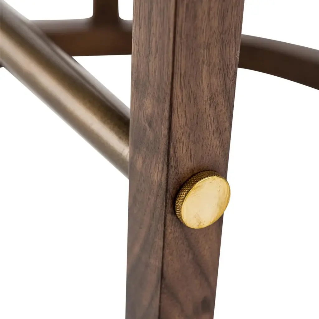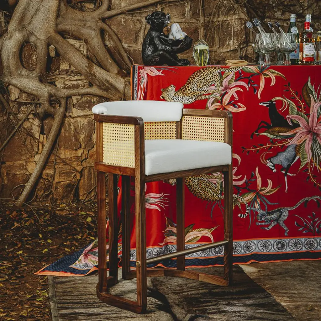 Livingston Bar/counter stool - Tala Collection by Egg Designs The Livingston Barstool is a standout piece from the Tala collection, meticulously designed by Egg Designs. This modern barstool combines timeless craftsmanship with contemporary elegance, making it a versatile choice for various interiors. Featuring a solid Walnut timber frame with an inset of woven mesh rattan, the Livingston Chair exudes natural sophistication. The seat is upholstered in a premium off-white linen fabric, while the finishing touches include solid brass fixings for an added hint of luxury. The Livingston range is perfectly suited to natural, safari, or beach-style interiors, effortlessly complementing warm, earthy aesthetics. Its robust design and refined style also make it an excellent choice for hospitality or restaurant settings, and it is available for production in larger quantities to meet commercial needs. The chair is available in both bar and counter heights. Labeled by Maker