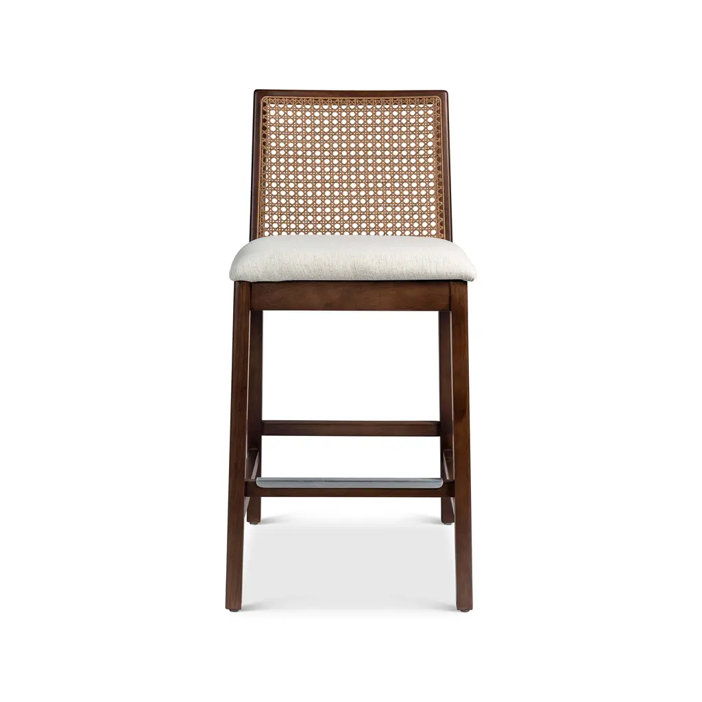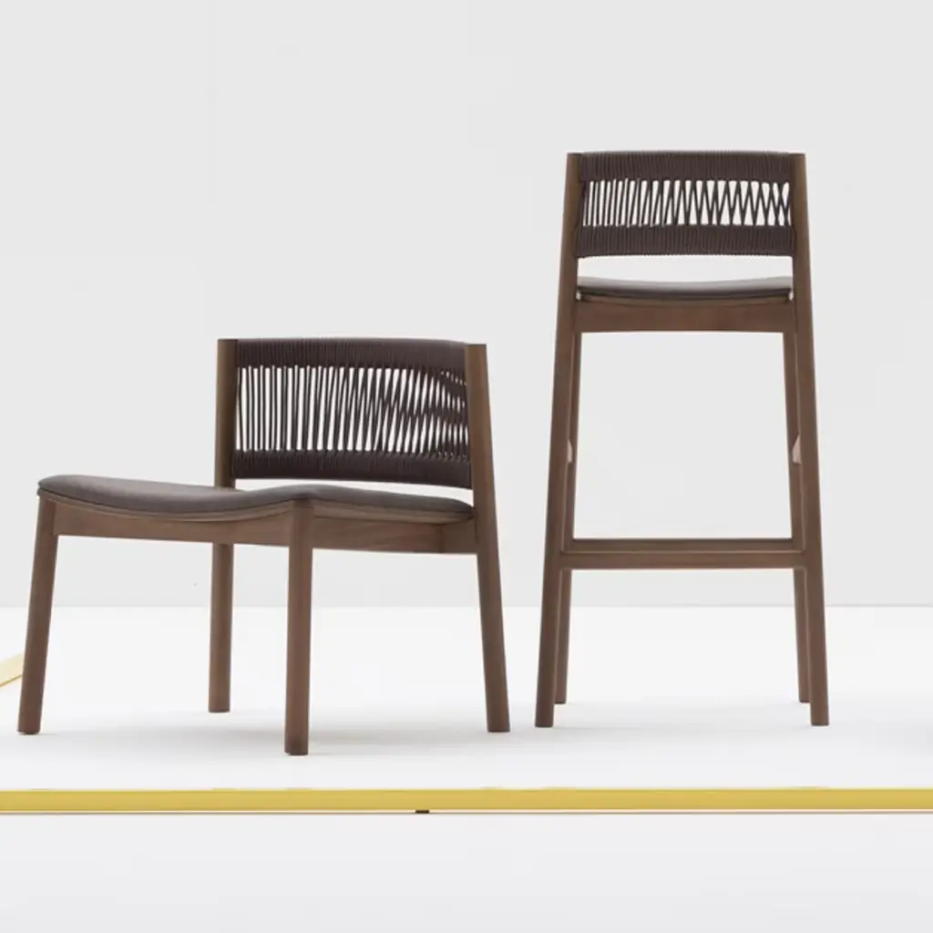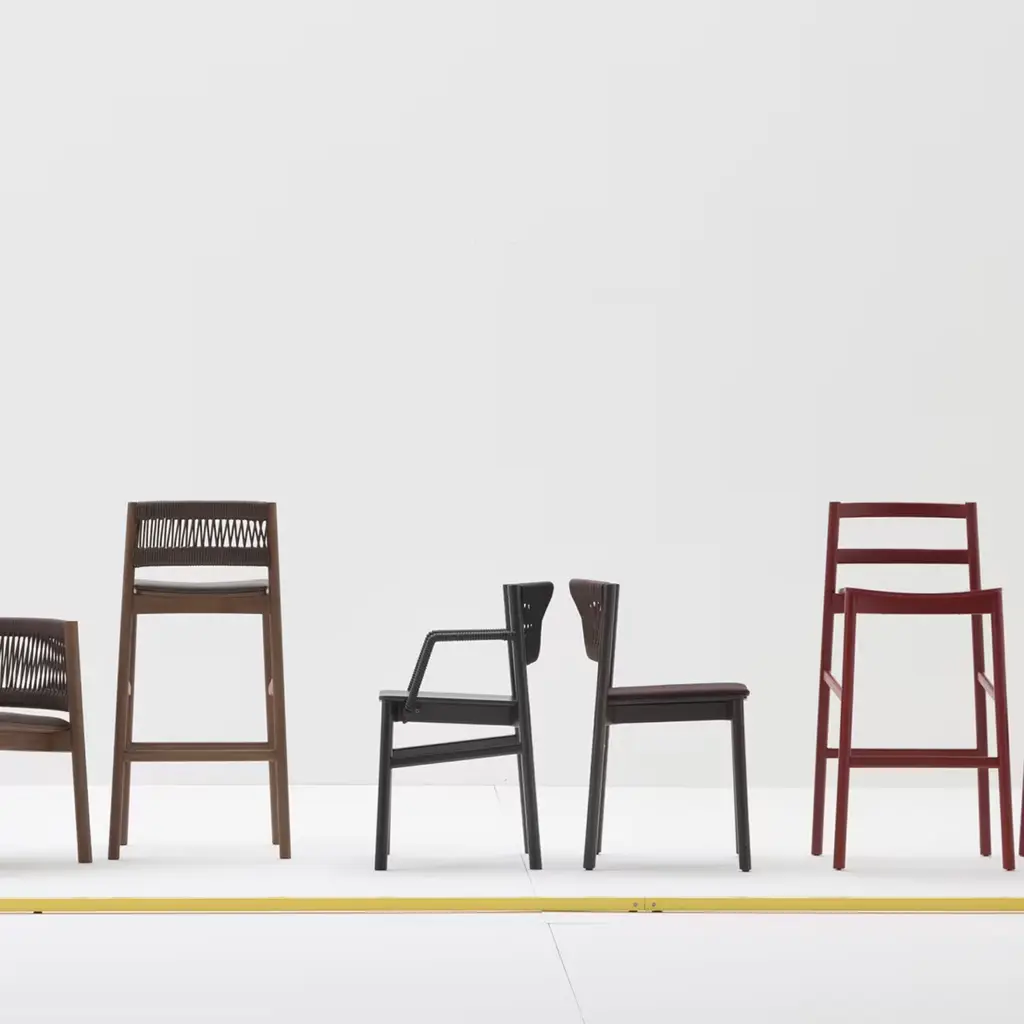 This high beech stool with back represents the sophisticated and meticulous research carried out by Emilio Nanni on the theme of archetypal form, creates a new dimensional relationship, and aims to imbue the collection with a new mood. With a walnut-stained structure and the seat in fabric. Contract and commercial certifications available upon request.