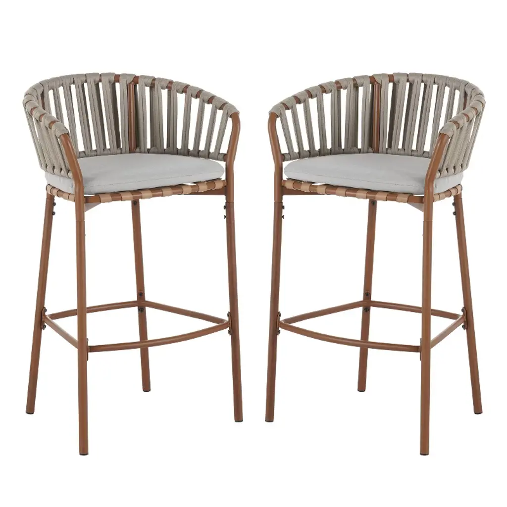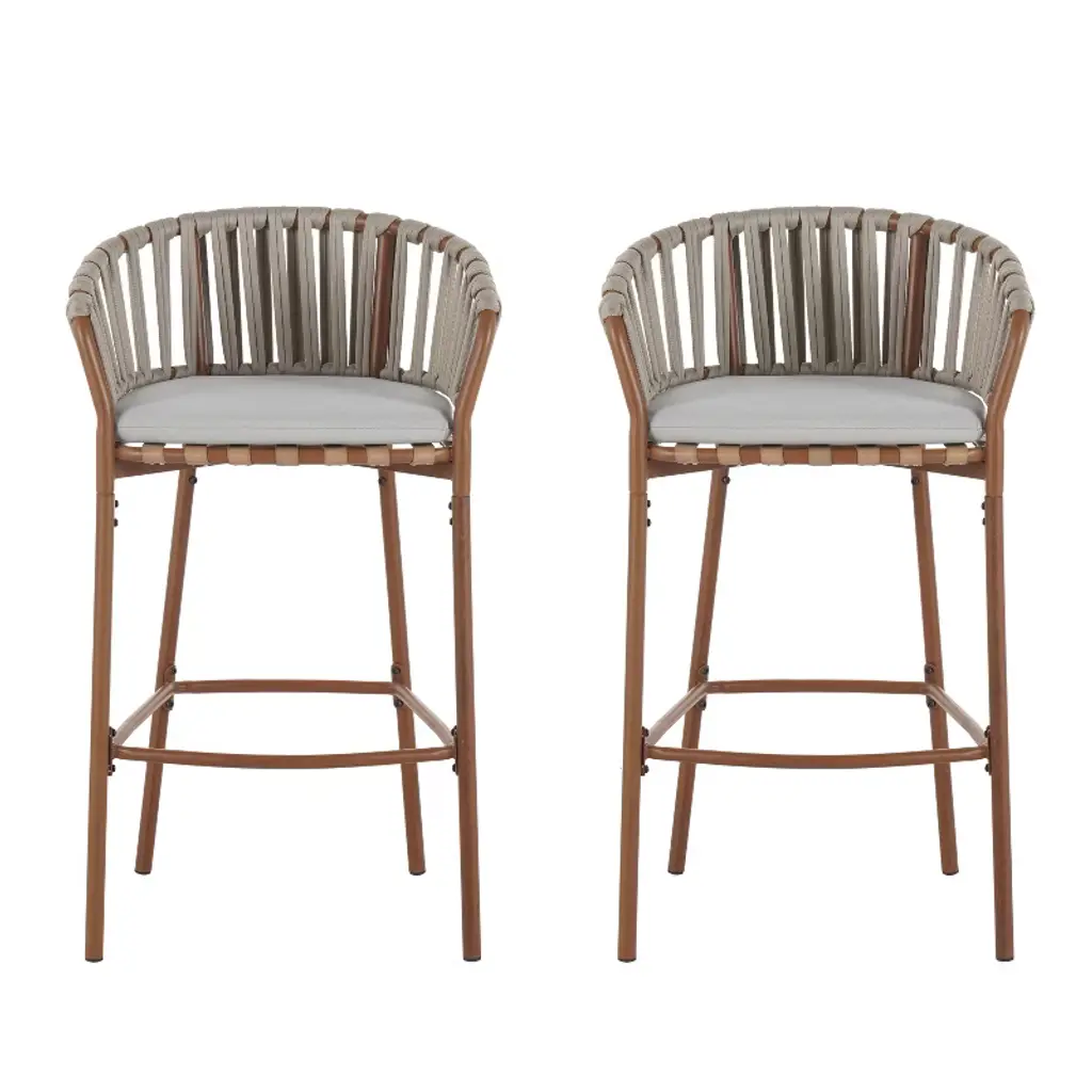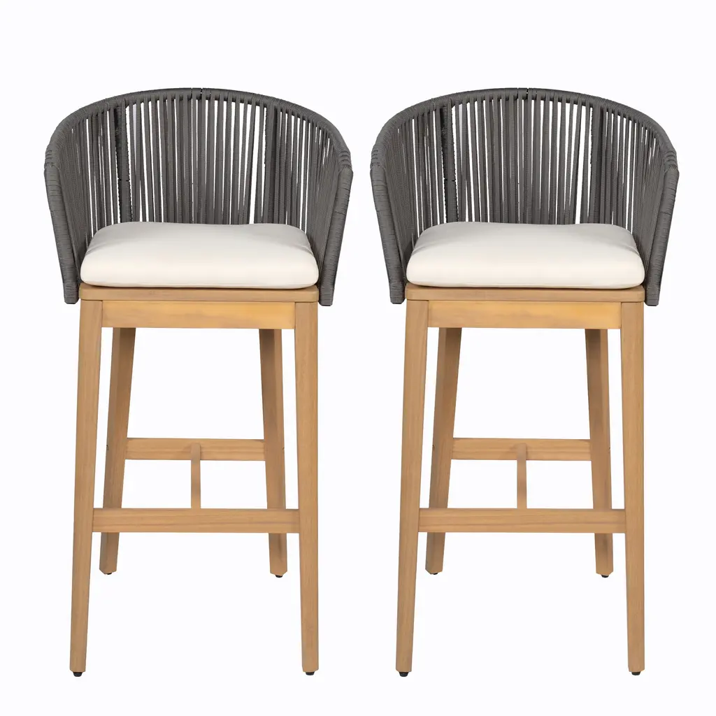 Lodi Outdoor Metal Rope Barstool, Teak Finished Frame And Beige Cushion, Set Of 2