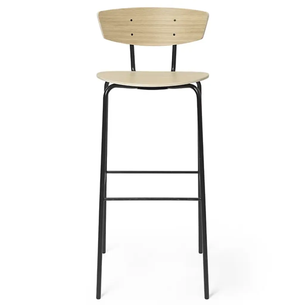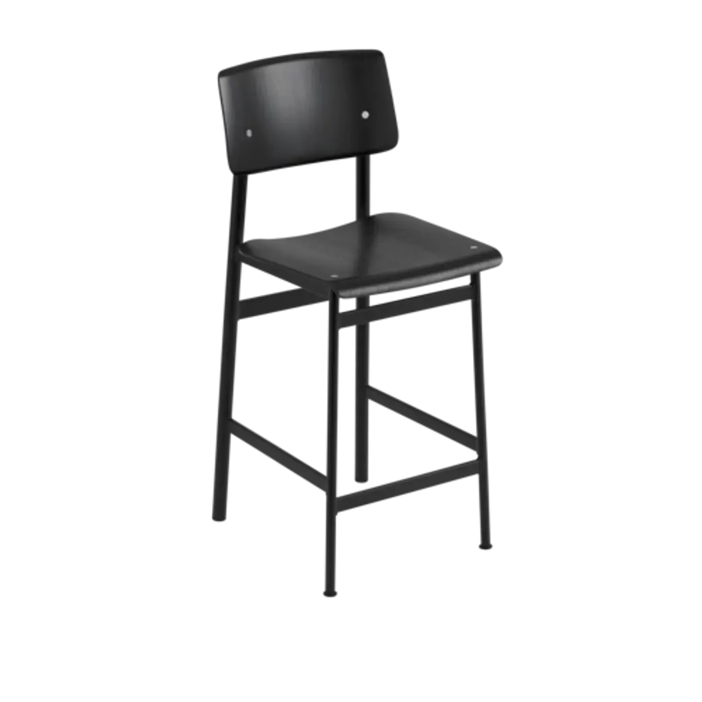 Muuto’s Loft bar stool, designed by Thomas Bentzen, features a straight, lacquered steel frame with a seat and back made of bent veneer. Loft bar chair is a playful junction of opposite elements, where soft and sharp shapes collide, and warm and cold materials meet. The result is a clear and refined design with a unique edge, making Loft a popular chair by kitchen counters at home and bar tables in cafés and restaurants. Loft chairs are available in several different combinations of coatings and wood surfaces.