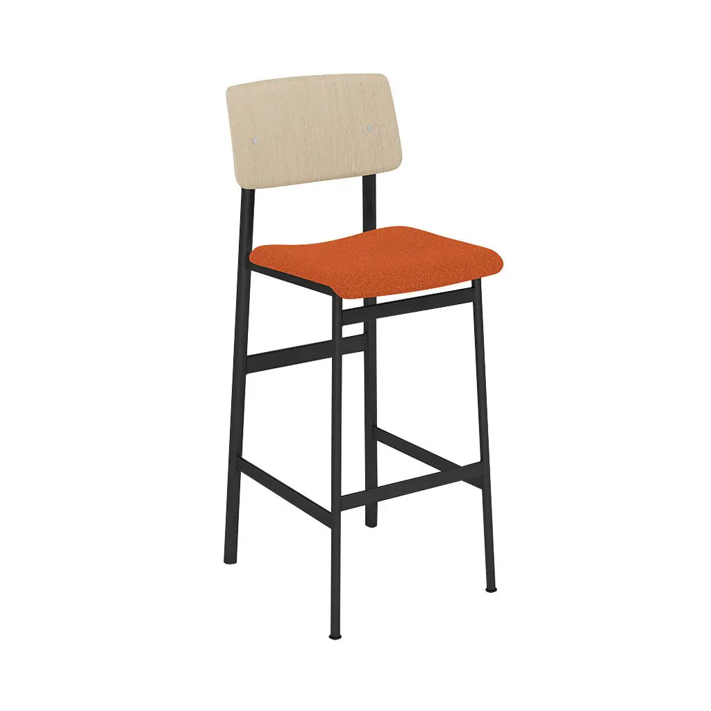 Upholstery-clad cushioning ups the comfort level as well as adding a customizing option to Mutto’s bar stool version of designer Thomas Bentzen's Loft seating. Possessing a generously scaled curved seat and backrest, it still keeps to its minimal footprint with the legs being positioned neatly under the seat. The wood-backed stool with a crisp powder-coated steel frame hews to Scandinavian codes and a range of fine fabric or leather upholstery options allow for a unique look to suit its intended environs.