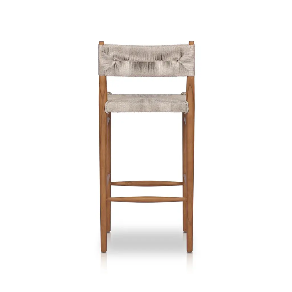 With a beautiful finish, slim, tapered teak frames this woven all-weather wicker bar stool. Cover or store indoors during inclement weather and when not in use. Ships In 10-14 Business Days Ships In 10-14 Business Days All-weather woven wicker seat and back Natural teak frame This image is for illustrative purposes only. The colors shown are accurate within the constraints of lighting, photography, and the color accuracy of your screen.