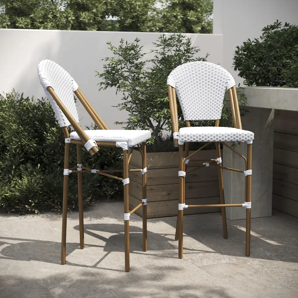 Bring the street vibes of Paris right into your restaurant, bistro, hotel, or backyard patio with this indoor/outdoor commercial grade bistro bar stool. The durable PE rattan back and seat is very comfortable and won't fade when used outdoors. The lightweight, but sturdy, powder coated metal frame will not rust, holds up to 600 lbs. static weight, and features an integrated footrest for added comfort. Recommended stack height for this stool is up to 2 high for storage or transport. For your convenience, this dining stool arrives completely assembled for instant use and features floor protector glides to prevent damage to indoor hard flooring surfaces. This bar height stool easily wipe clean with a damp cloth for quick seating turnaround.