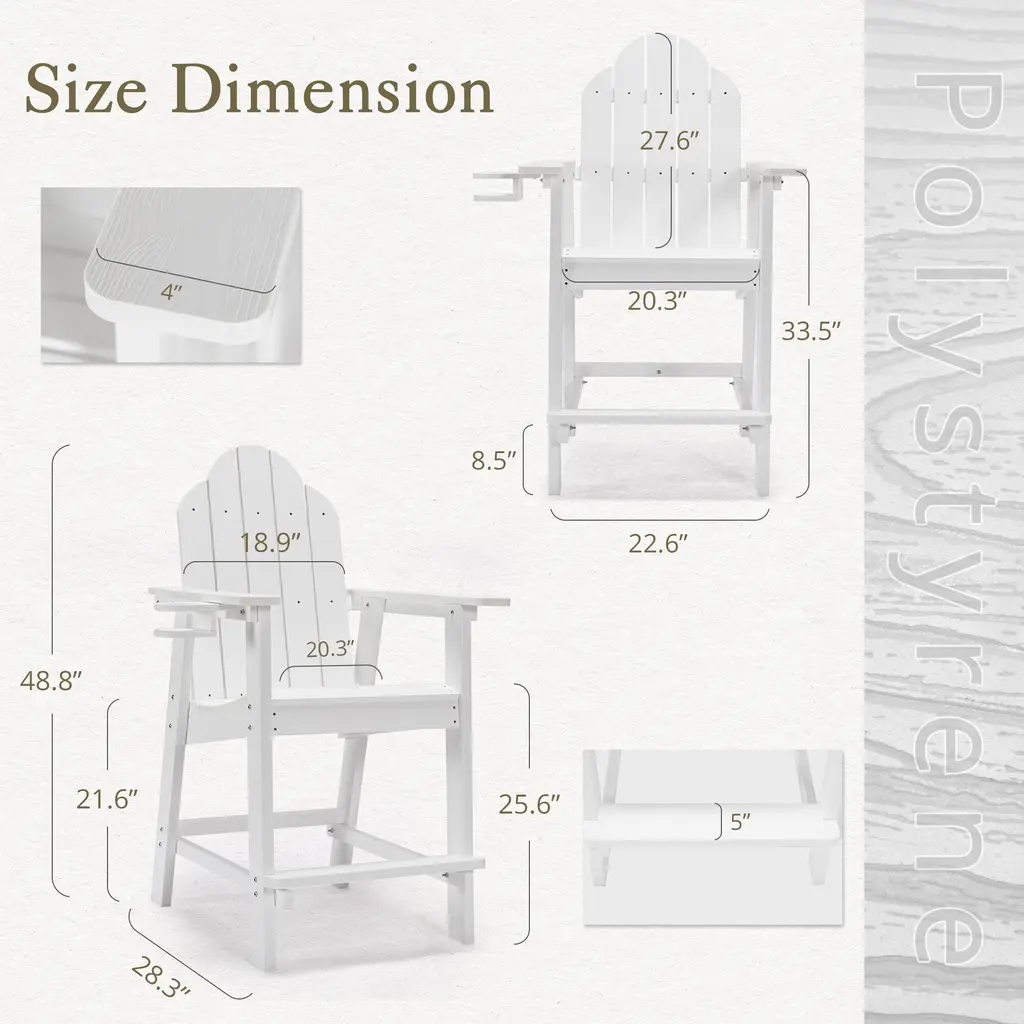 Enhance your outdoor gatherings with our tall Adirondack chairs, a perfect blend of comfort and timeless style. Crafted from durable, low-maintenance HDPS composite, these lifetime counter-height bar stools resist water stains and UV fading. Featuring a high back, armrests, and a footrest, these pool chairs ensure maximum comfort. Ideal for backyards, patios, gardens, and pool areas with high railings, our patio tall dining chairs are also a stylish and functional addition to your dining room. Transform your space with this versatile and elegant piece. Features: Constructed of HDPS composite material,requires no staining, waterproofing, or similar maintenance This pool chair mimics real wood and has a solid, heavy-duty construction to withstand the elements Bar Height Adirondack Chair Dimensions: 22.6 in.W x 20.3 in.D x 48.8 in.H, Seat: 20.3 in.W x 20.3 in.D, Weight Capacity: 350 lbs. Slatted design facilitates rainwater shedding, with sturdy armrests and ample footrests for extra comfort Classic color fits any setting, making the balcony chair ideal for enjoying leisure time on your balcony, deck, garden, or poolside Available in 5 colors: Black, Gray, Blue, Brown, and White, suitable for any indoor and outdoor style Easy to clean with soap and water compared to metal or wooden chairs Easy assembly with detailed instructions and necessary hardware
