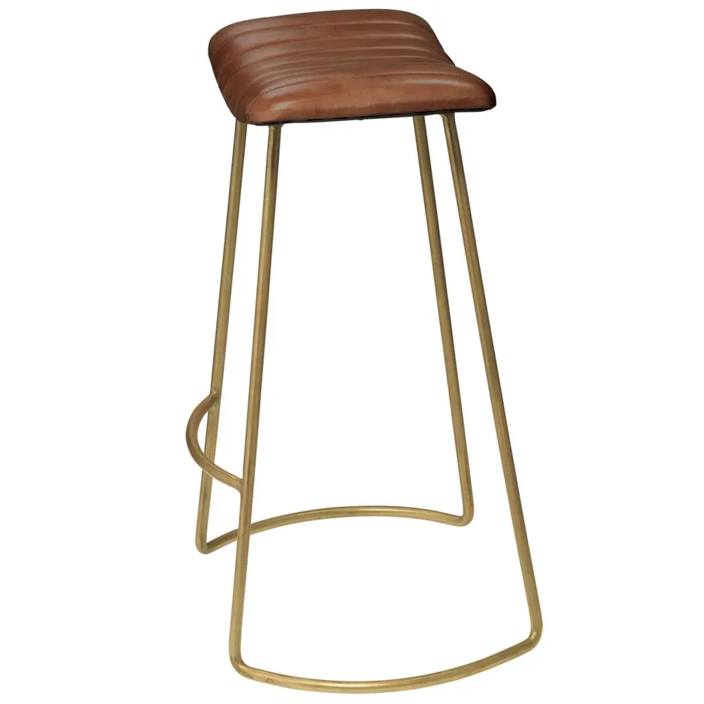 Sleek and sophisticated, this barstool pairs a golden iron frame with a gently contoured seat upholstered in channel-stitched leather. Foam padding and a kickplate provide lasting comfort and support.