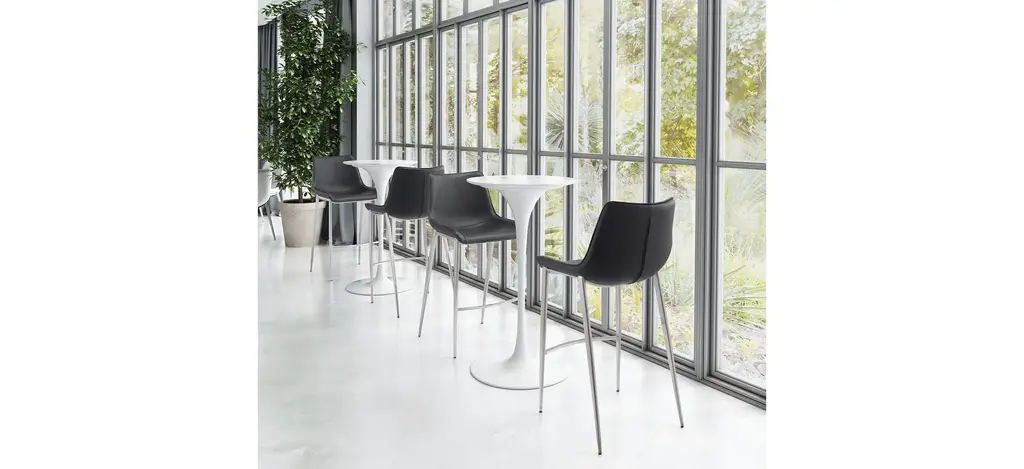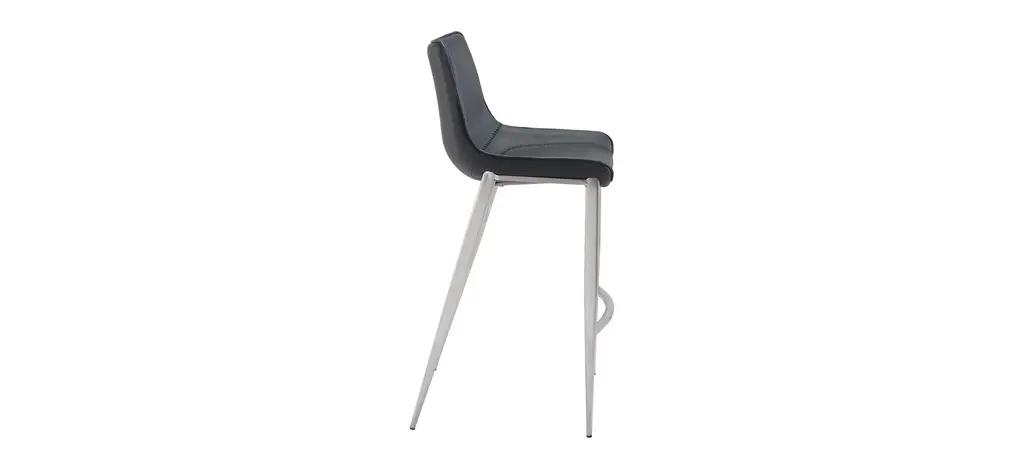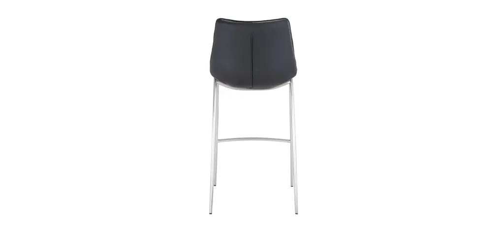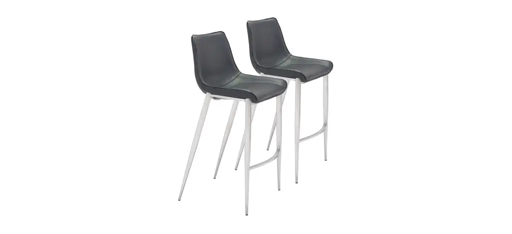 The Magnus bar stool: set of 2 with its slim profile pulls up perfectly to the bar. Its super comfortable curved seat is covered in faux leather with dramatic stitching.