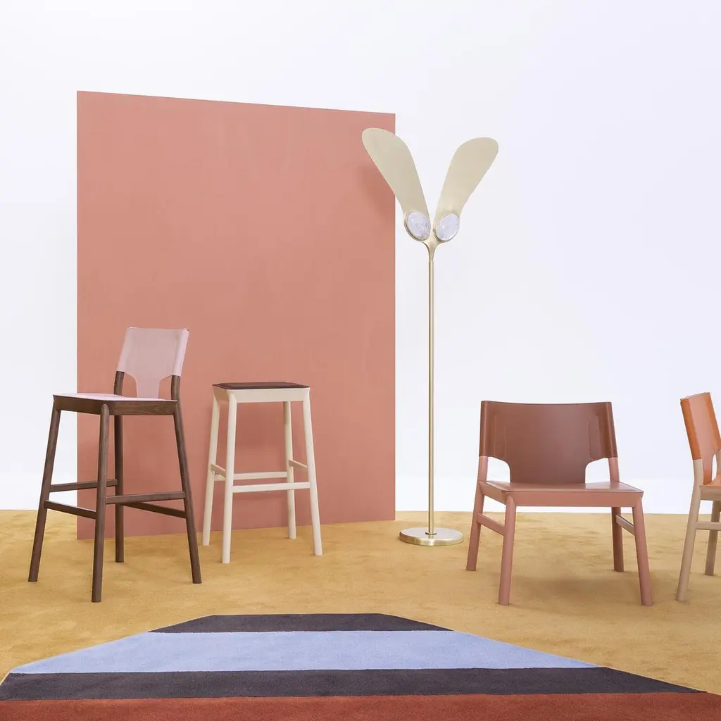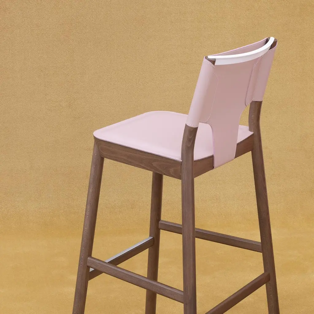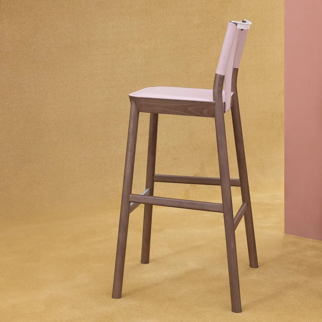 Designed by Emilio Nanni, the Marimba stool brings together wood and leather in a happy harmony between stability and agility. In walnut-stained solid beechwood, upholstered in pink leatherette, the stool comes complete with a white steel handle to help you move it.