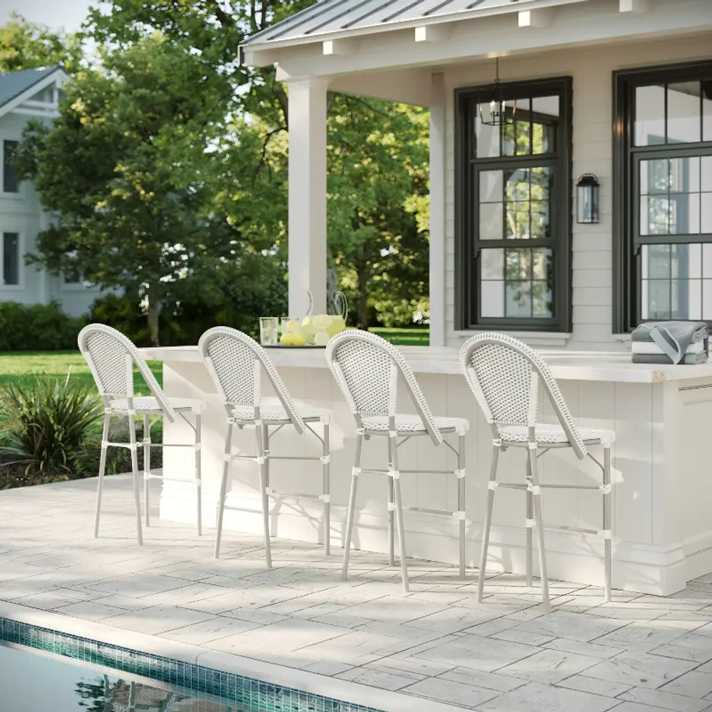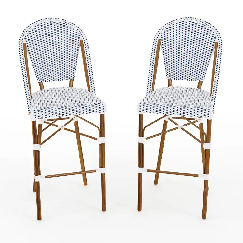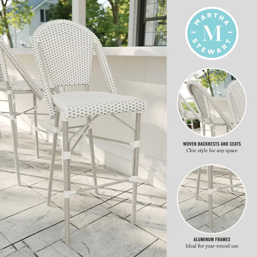 Upgrade your home’s indoor-outdoor retreat with the refreshing style of this set of two Martha Stewart Lily Pond Bistro Bar Stools. The durable, rustproof aluminum frames boast an elegant, hand-brushed, woodgrain finish complemented by seats and backs with a woven rattan pattern. The all-weather construction grants durability and peace of mind, while an efficient design with a recommended stack quantity up to two stools high delivers space-saving convenience and makes it effortless to store multiple stools when not in use. Part of our Lily Pond collection, this set pairs wonderfully with the coordinating dining chairs, counter stools, and dining table, crafting a custom collection that fits your entertaining needs. Arriving with no assembly required and only minimal, hassle-free maintenance, these eye-catching bistro bar stools are a seamless addition to any indoor-outdoor space for everyday use and special occasions.