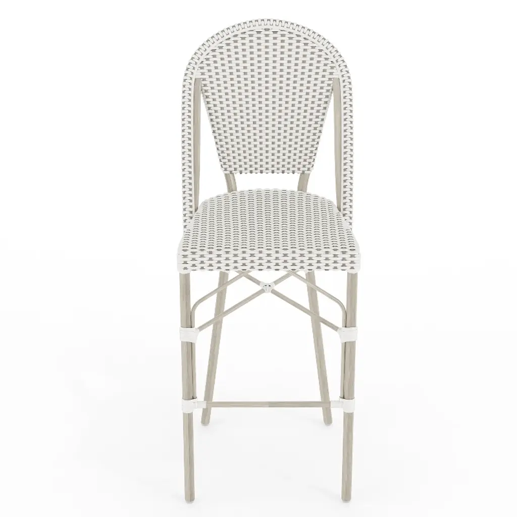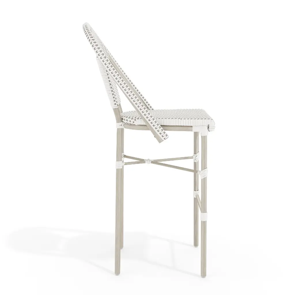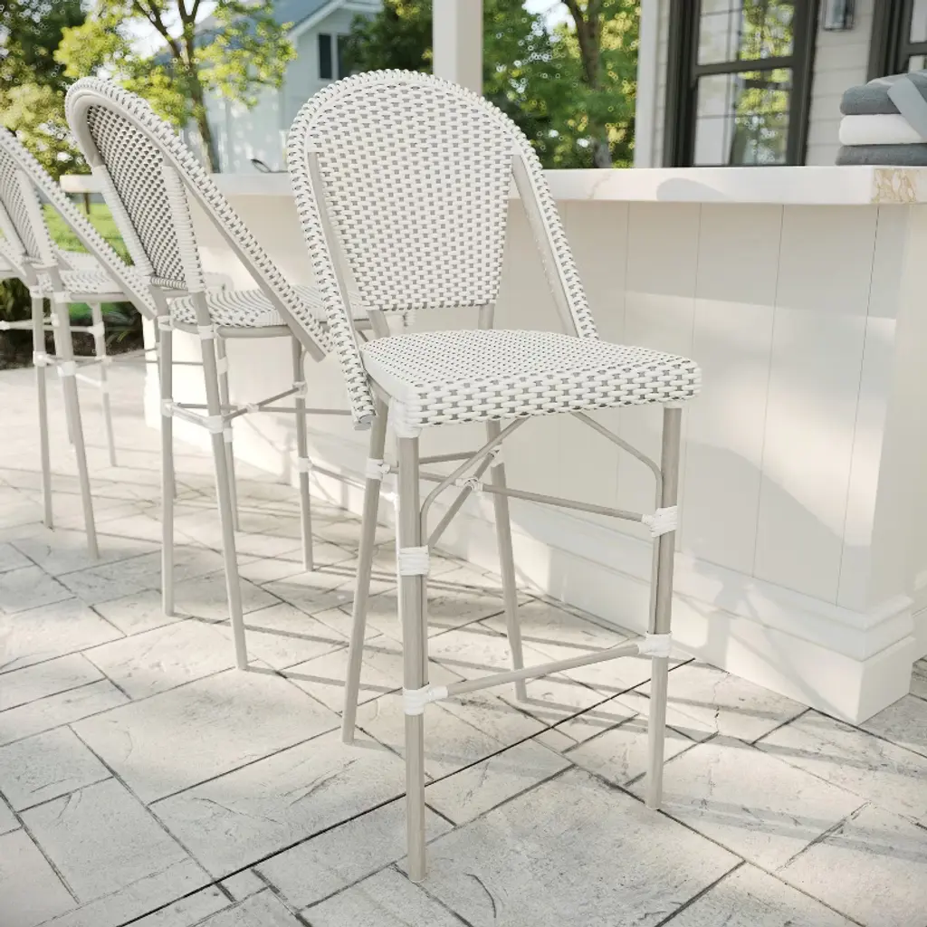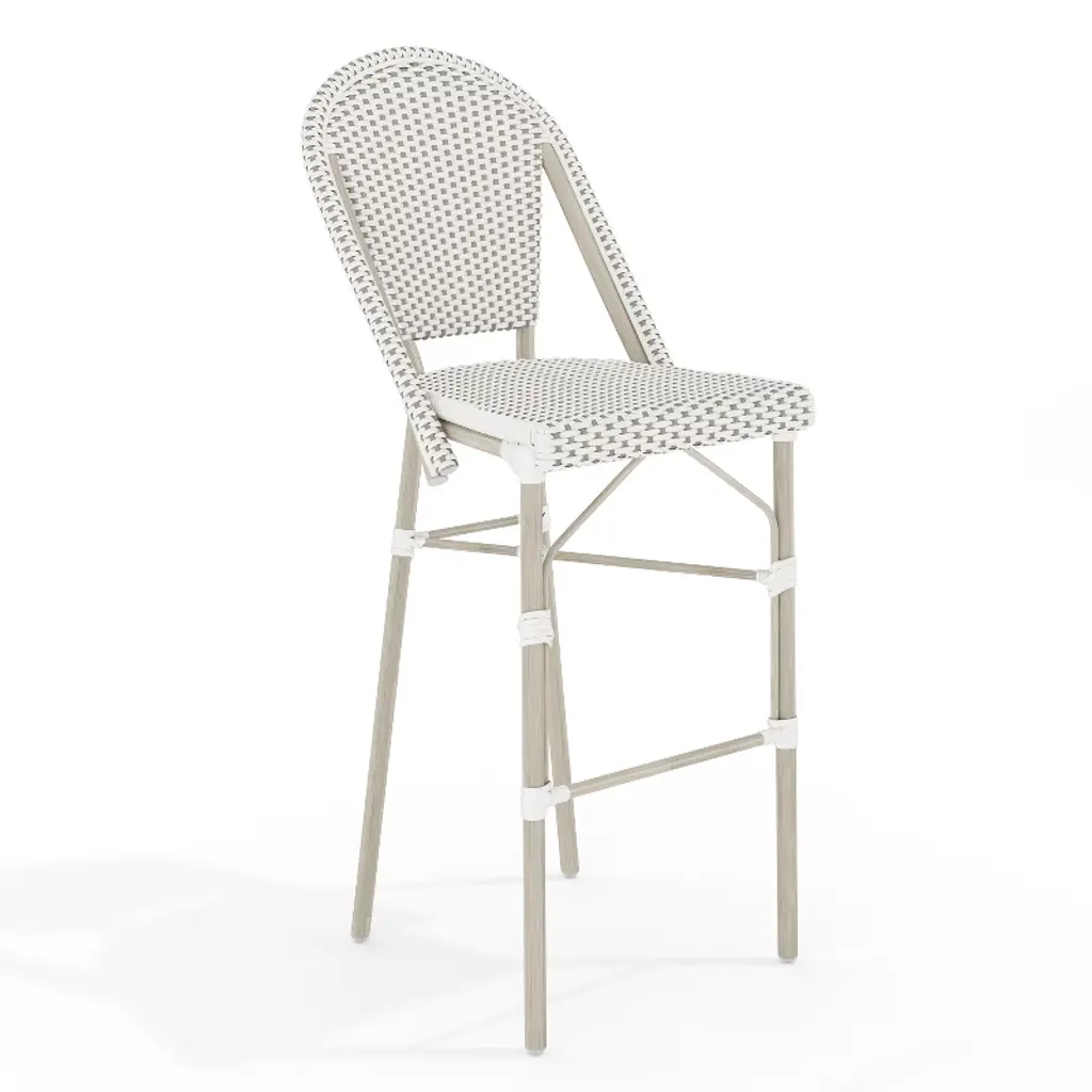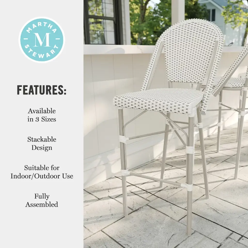 Martha Stewart Lily Pond Indoor-outdoor Stackable Bistro Bar Stool With Gray Woodgrain Aluminum Finish Frame And White/gray Woven Rattan Back And Seat