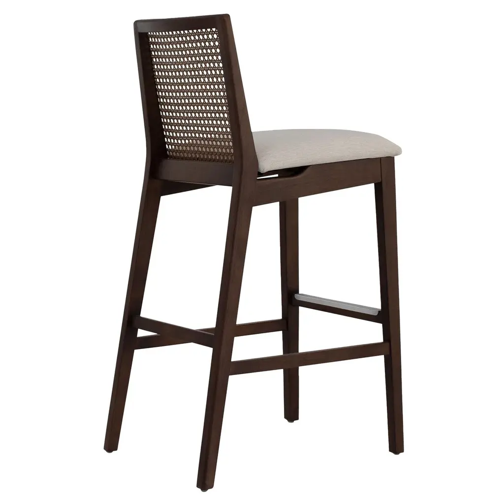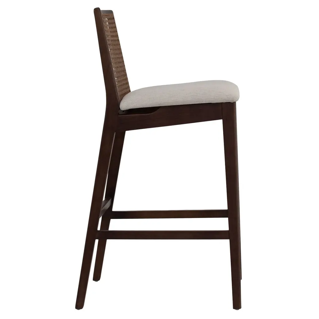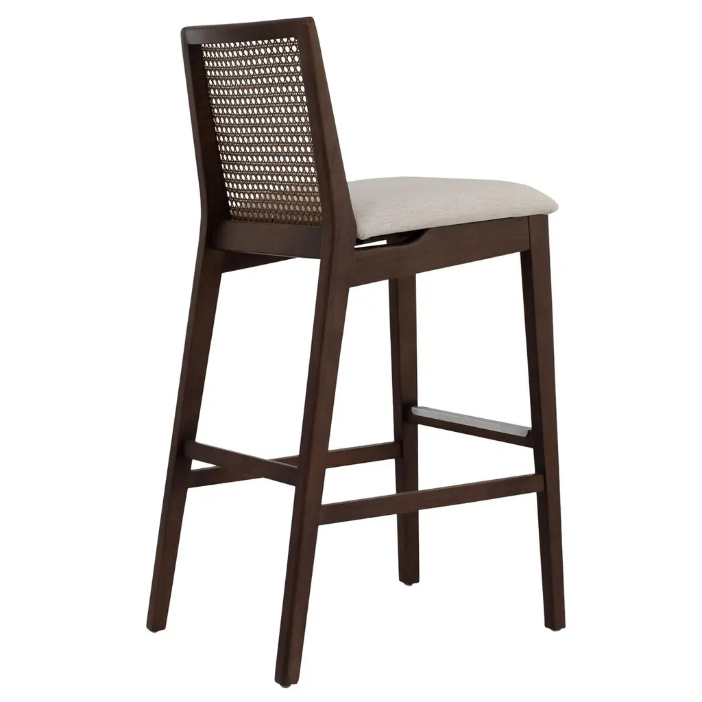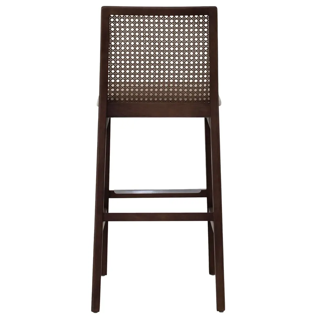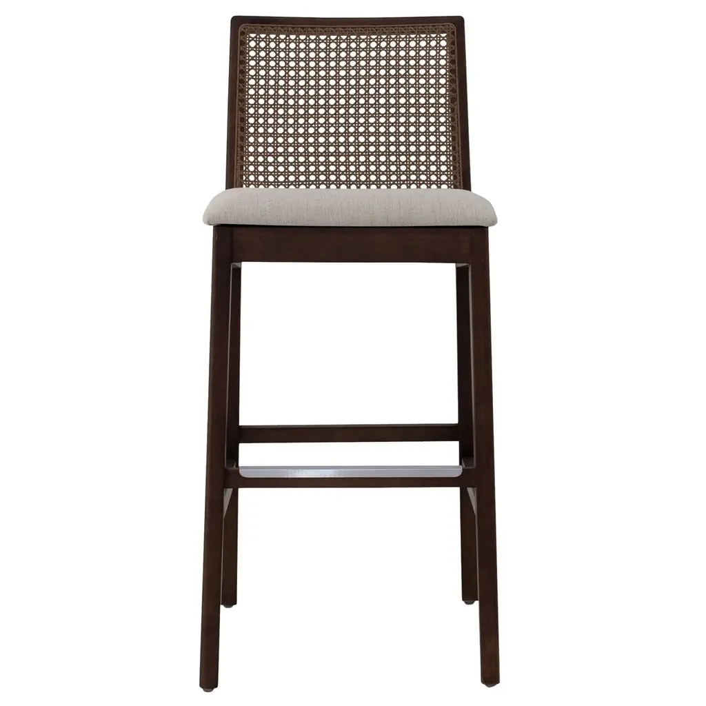This barstool's cane back panel and woven upholstery provide a textural contrast to the sleek frame, which is crafted of durable (and beautiful) tauari wood. The fiber-wrapped high-density foam seat cushioning ensures long-lasting comfort.
