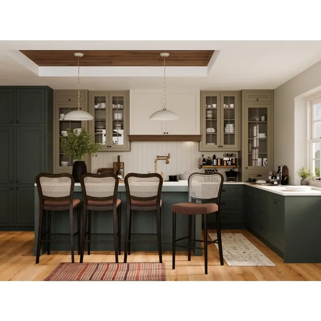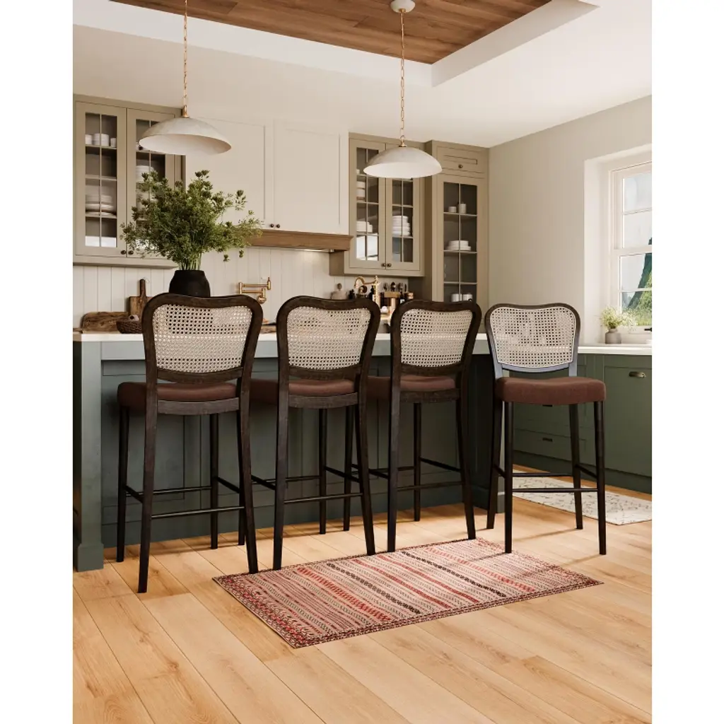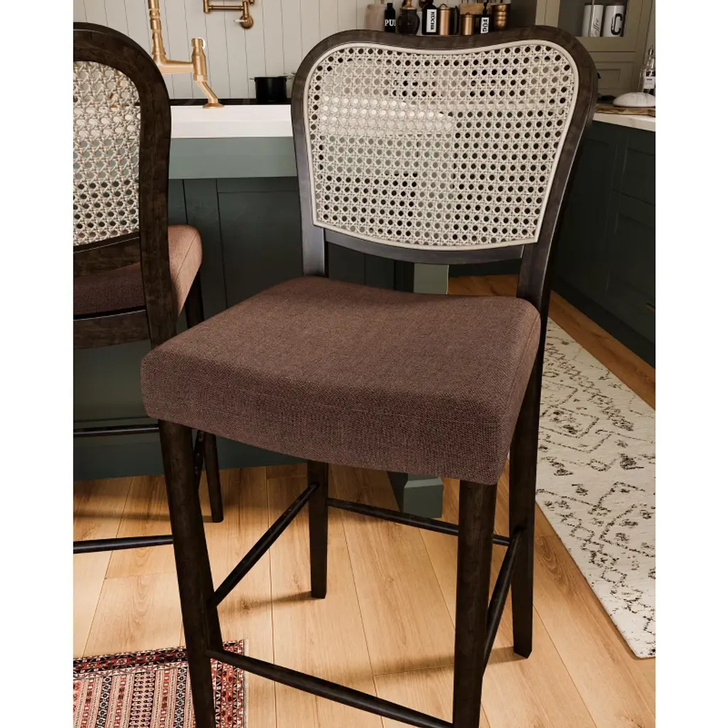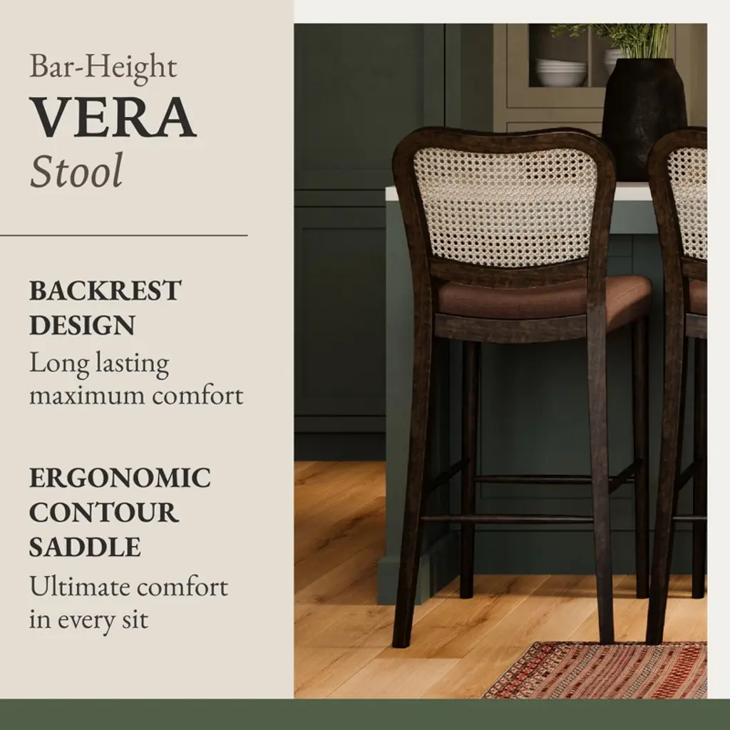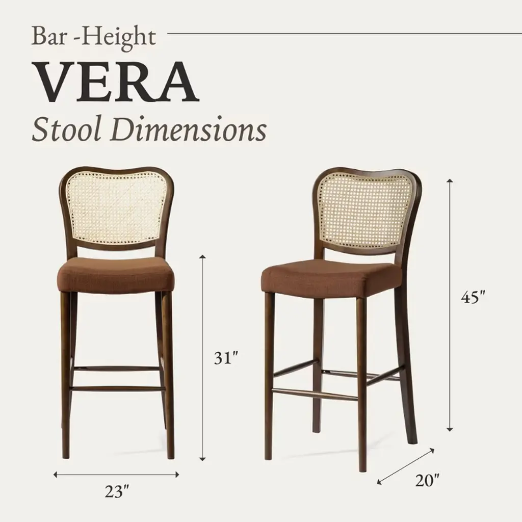 A Statement in Every Seat Not just a stool, a touch of quiet luxury. The Vera Bar Stool blends aged brown wood, woven rattan, and soft upholstery for a design that feels both timeless and modern. Whether it’s the backdrop for morning coffee or lively dinner conversations, Vera brings effortless elegance to your space without demanding attention. Comfort Without Compromise A plush, 3.93” cushion welcomes you in, while the ergonomic backrest and built-in footrest create the perfect balance of support and relaxation. Thoughtfully crafted to stand the test of time, its solid rubberwood frame holds up to 300 lbs, and the linen blend fabric ensures easy upkeep. Designed to fit seamlessly under counters, pubs, and breakfast bars, this bar stool proves that style and function should always go hand in hand.