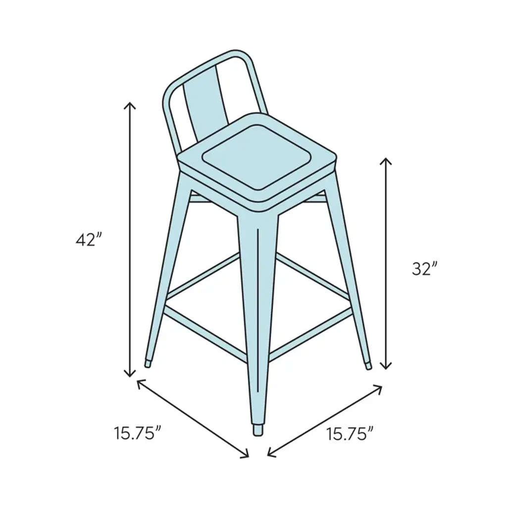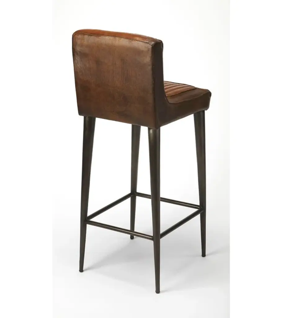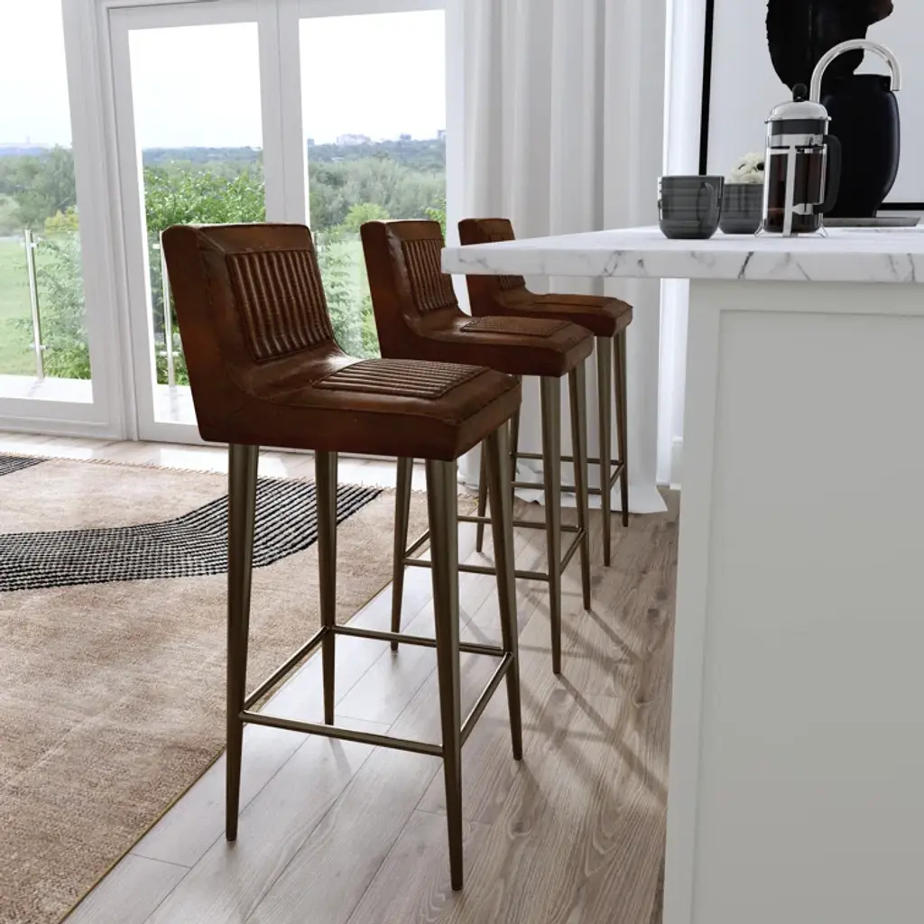 A modern upholstered stool with a 32" seat height, designed to perfectly suit taller bar-height counters or bars. Built with a sturdy iron frame, it features a square seat and low back, supported by slim, tapered legs for a contemporary style with an industrial flair. The seat is padded with foam for comfort and upholstered in genuine leather, adding a refined, sophisticated touch. A durable metal footrest enhances stability, making it ideal for busy households. The low back offers subtle support while maintaining a clean, minimalist design that seamlessly complements modern and open-concept interiors.