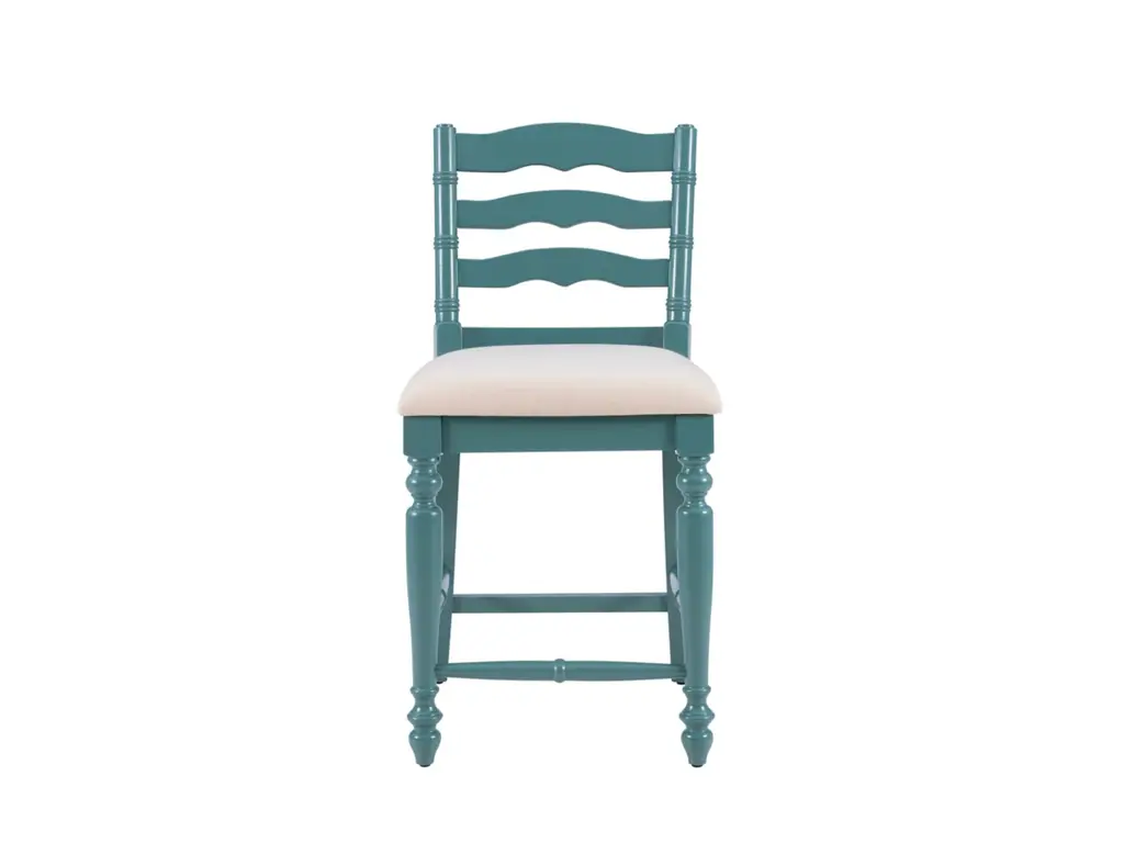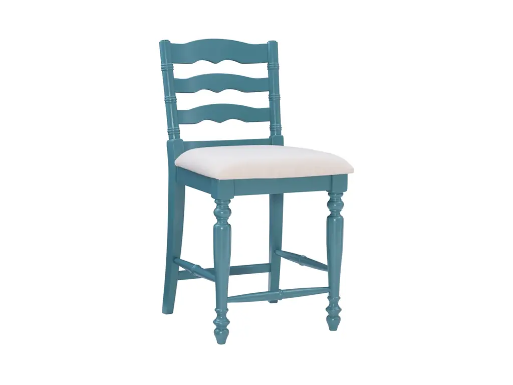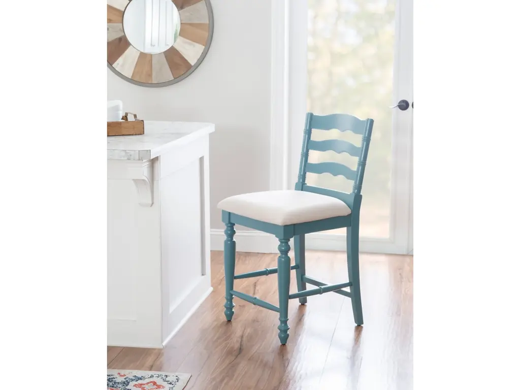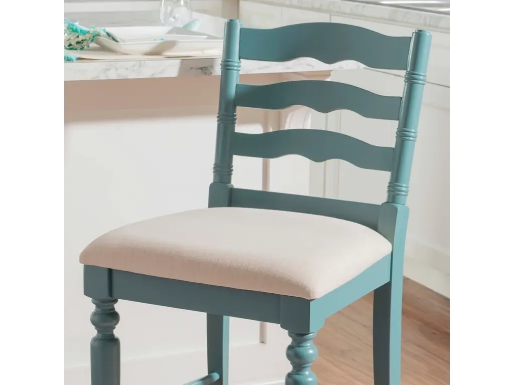 Add a touch of elegance to your home with this classically designed turned wood farmhouse style counter stool. Crafted of solid wood, this beautifully detailed piece features a classic curved ladder back and front turned legs. Painted in a country inspired blue, it also has wood foot rails for comfort and stability. The comfortable foam padded seat is upholstered in a neutral linen weave fabric. Several of these will make your kitchen an inviting place for friends and family to gather for meals and conversation. This stool works best with a counter or tavern table 35" to 39" high.
