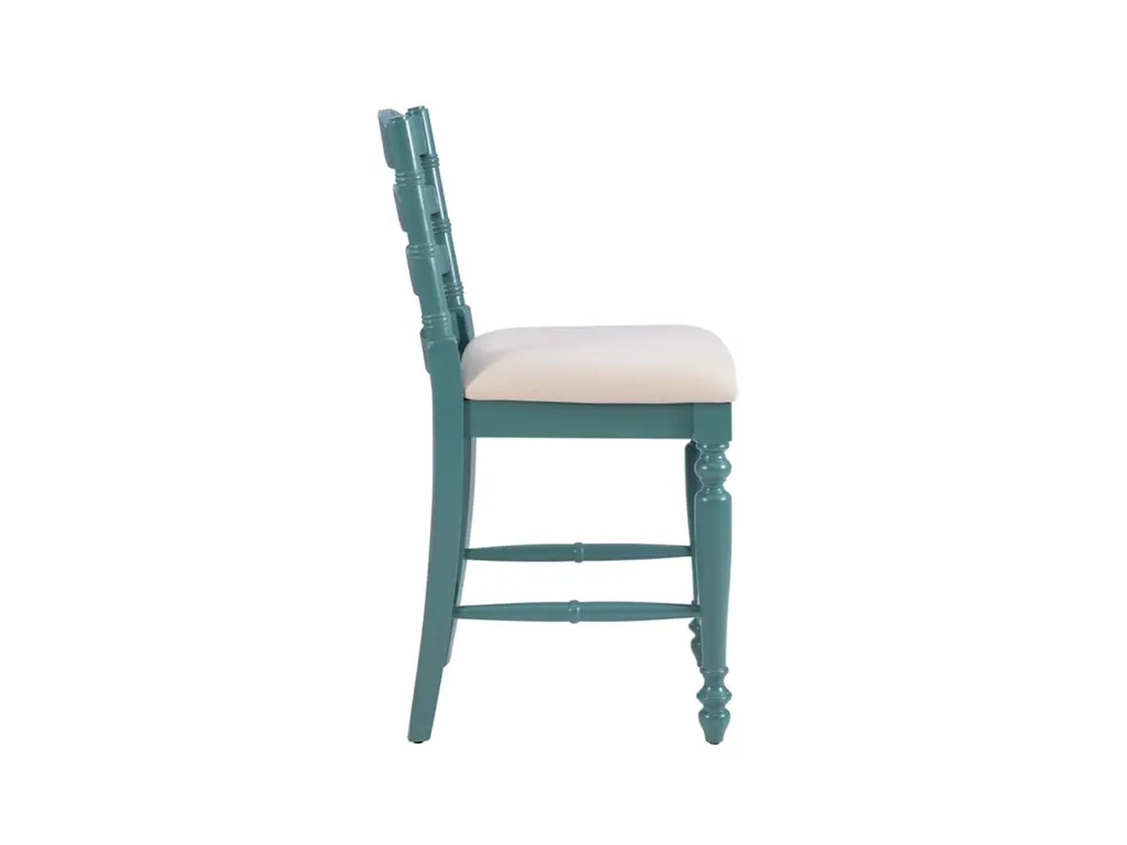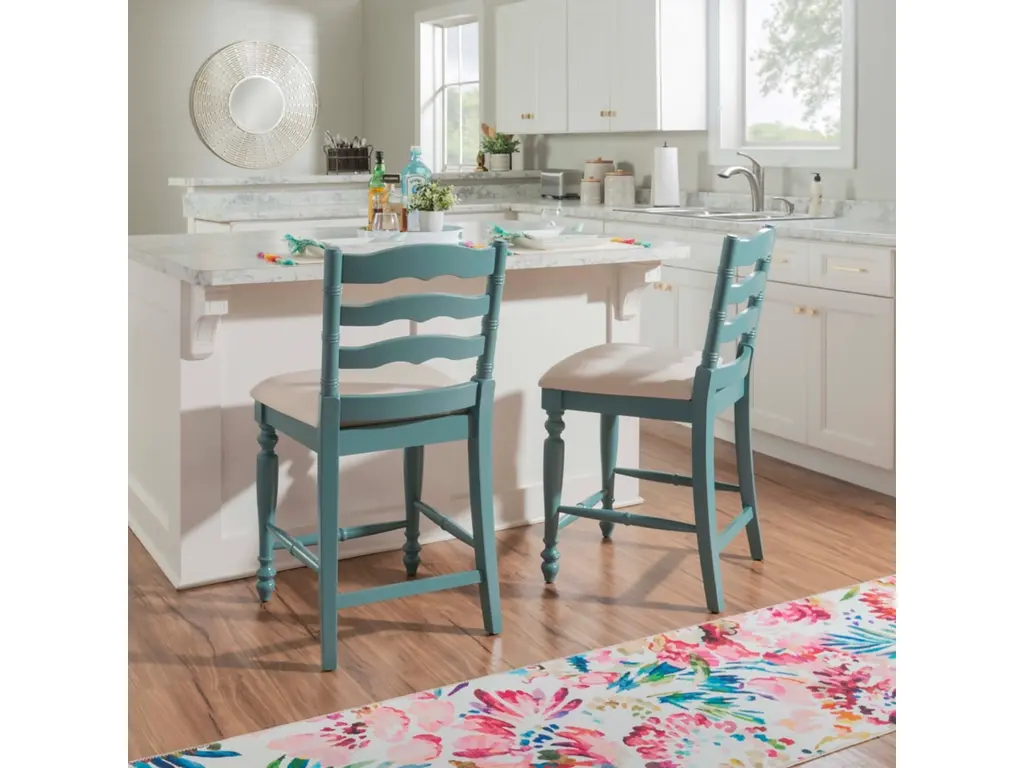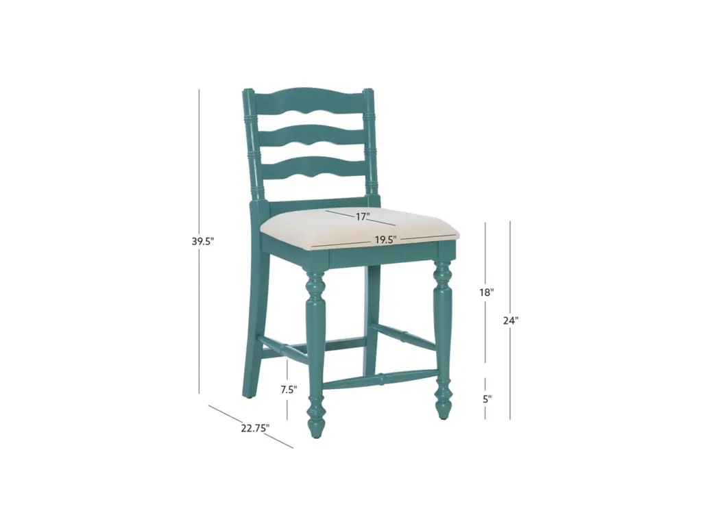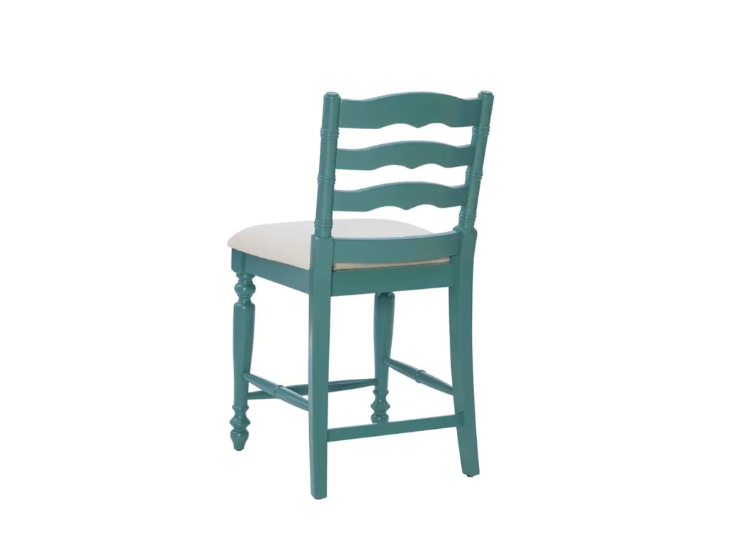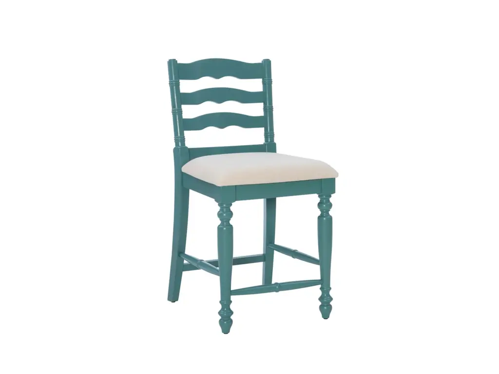 Add a touch of elegance to your home with this classically designed turned wood farmhouse style counter stool. Crafted of solid wood, this beautifully detailed piece features a classic curved ladder back and front turned legs. Painted in a country inspired blue, it also has wood foot rails for comfort and stability. The comfortable foam padded seat is upholstered in a neutral linen weave fabric. Several of these will make your kitchen an inviting place for friends and family to gather for meals and conversation. This stool works best with a counter or tavern table 35" to 39" high.