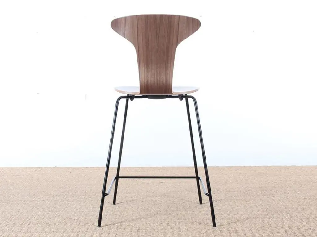 Mid-Century Modern Scandinavian barstool model Munkegaard by Arne Jacobsen. New release. Only in production from 1955 to the late 1960s (and for a brief period in the 1990s), the distinctive chair has its roots in the Munkegaard School, north of Copenhagen, Denmark. The entire school from building to light fixtures was designed by Arne Jacobson in 1955-1957, and like much of the school, the chair stands as a monument to Arne Jacobsen’s vision of using strong architectural design to create intimacy and well-being. Two height seat available: 63 cm and 77 cm. Stackable.On demand only. Minimum quantity: 2. Delivery time 6 to 8 weeks.