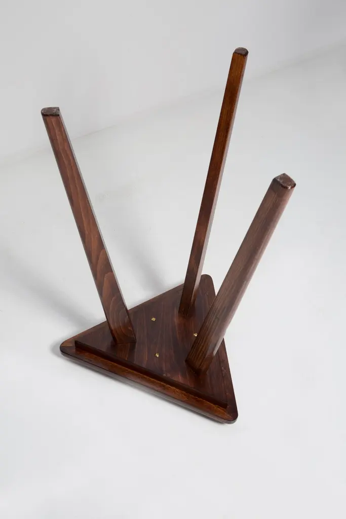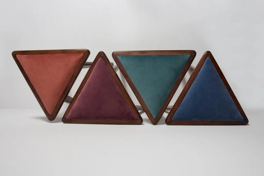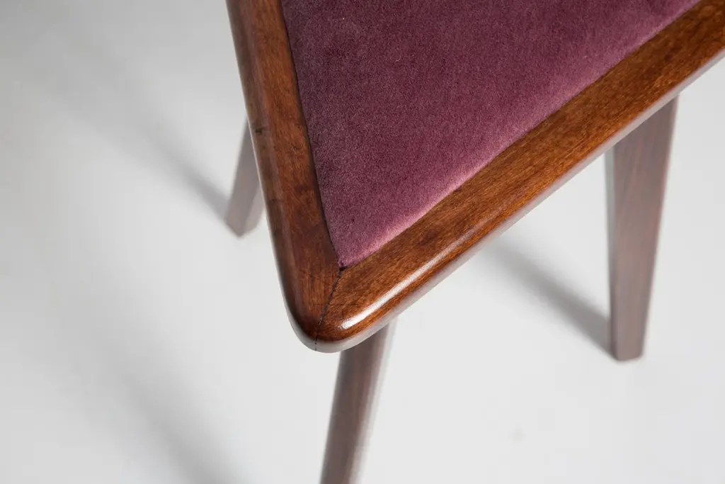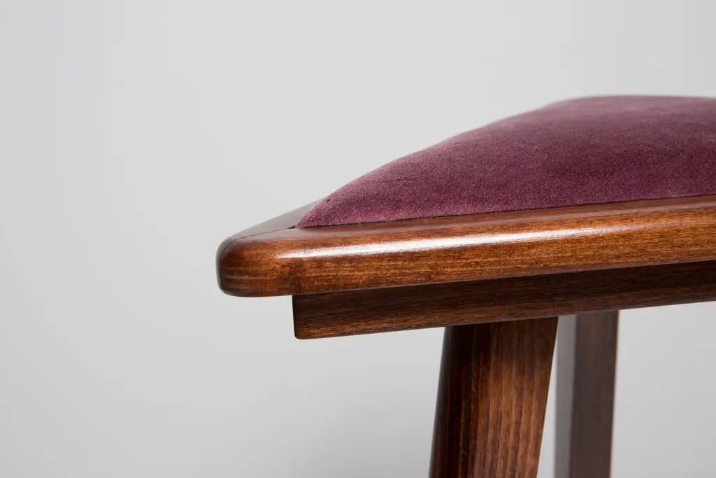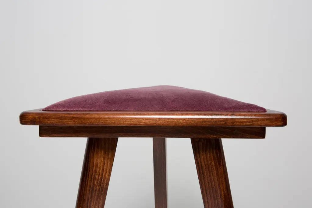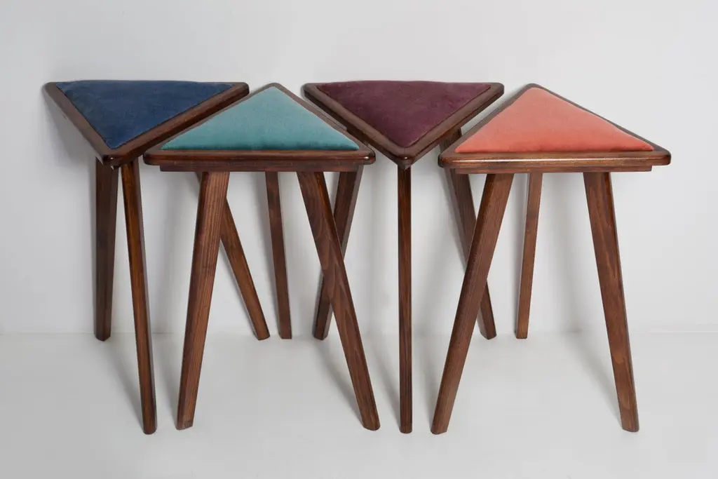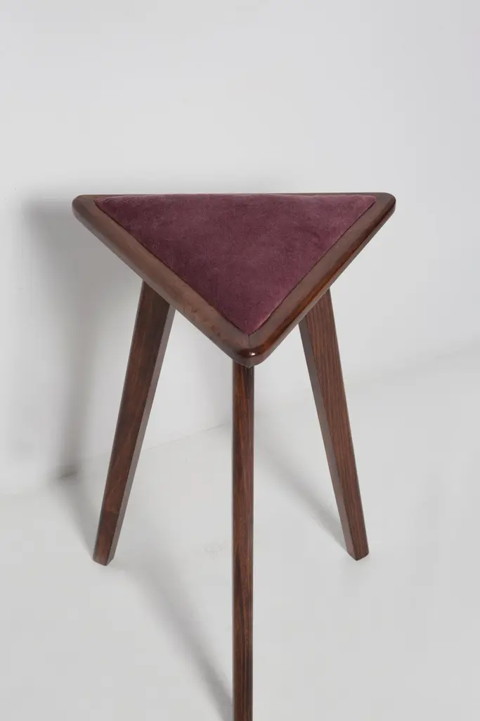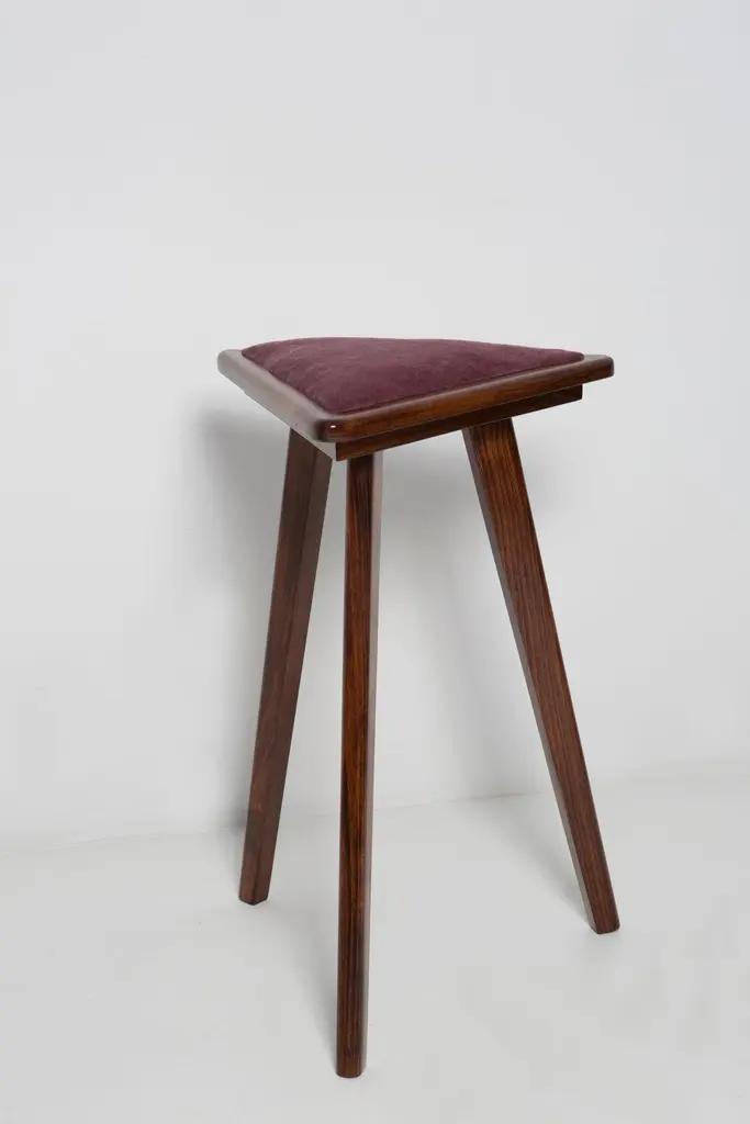Comfortable and stabile triangle stool.They are contemporary stools inspired of 1960s style. They can be used as a bar stools.Stool was designed by Vintola Studio, a Polish brand created by Ola Szewczul, designer of vintage interior architecture and photographer.Produced in 2023 at the Vintola Studio Factory in Poland. The whole stool is covered with high-quality velvet. Very beautiful and unique item with light geometric form.All options of fabrics and wood colors are possible to prepare. Change of dimensions are also possible.Please ask for more informations.