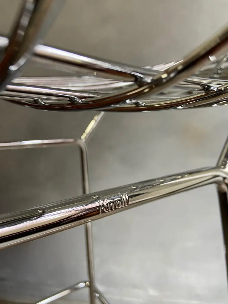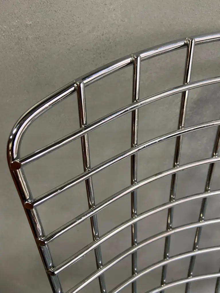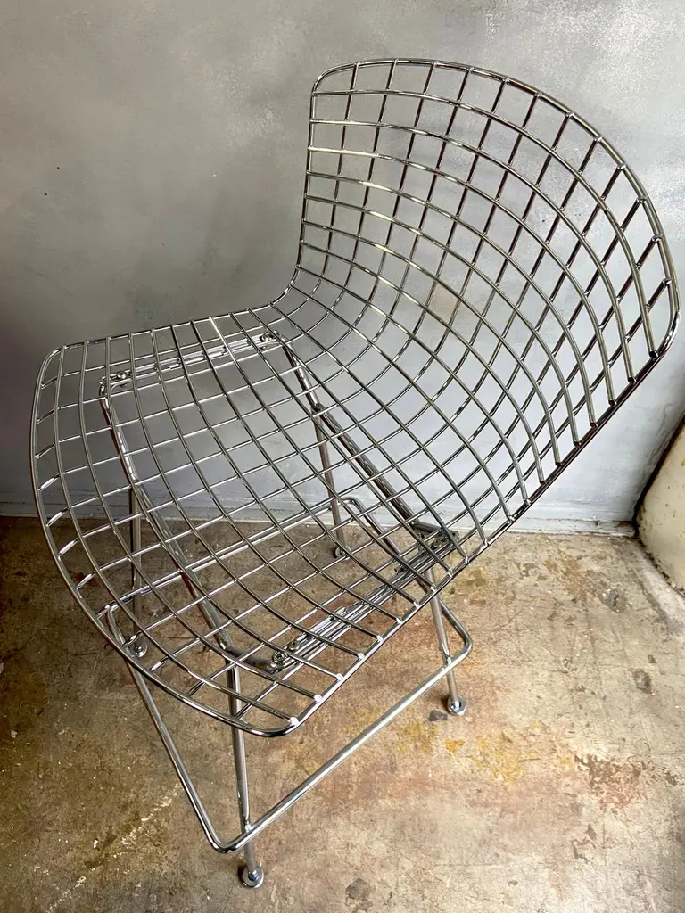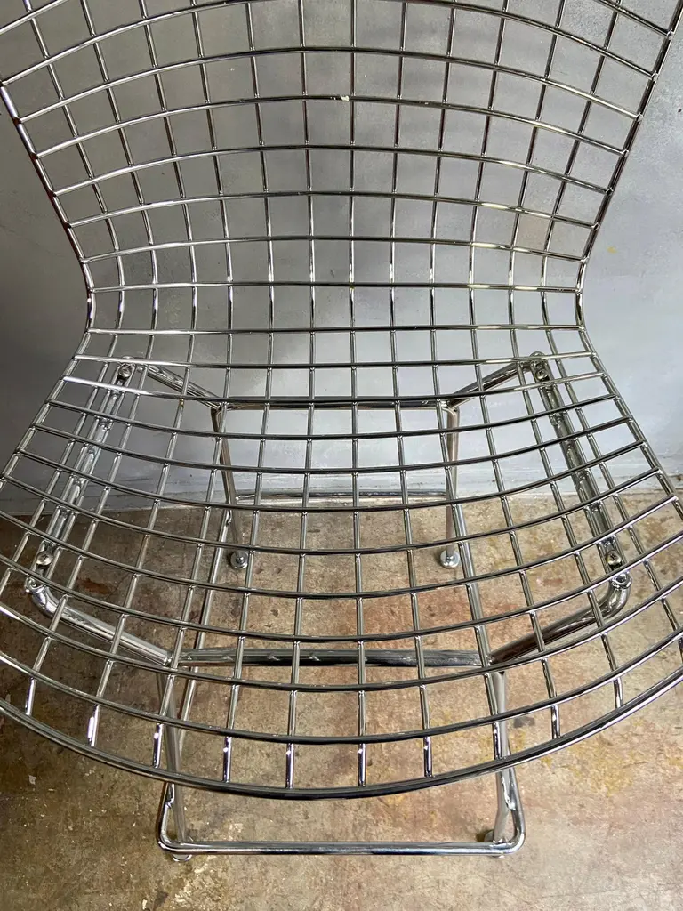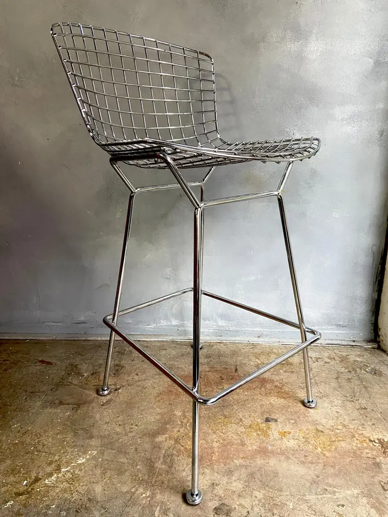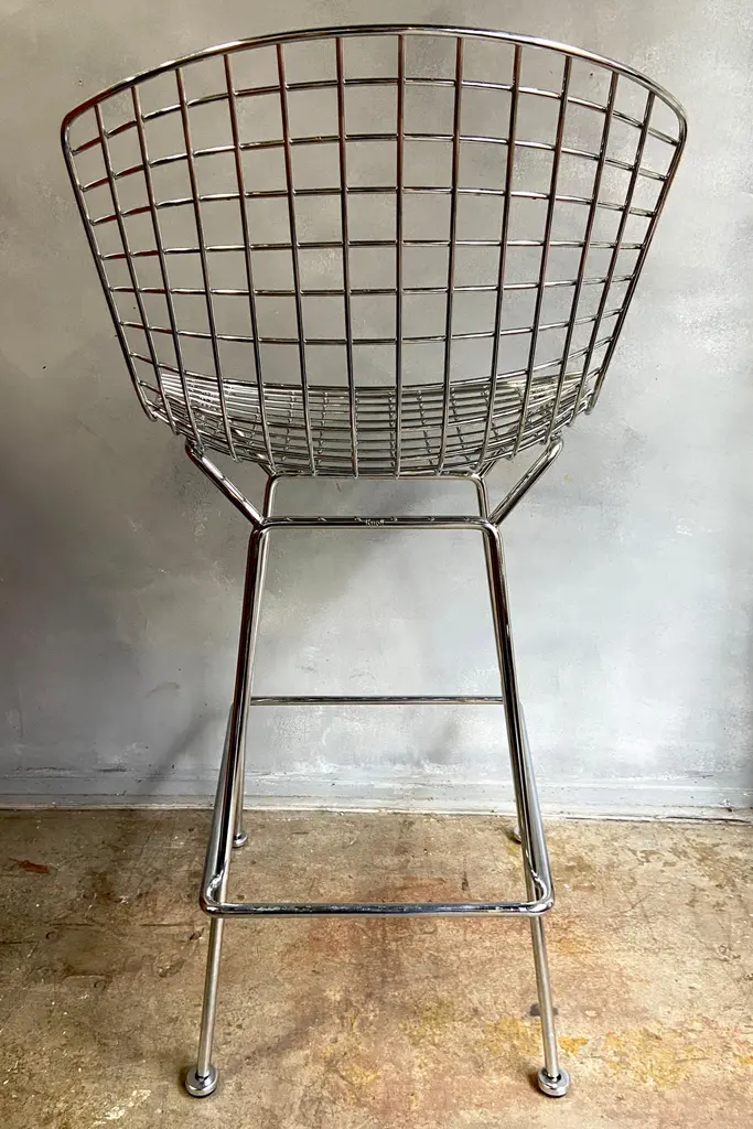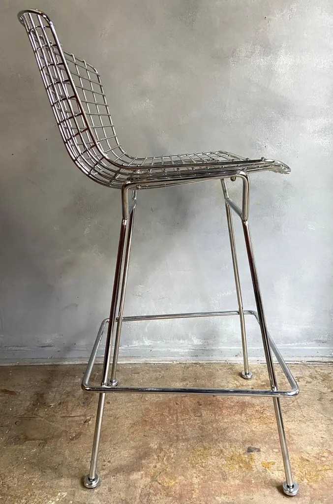 Mid century classic and iconic Bertoia for Knoll stools in a high chrome finish. Architectural design, clean original condition, ready to use. Very solid and sturdy showing no loss to chrome finish. Stamped Knoll on the frame. Good for height of table / surface 40-43"