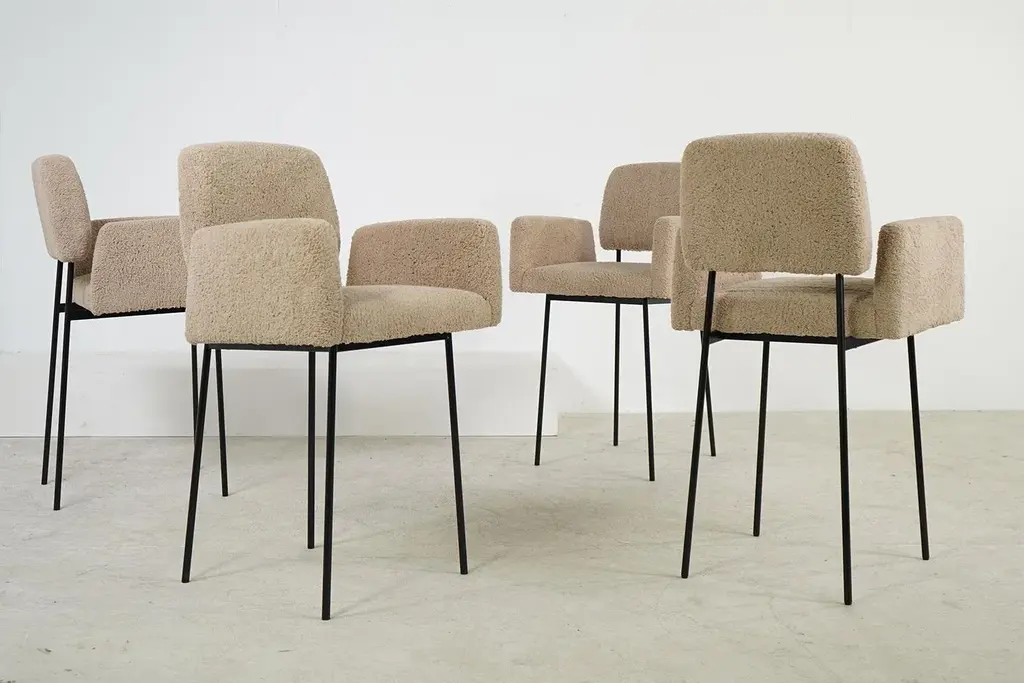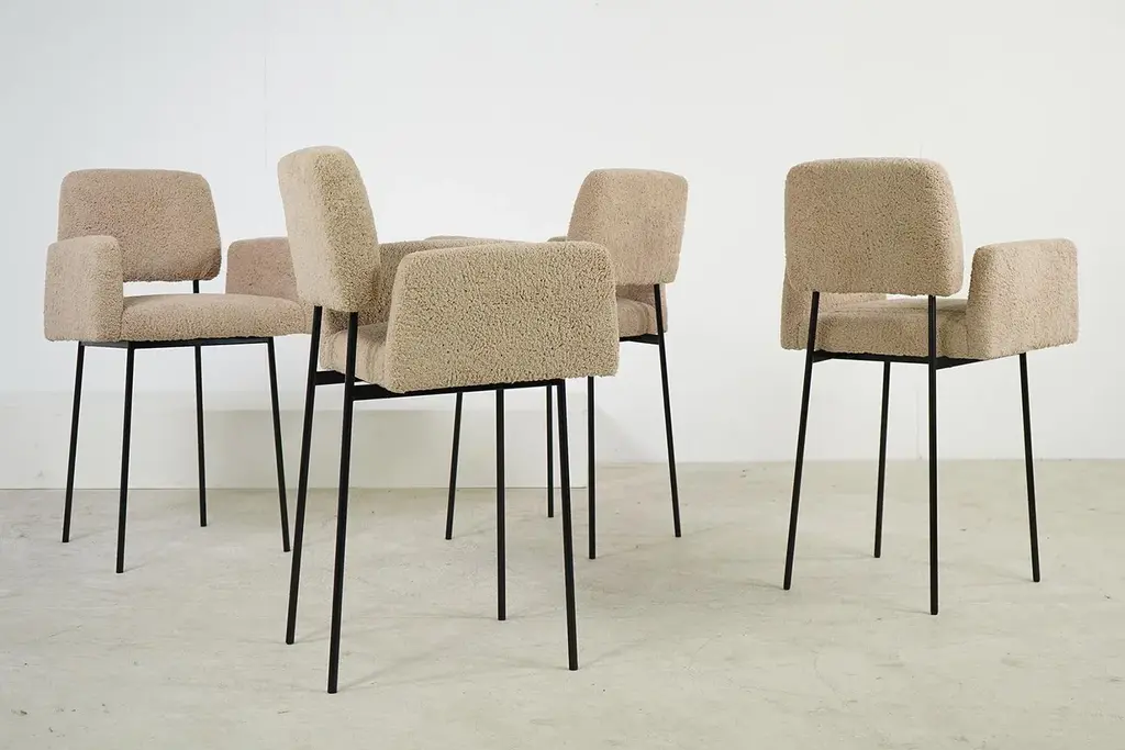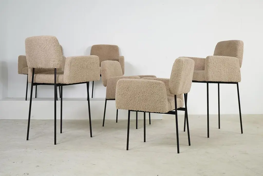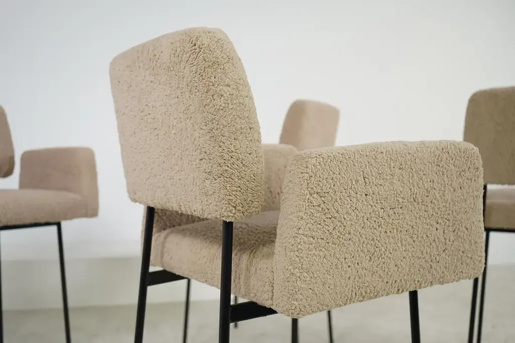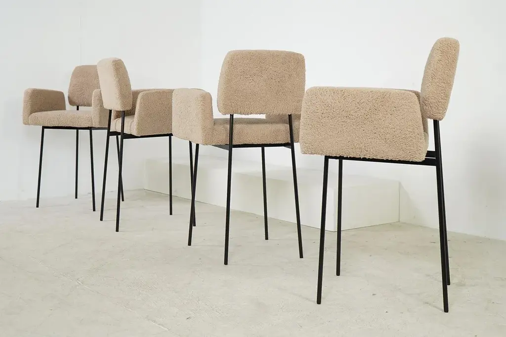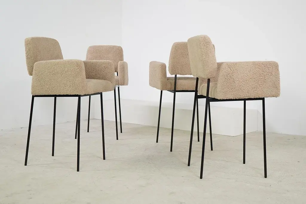 The Nathan Lindberg bar stool with arms Unique design, a contemporary stool in a vintage look, manufactured in the 'oldschool style' so no modern components, very sturdy. The seat has a metal spring core. The seat is made of solid beech wood or solid pine wood, the special designed metal base is powder coated. All parts are handmade. Teddy fur fabric, is super soft to the touch, beautiful natural tone, like sheepskin, but made of eco cotton. Dimensions: Total height: 105 cm Width: 64 cm Depth: 60 cm Seat height: 66cm Armrest height: 86cm