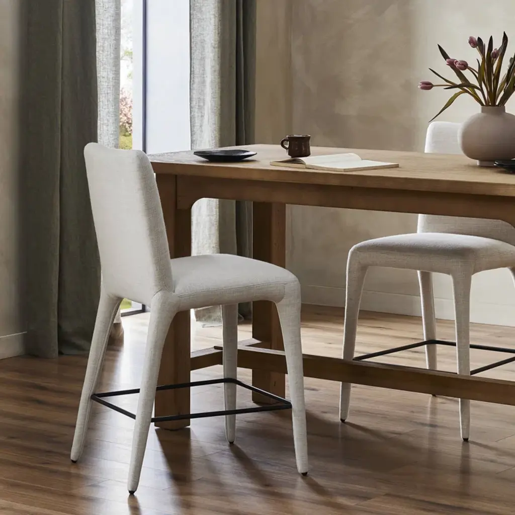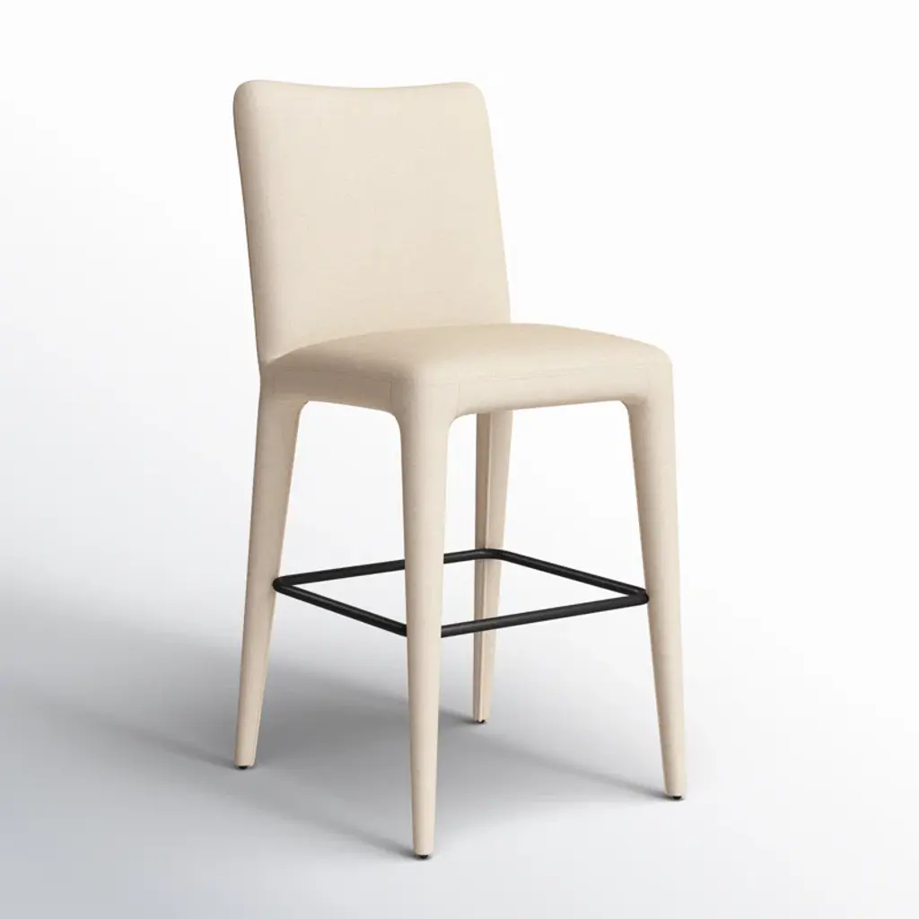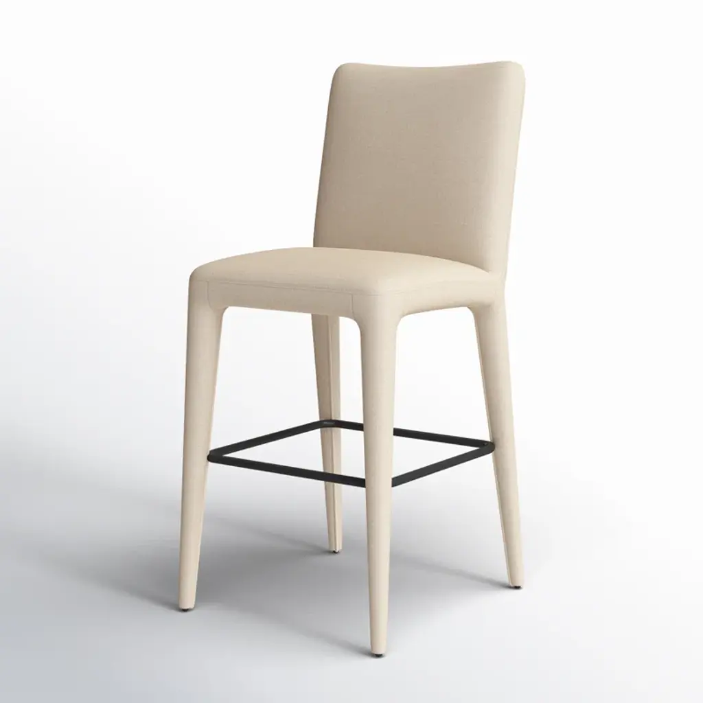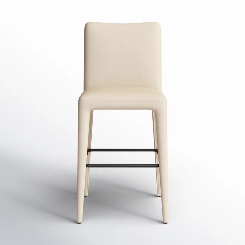 Shapely and sleek, with a scooped back and tapered legs, natural linen upholstery brings total sophistication to this bar stool. Accented by a gunmetal footrest for contrast.