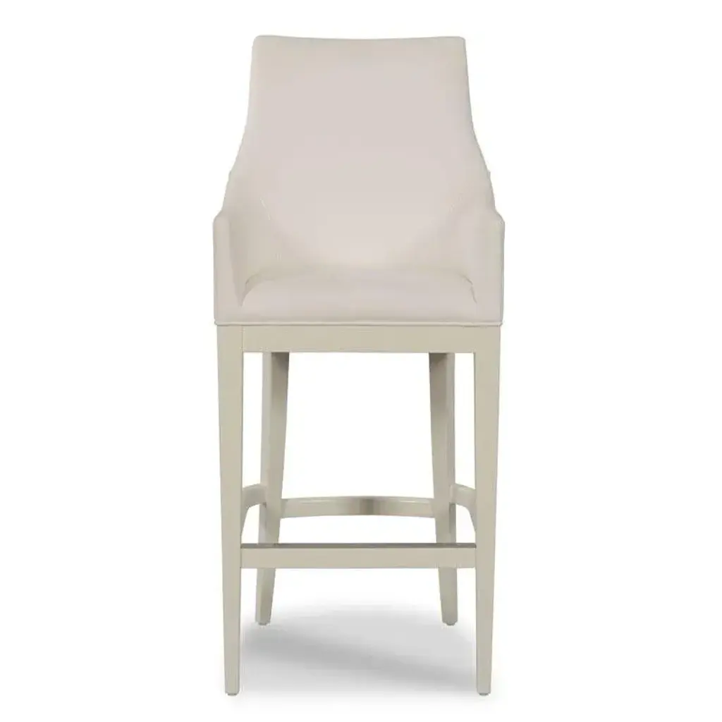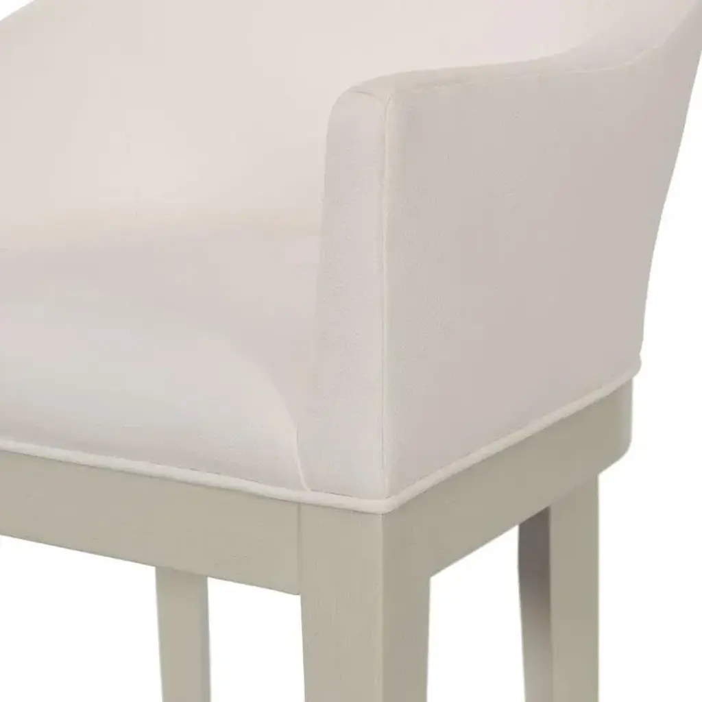 A curved oval upholstered back resides above an upholstered seat elevated on graceful tapering legs.
