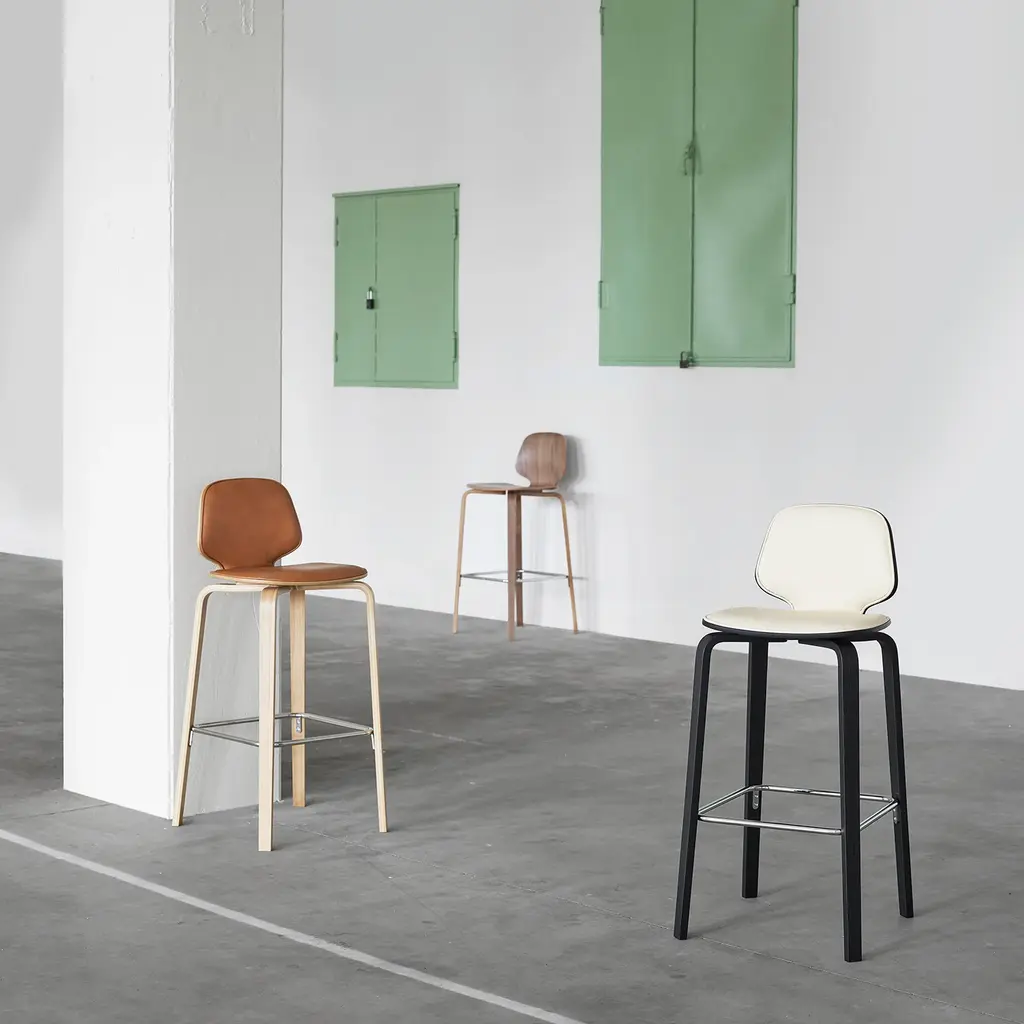 Combining a pair of desirable options, this barstool has cushioned front-facing upholstery with a molded structure in a selection of appealing wood veneers. Norman Copehnhagen’s new-classic My Chair series is designer designer Nicholai Wiig Hansen’s take on Scandi molded seating, combining relaxed ease with a distinctively curved profile. Available in walnut, oak, smoked oak or birch veneer, the stool’s molded seat layered with PU foam is further customized with a choice of fine fabric or leather upholstery.