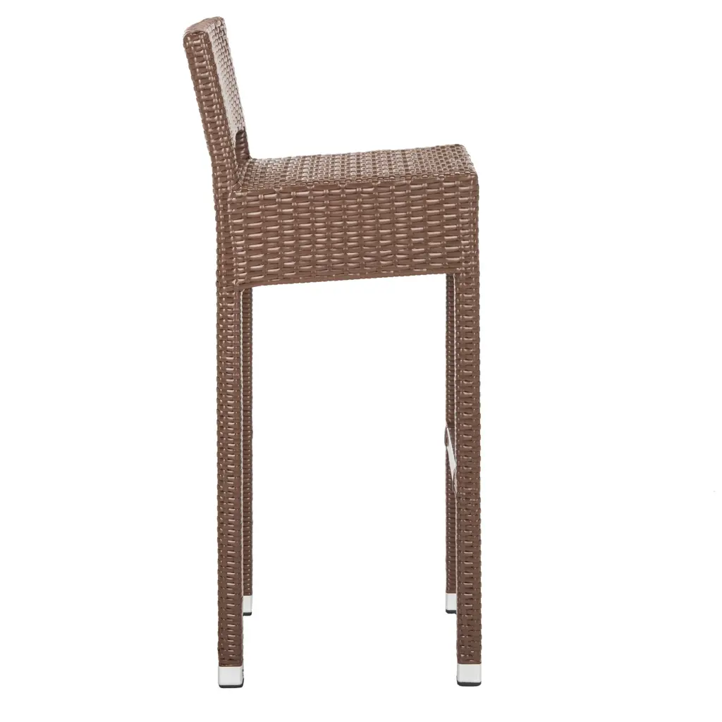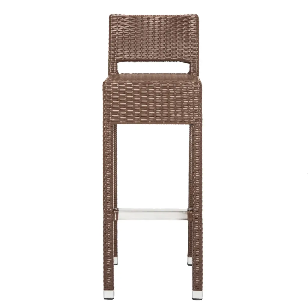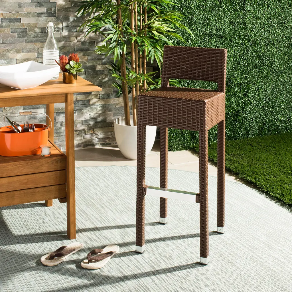 The height of fashion, this contemporary indoor/outdoor contemporary barstool makes a chic statement in any interior. Ideal for sipping cocktails or a espresso, it's timeless brown wicker construction with silver metal accents makes it a investment. Store outdoor furniture indoors or cover well when not in use. Remove wooden furniture from standing water. Dust regularly with small brush or vacuum. Spills should be taken care of immediately before they harden or stain with a slightly dampened sponge. Do not use bleach solutions.