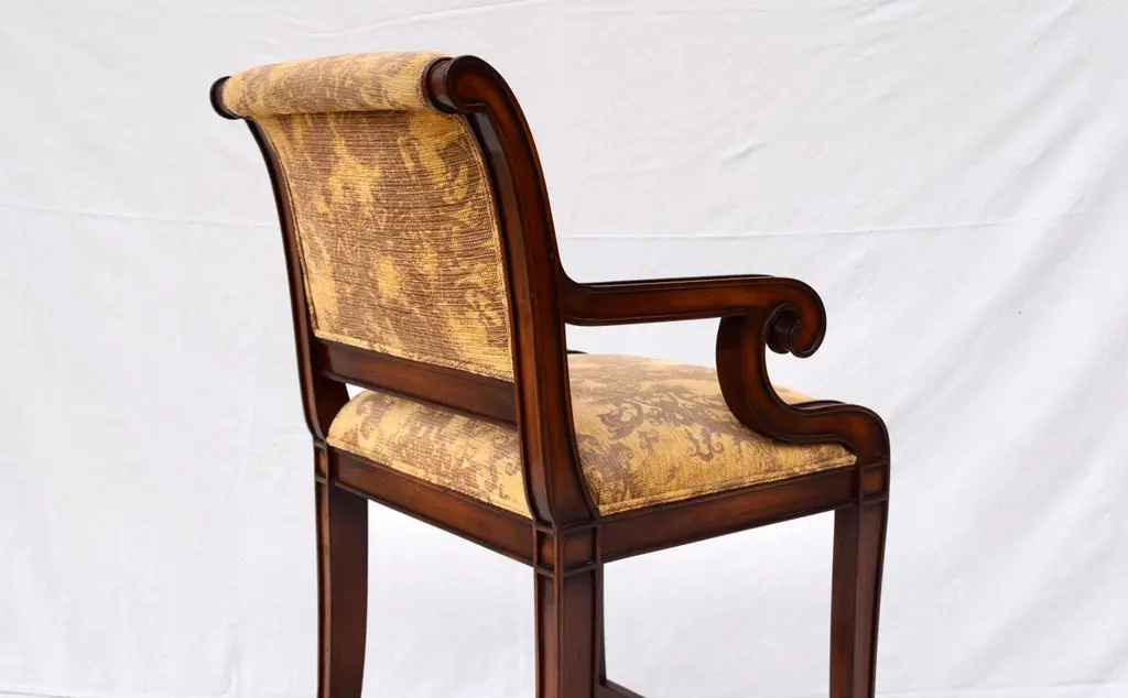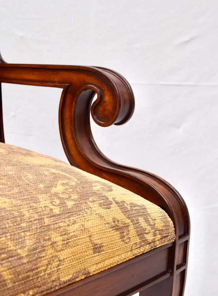 Nancy Corzine Classic Regency bar chairs item # 8011 in English walnut waxed finish with tags. Sold as a pair the chairs are in exceptionally well maintained condition. Two sets available.