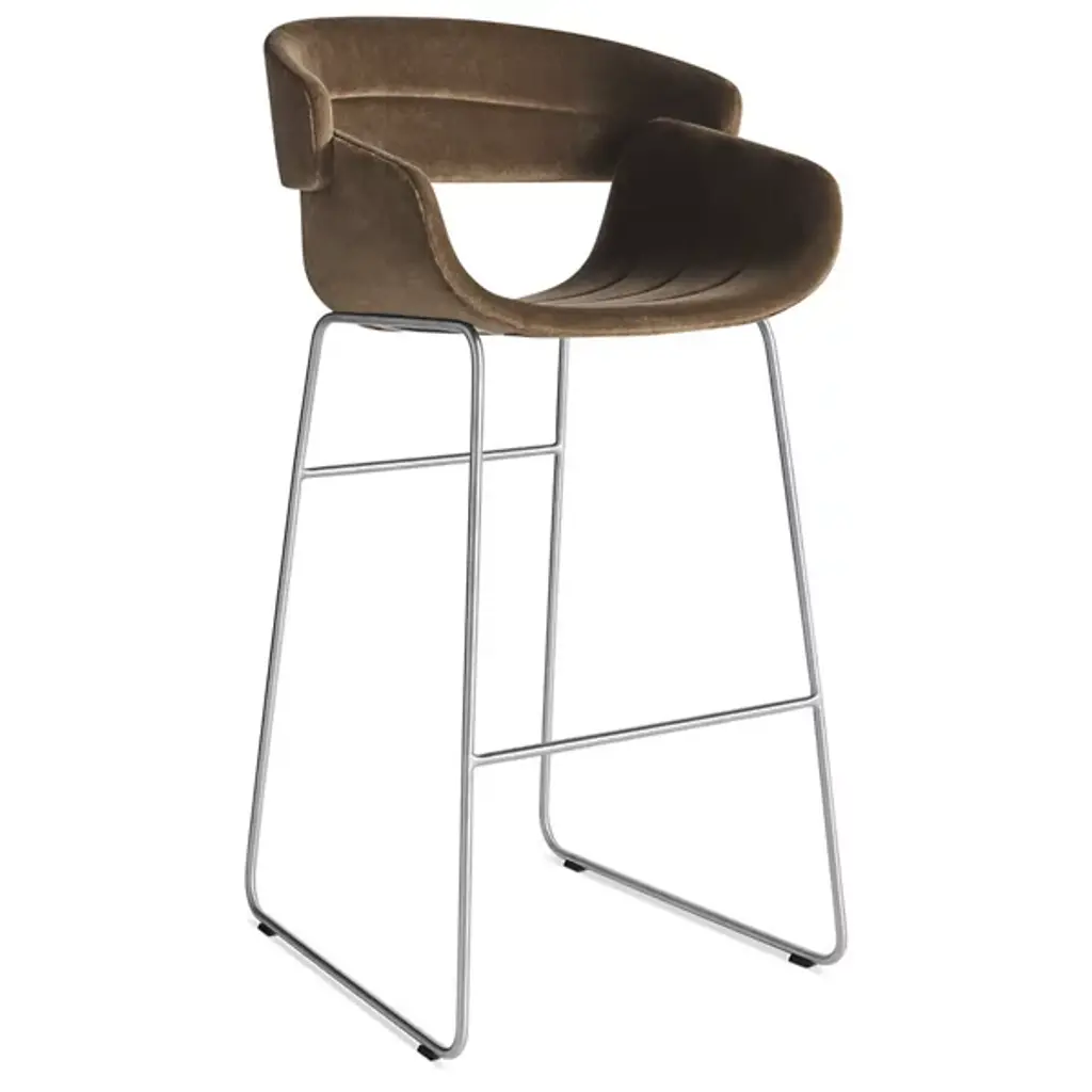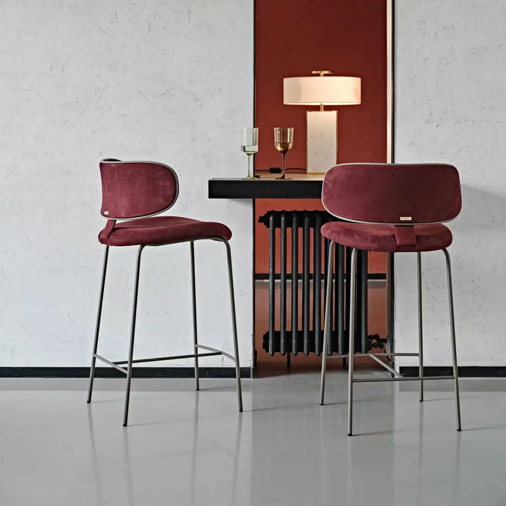 The embodiment of elegance and simplicity, this exquisite stool is pure form and fabric. Resting on a brown-lacquered metal base, the seat and back are made of curved beechwood, padded with high-resilience polyurethane foam, and upholstered with a red leather cover enhanced with eco-leather details. Please inquire with the Concierge for further information.