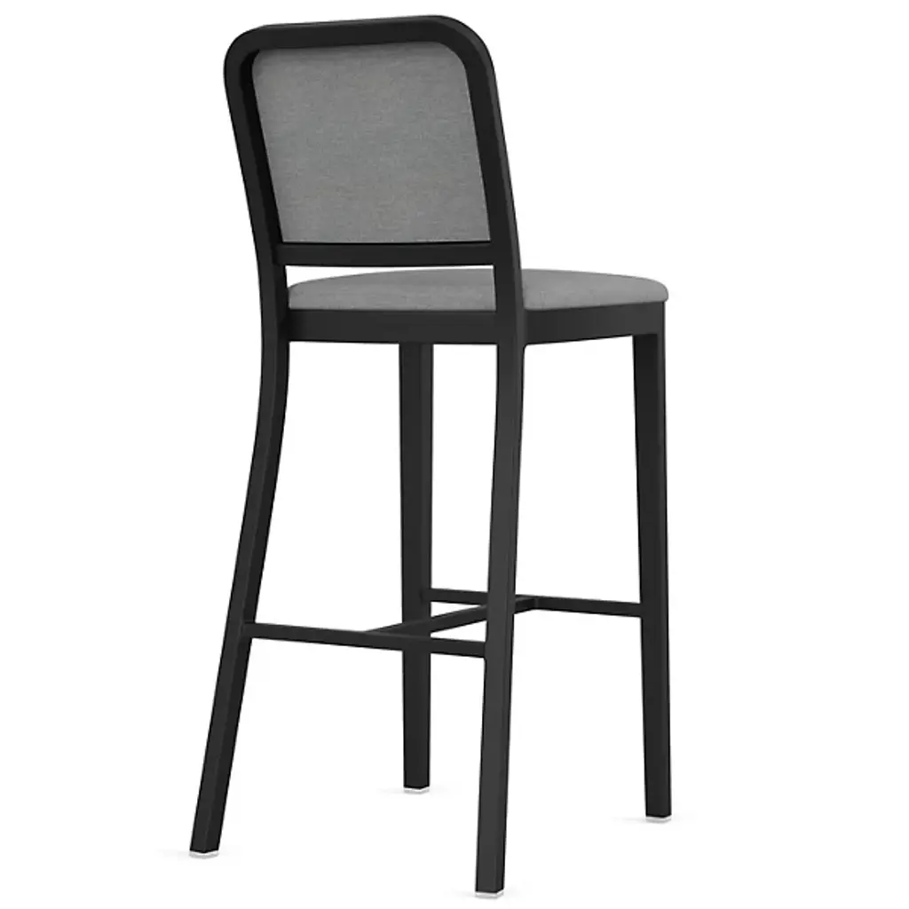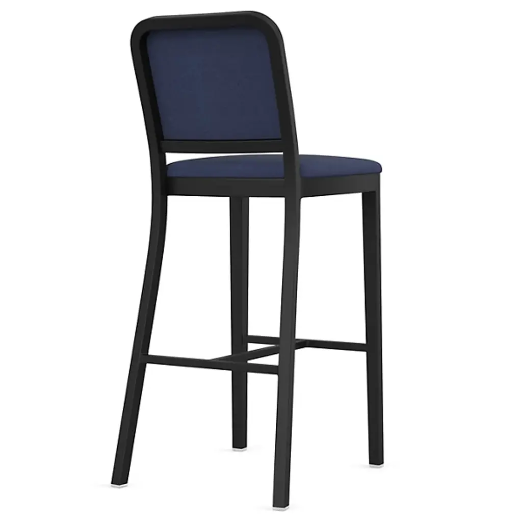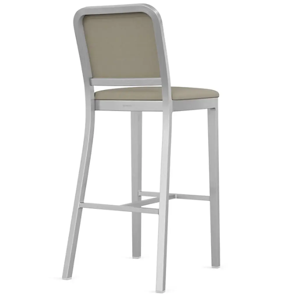 The Navy Officer Upholstered Bar/Counter Stool from Emeco is a contemporary piece designed by Jasper Morrison. It is crafted carefully, featuring a streamlined, armless design that adds a touch of contemporary style to your space. The frame, made from recycled aluminum, represents a commitment to sustainability. It boasts industrial design influences for a distinctive aesthetic. Designed for both style and relaxation, this fixture features upholstery that provides a comfortable seating experience.