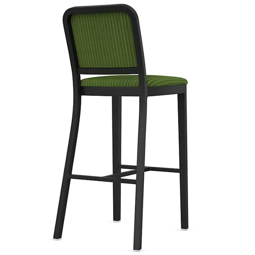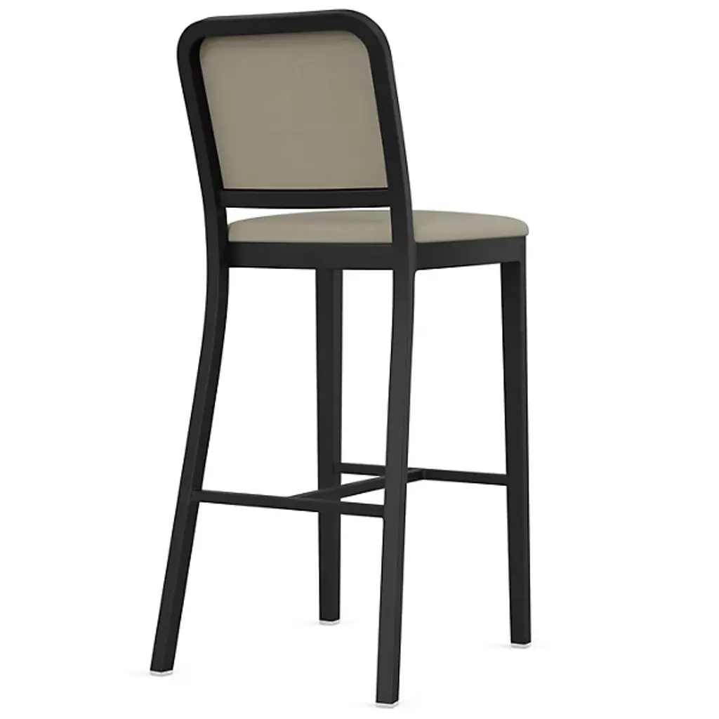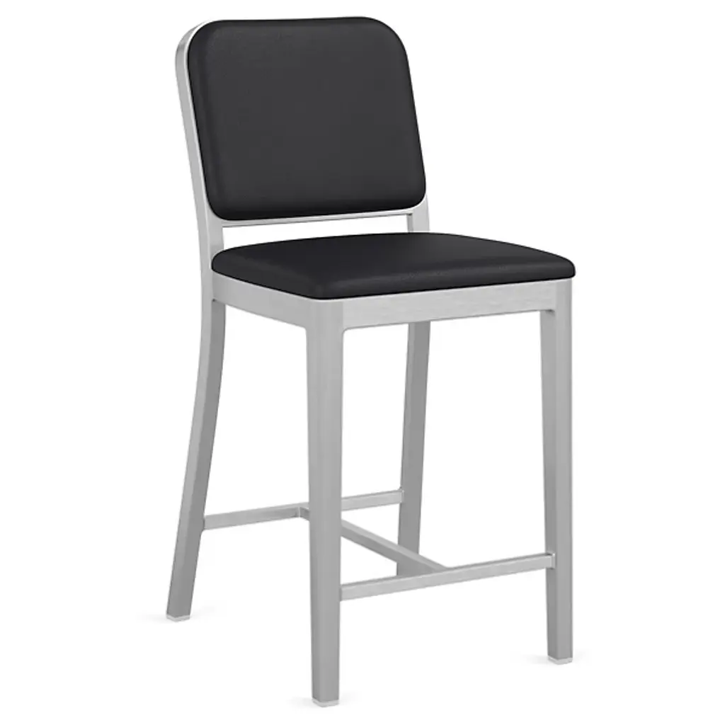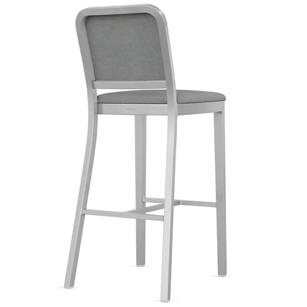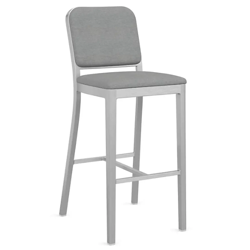 The Navy Officer Upholstered Bar/Counter Stool from Emeco is a contemporary piece designed by Jasper Morrison. It is crafted carefully, featuring a streamlined, armless design that adds a touch of contemporary style to your space. The frame, made from recycled aluminum, represents a commitment to sustainability. It boasts industrial design influences for a distinctive aesthetic. Designed for both style and relaxation, this fixture features upholstery that provides a comfortable seating experience.