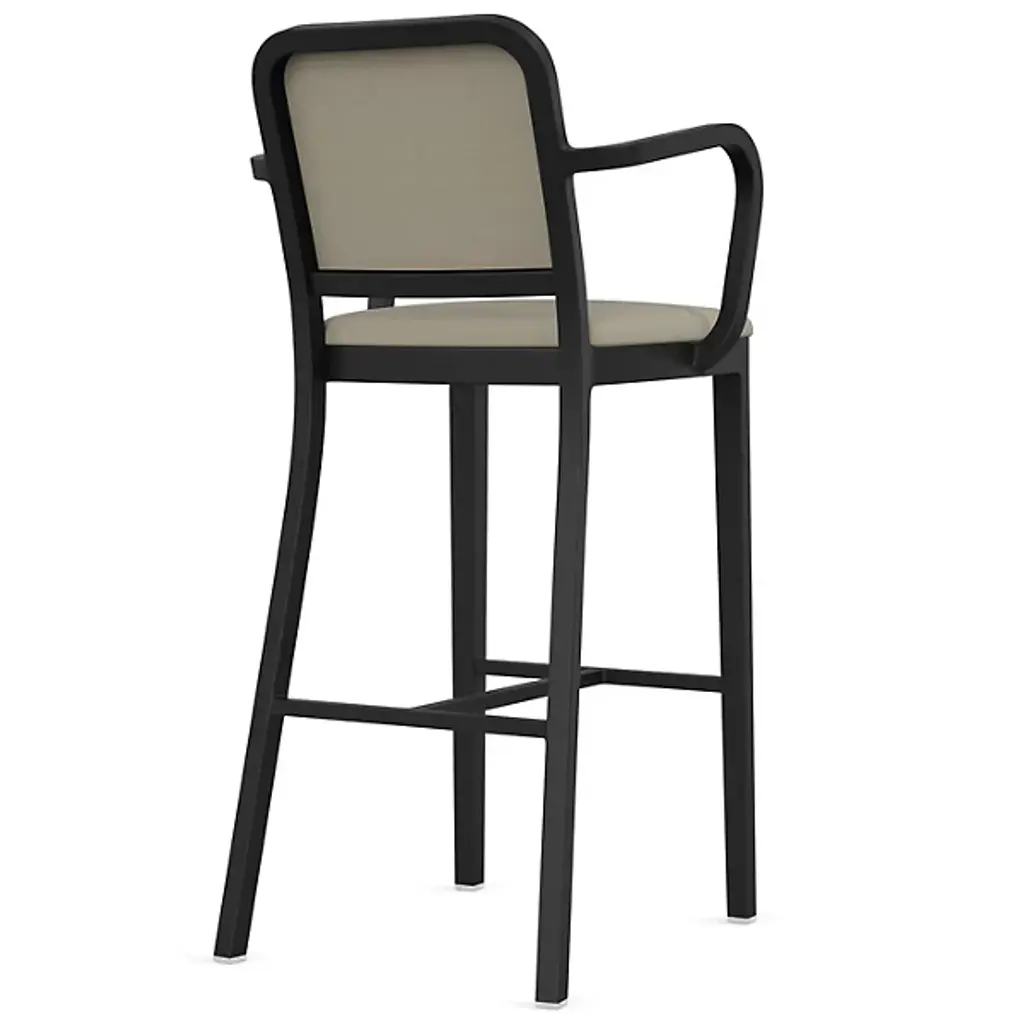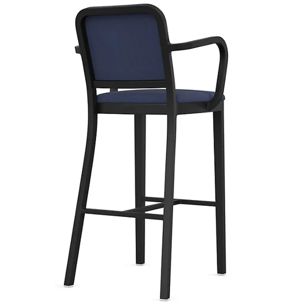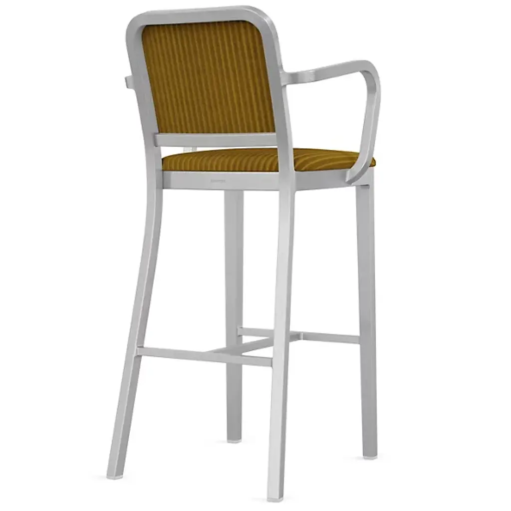 The Navy Officer Upholstered Bar/Counter Stool with Arms from Emeco is a distinguished piece designed by Jasper Morrison. Elevate your seating experience with this distinctive stool that seamlessly combines contemporary aesthetics with industrial flair. Crafted with precision, the frame of the stool is made from recycled aluminum, embodying a commitment to sustainability. Intricate upholstery adds a layer of comfort to this durable seating solution. Its streamlined form makes it highly versatile.