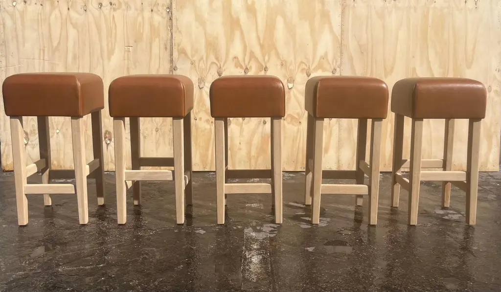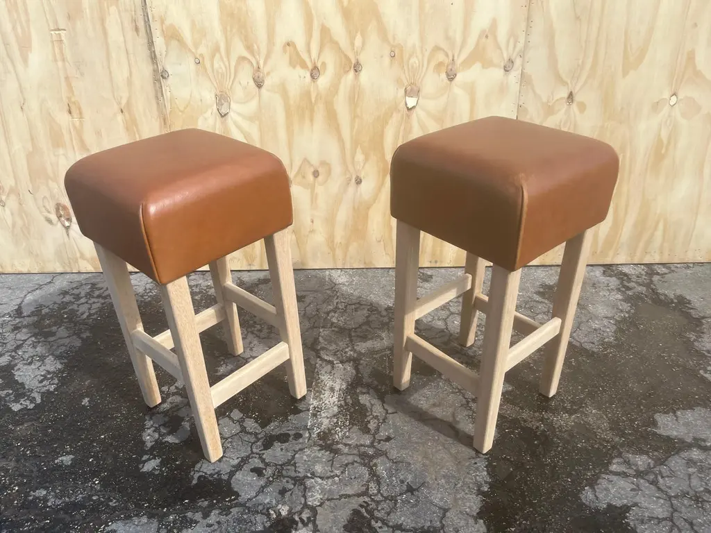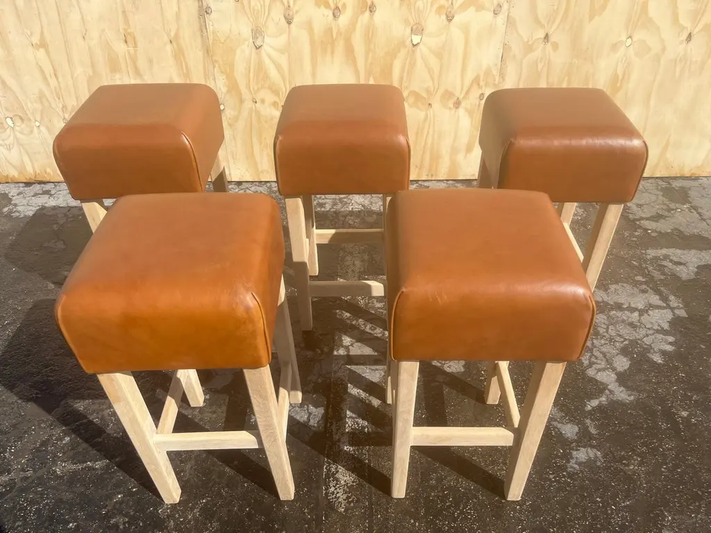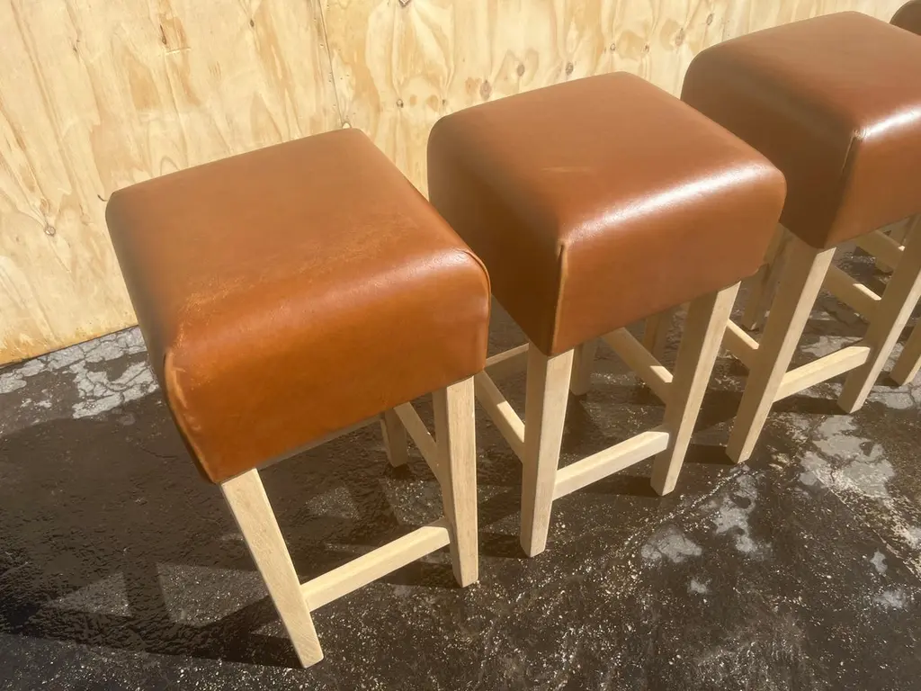 Beautiful Bar Stools in the Style of Jean-Michel Frank, white oak base with cognac leather seat. The Leather is very thick and white oak base is made to last forever. The Leather has a nice patina. The white oak base has no finish yet. The seller will oil or lacquer base for buyer if wanted. Price is per stool, five stool in total available.