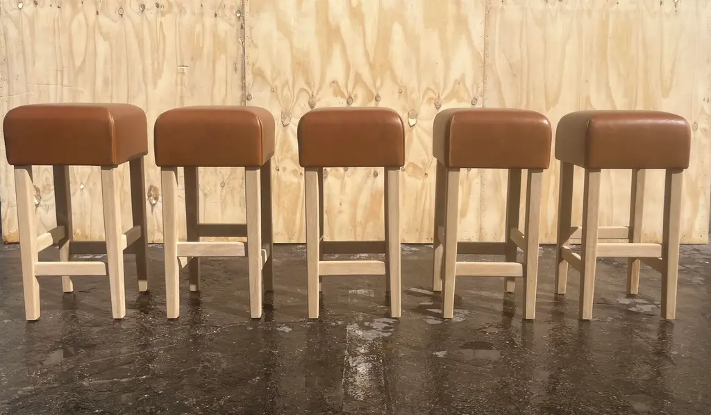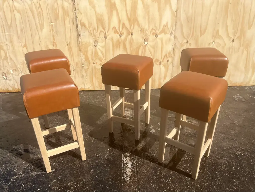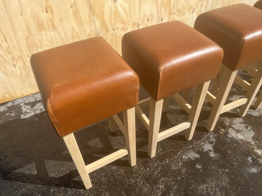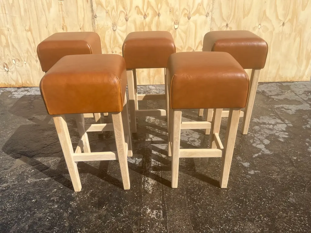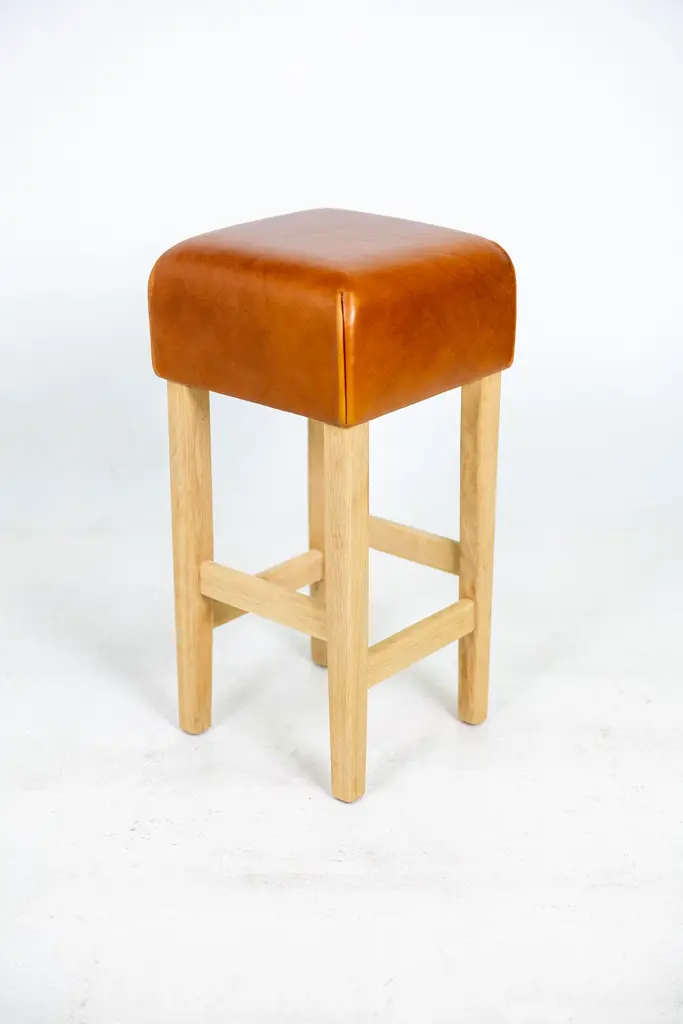 One Beautiful Bar Stool in the Style of Jean-Michel Frank, white oak base with cognac leather seat. The Leather is very thick and white oak base is made to last forever. The Leather has a nice patina. The white oak base has no finish yet. The seller will oil or lacquer base for buyer if wanted. Price is per stool, five stools in total available.