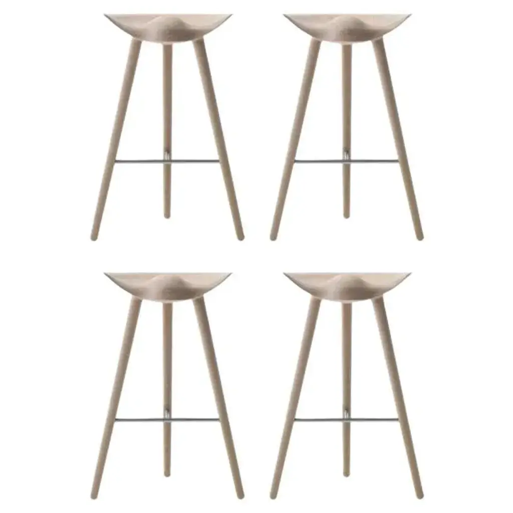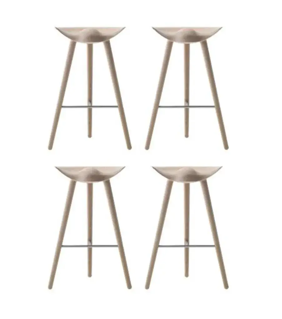Set of 4 Oak and stainless steel bar stools by Lassen Dimensions: h 77 x w 36 x l 55.5 cm Materials: Oak, Stainless Steel In 1942 Mogens Lassen designed the Stool ML42 as a piece for a furniture exhibition held at the Danish Museum of Decorative Art. He took inspiration from the stools used by the shoemakers of the past, and transferred the light, elegant look to the creation of this sculptural three-legged stool. The Stool ML42 is still manufactured in Denmark to this day with a focus on quality and Danish craftsmanship, and is considered a collector’s item by international design connoisseurs. By Lassen is a Danish design brand focused on iconic designs created by Mogens and Flemming Lassen, founded by Lassens’ relatives in 2008. Brothers Mogens (1901-1987) and Flemming (1902-1984) Lassen are known as two of Denmark’s greatest architects and designers. Both were renowned pioneers of Danish functionalism and modernist architecture, honoured with numerous prestigious medals and awards. Headed by Mogens Lassen’s grandson Søren Lassen, By Lassen carries on the brothers’ design philosophy by manufacturing their iconic designs as well as products by other designers that complement the Lassen’s functionalist style. The company’s mission is to continue the tradition of timelessness, functionality and quality, and to introduce the Lassen’s design heritage to new generations.