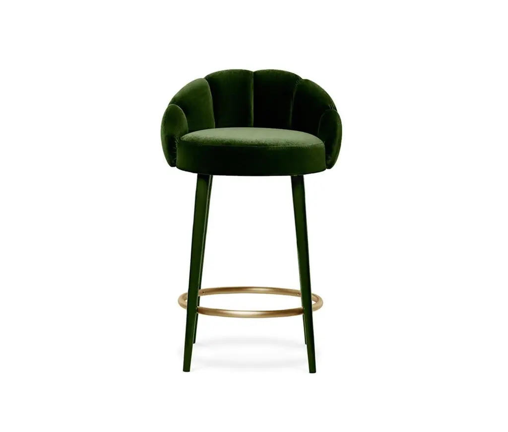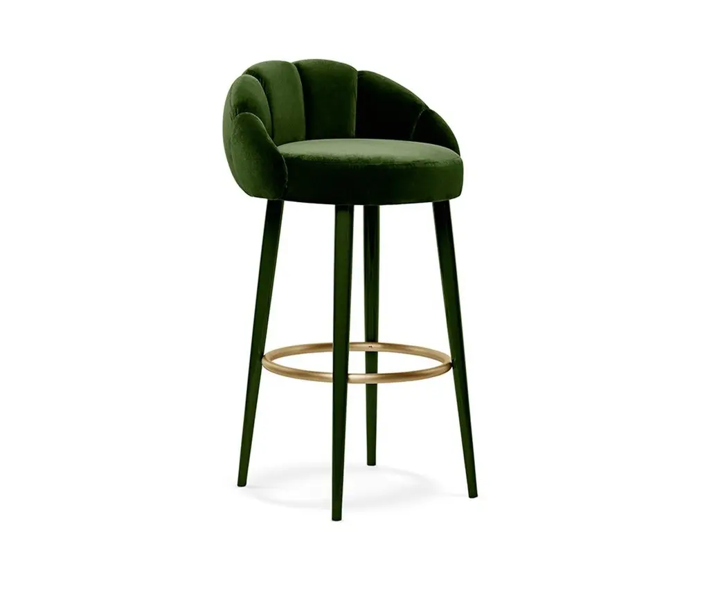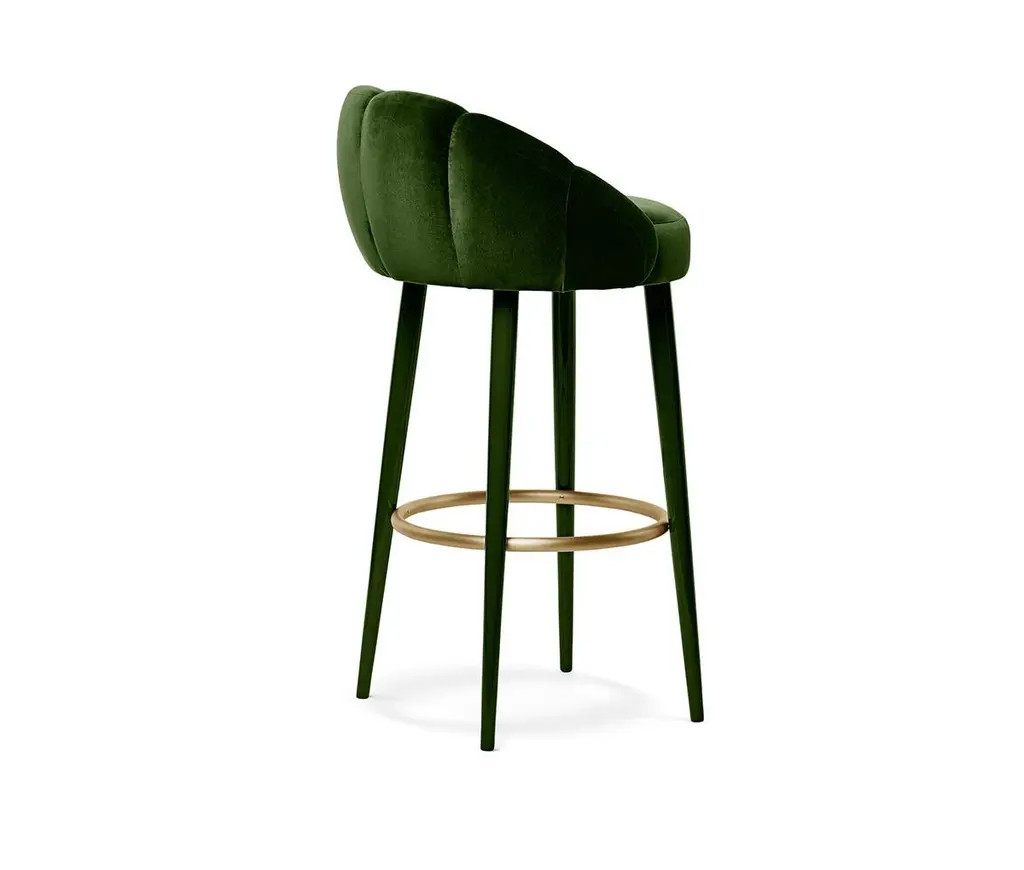 Olympia Bar Stool by MunnaDimensions: D 55 x W 58 x H 100 cm. SH: 80 cm.Materials: Solid wood, foam, brass, and upholstery.Finish: Upholstery: Cotton Velvet, ref. Emerald, CV09. Ring: Brushed brass. Legs: Emerald gloss lacquer.Available in all Munna fabrics except Wild Silk. Available in client’s ownmaterial. Legs are available in solid Walnut, Wengé stain or lacquer in all RAL colors, in matt or gloss. The ring is available in Brass, Nickel or Copper in polished or brushed. Handmade in Porto. Please contact us.Established in Porto in 2008, Munna is a furniture design brand renowned for creating handmade upholstery with unmatched craftsmanship, seamlessly blending noble materials and timeless design, for both commercial and residential projects.Made by hand in Porto, Munna’s pieces honor the profound heritage of craftsmanship, while drawing inspiration from history’s most influential artistic periods. Munna’s pieces are made of the finest fabrics such as cotton velvet, twill, leather, and silk; the finest wood veneers, such as ebony, walnut, and rosewood; sumptuous gold, silver, and copper leaves, metal details in brass, nickel, and copper, and superior lacquers.