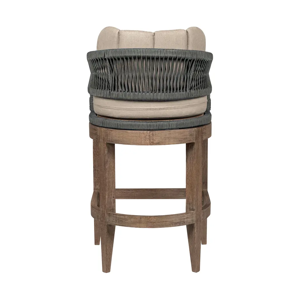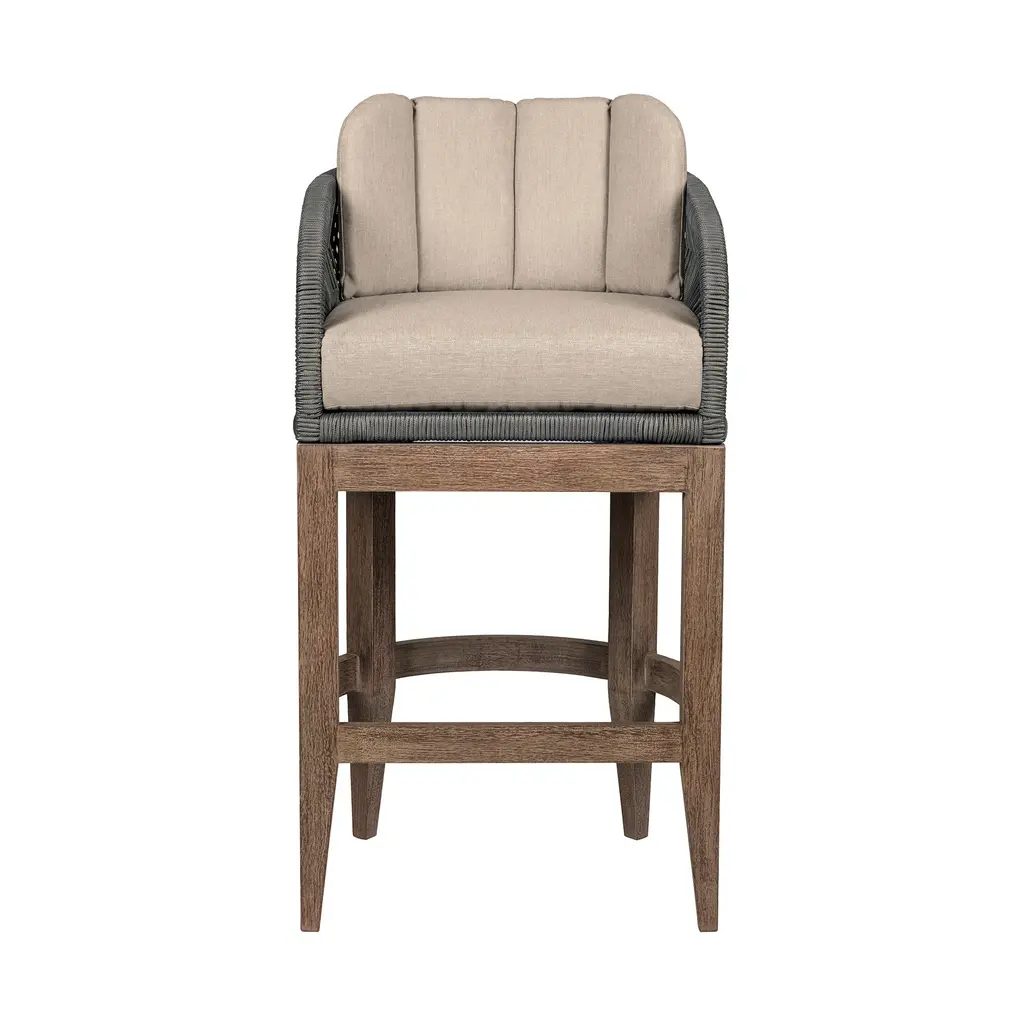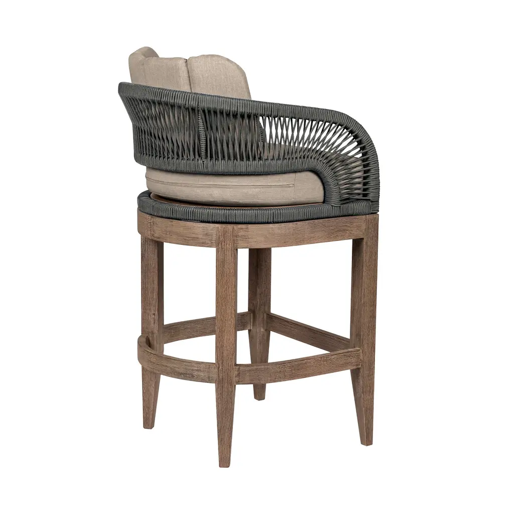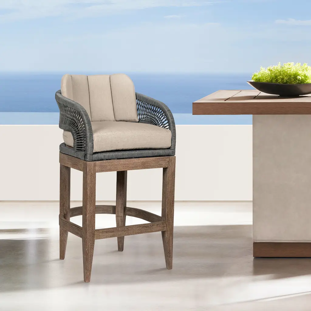 Orbit Boho Gray Rope And Solid Eucalyptus Wood Outdoor Barstool With Taupe Olefin Cushions - Taupe