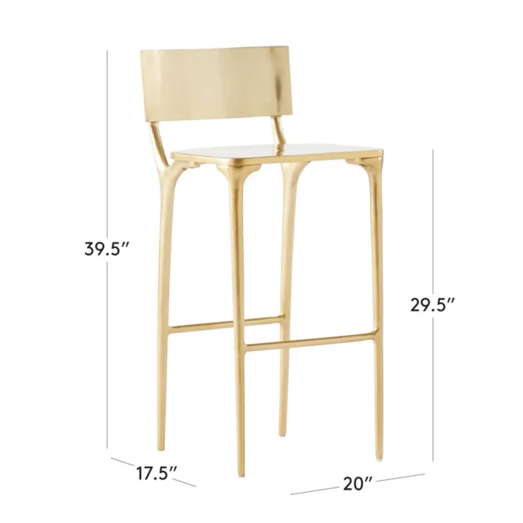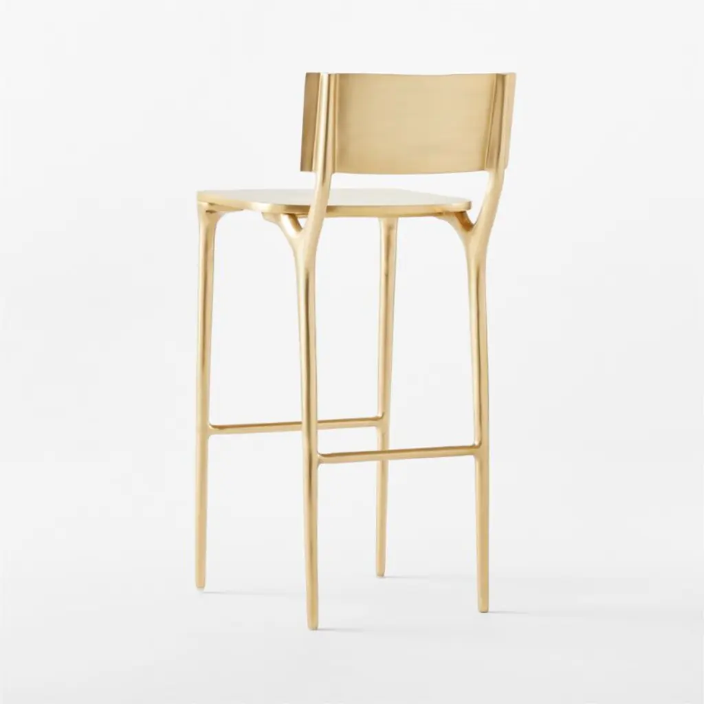 Gold finish bathes polished aluminum bar stool in warm luxury. Elegant seat shines at any outdoor dining or cocktail space. CB2 exclusive.