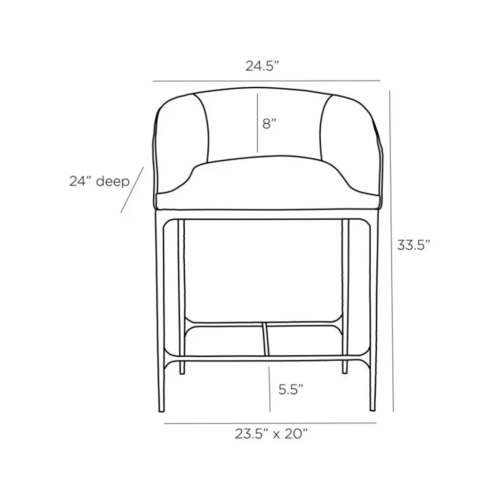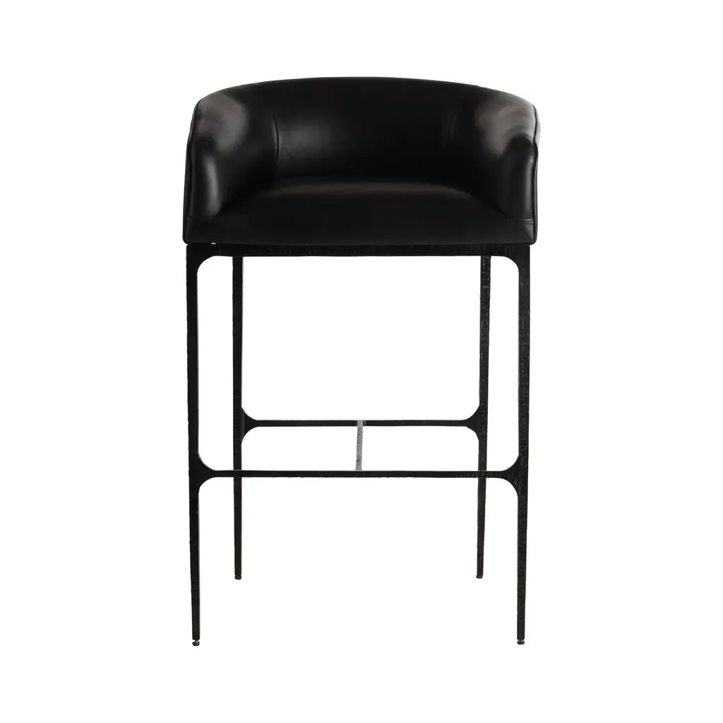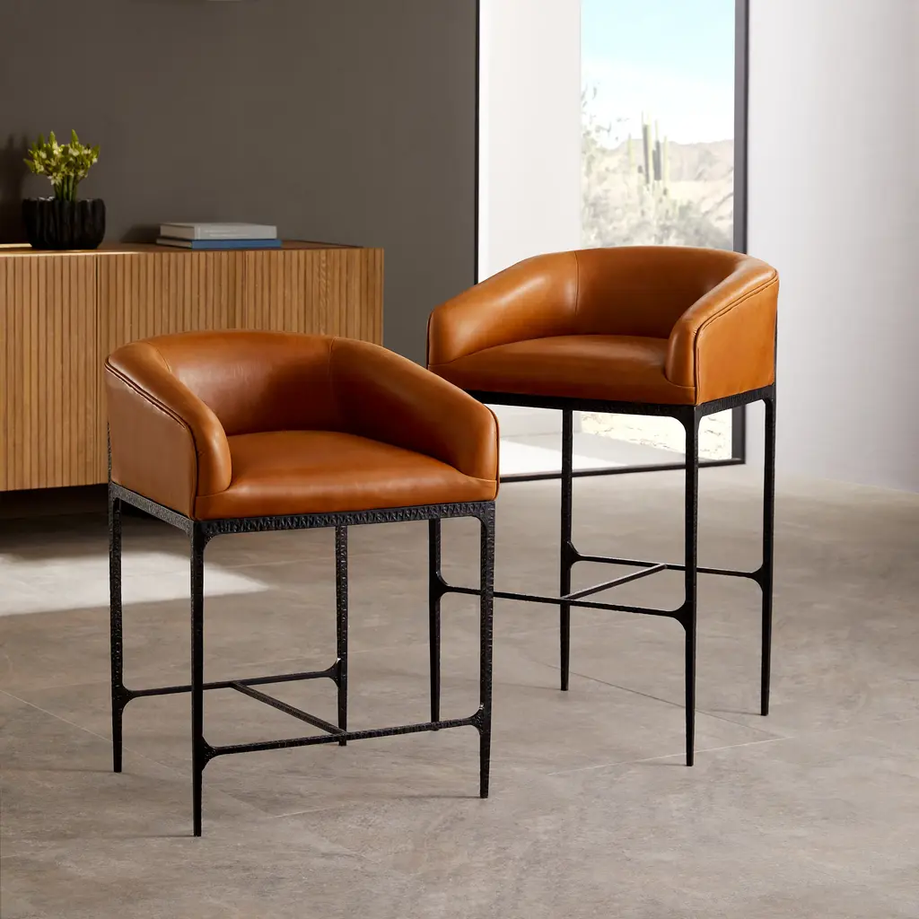 A hammered iron frame and handsome russet leather make this bar stool ultra-chic. The low, barrel-style shape gives lumbar comfort and support while allowing the stool to tuck neatly under a bar or countertop. Its modern style brings sophistication and polish to a space. Features