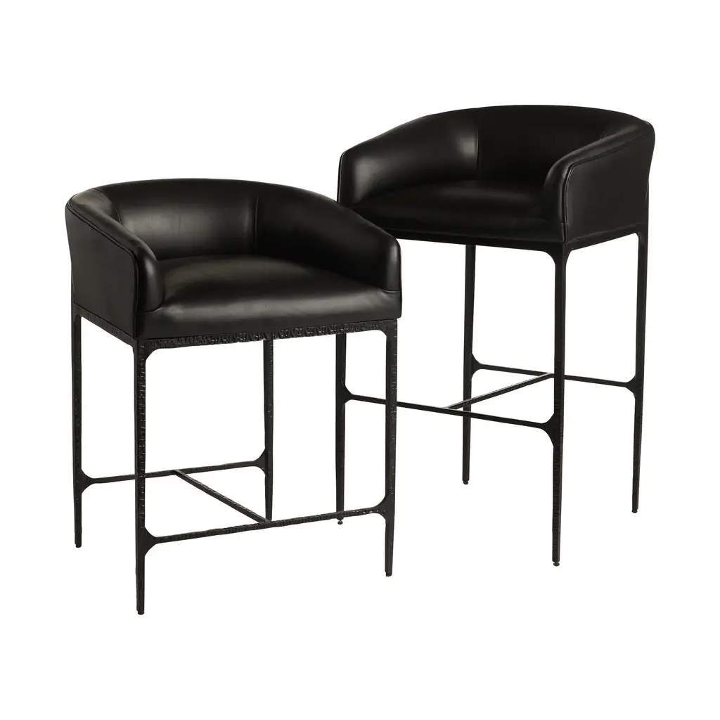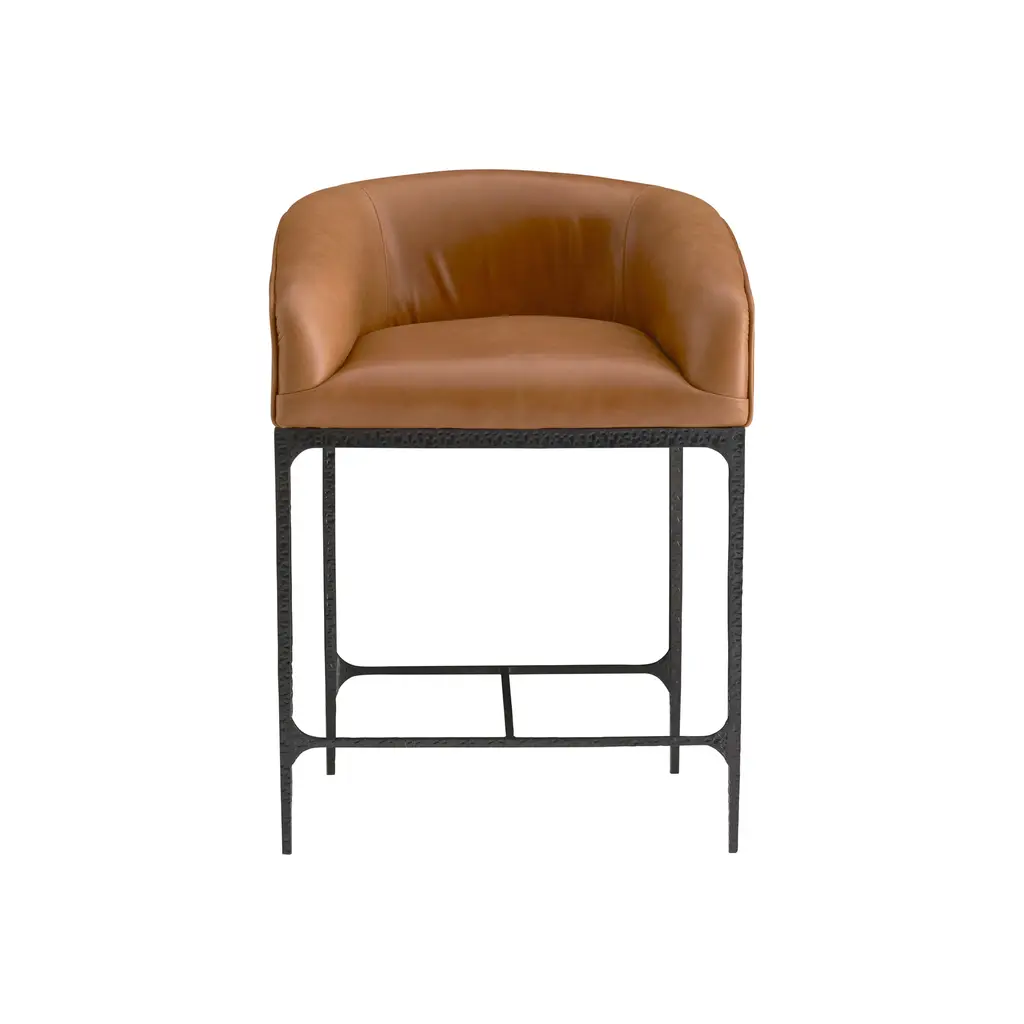 A hammered iron frame and handsome russet leather make this bar stool ultra-chic. The low, barrel-style shape gives lumbar comfort and support while allowing the stool to tuck neatly under a bar or countertop. Its modern style brings sophistication and polish to a space. Features