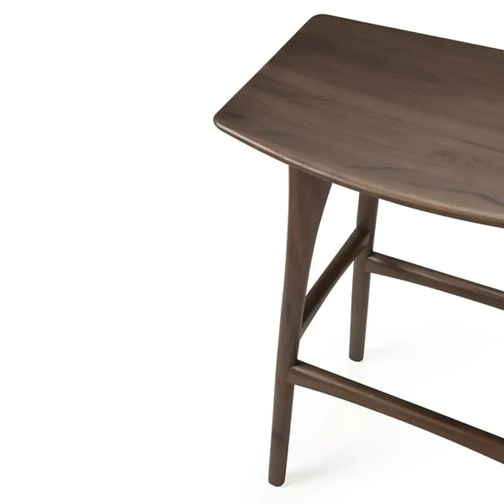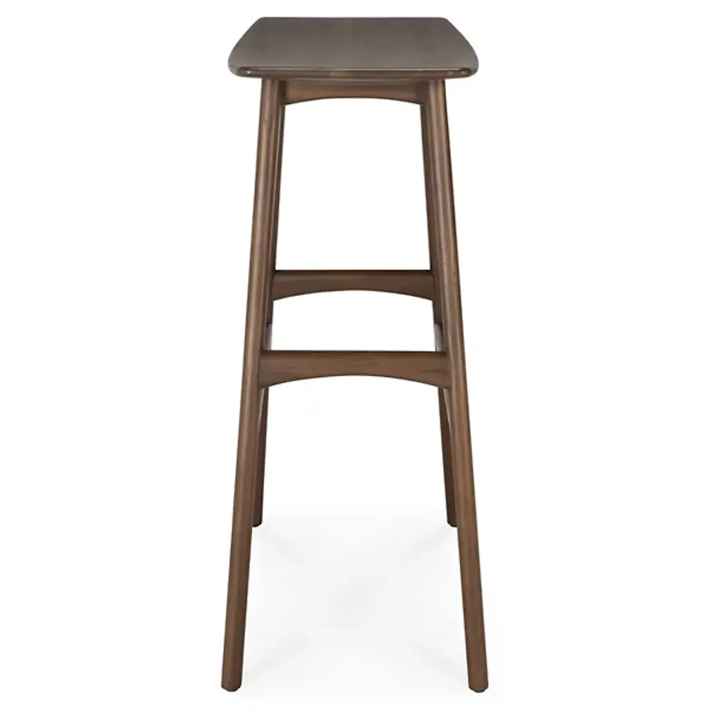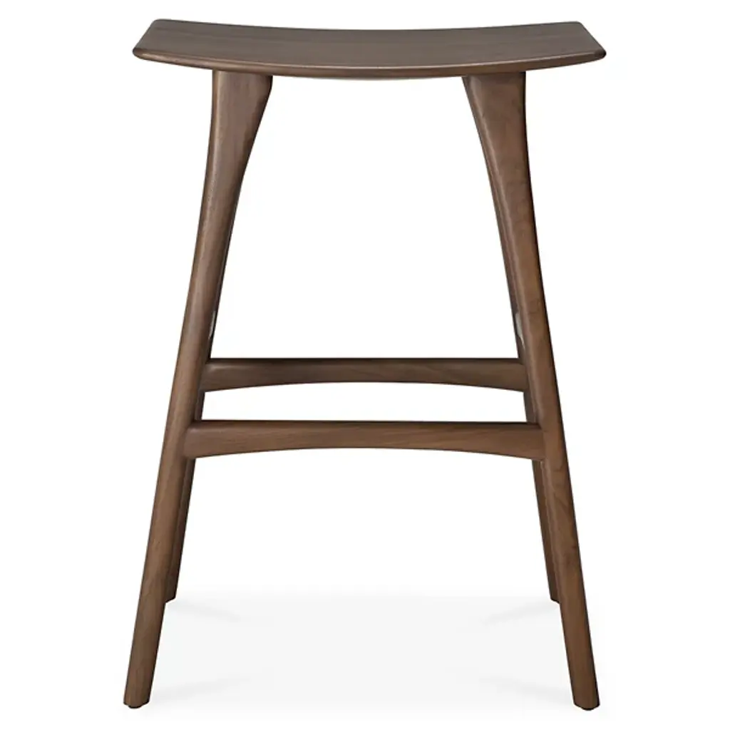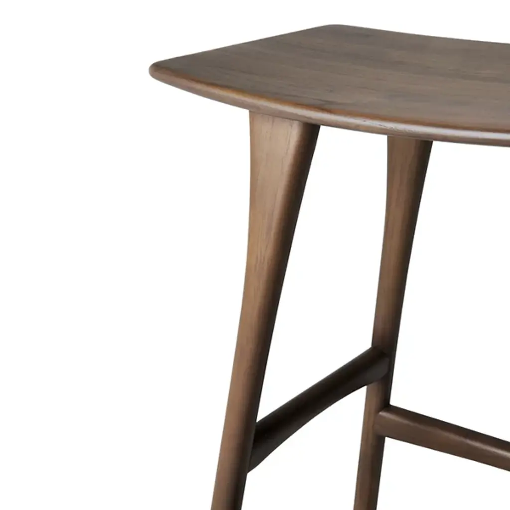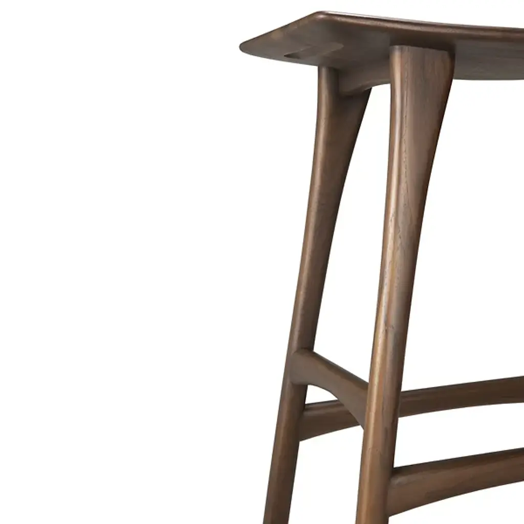 Nature-inspired, balanced symmetry shapes the flowing form of the Osso Bar Stool from Ethnicraft. Four tapered legs angle inward from a broader base to join a gently concave rectangular seat optimized for bar or standing desk height. A groove underneath enables easy movement. Ethically FSC-certified to indicate responsible teak harvesting, this versatile, leggy stool adds chic, airy seating to home offices and kitchen counters alike, playing a harmony of organic curves and angular geometry inspired by natural beauty.