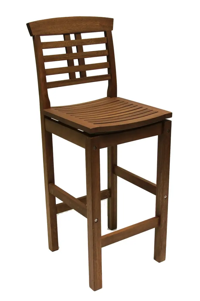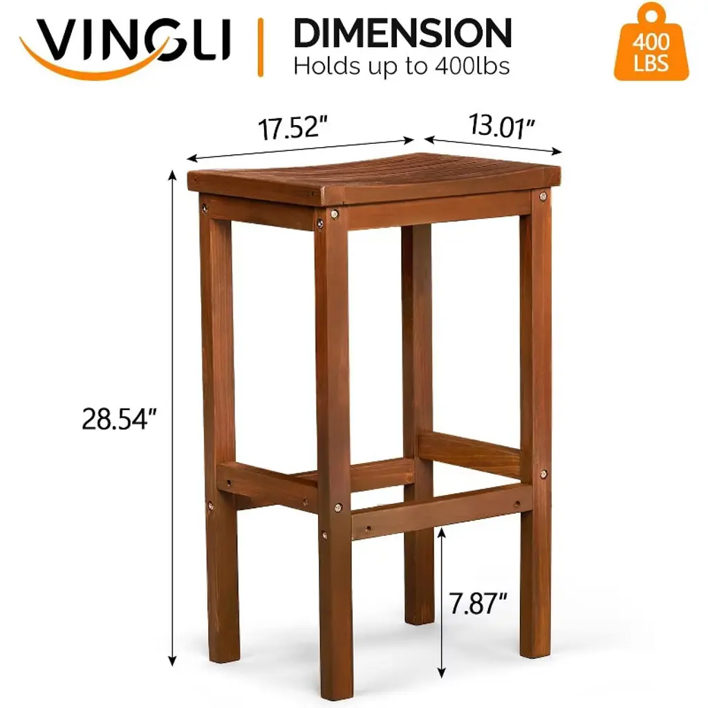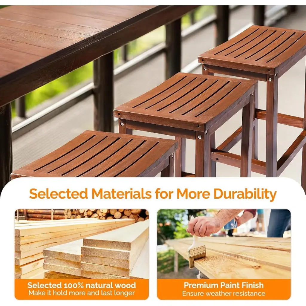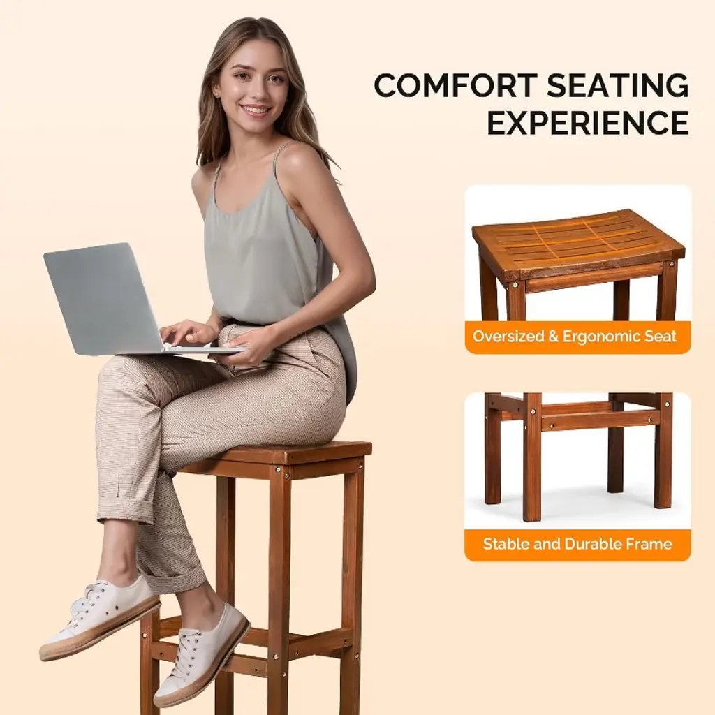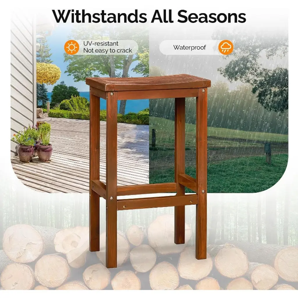 This set of 2 outdoor solid wood bar stools combines natural aesthetics with functionality. The 17.72" wide curved seat offer superior comfort. Made from kiln-dried dense wood to prevent cracking, these 28.54"-height stools fit most standard counters. Perfect for morning coffee or evening gatherings in your patio, garden, or kitchen—blending rustic charm with everyday practicality.