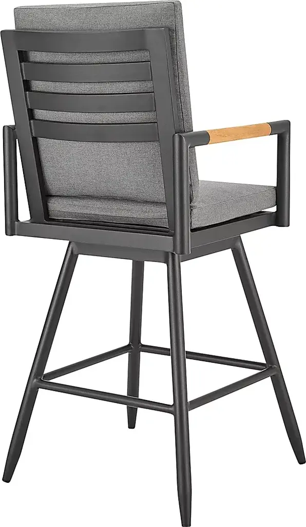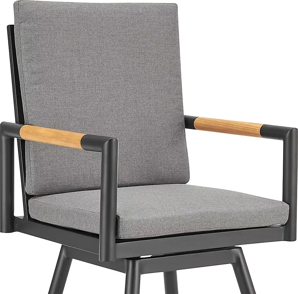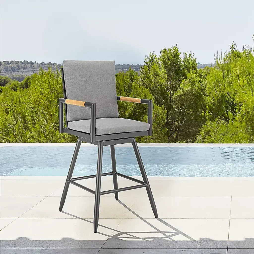 Introducing the outdoor Berrycords I dark gray and black barstool, an epitome of modern elegance and outdoor comfort meticulously designed to elevate your lounging experience. This versatile stool seamlessly integrates the contemporary allure of aluminum with the tactile sophistication of wood detailing and the plush comfort of removable cushions. Crafted with precision, the Berrycords I features a robust aluminum frame, ensuring durability and a sleek aesthetic that effortlessly complements various outdoor settings. The water-resistant and UV-resistant features of the Berrycords I make it a resilient choice for your outdoor space. Whether bathed in sunlight or facing unexpected rain, this stool stands as a steadfast and stylish seating solution for your patio or outdoor bar area. Customer assembly is required.