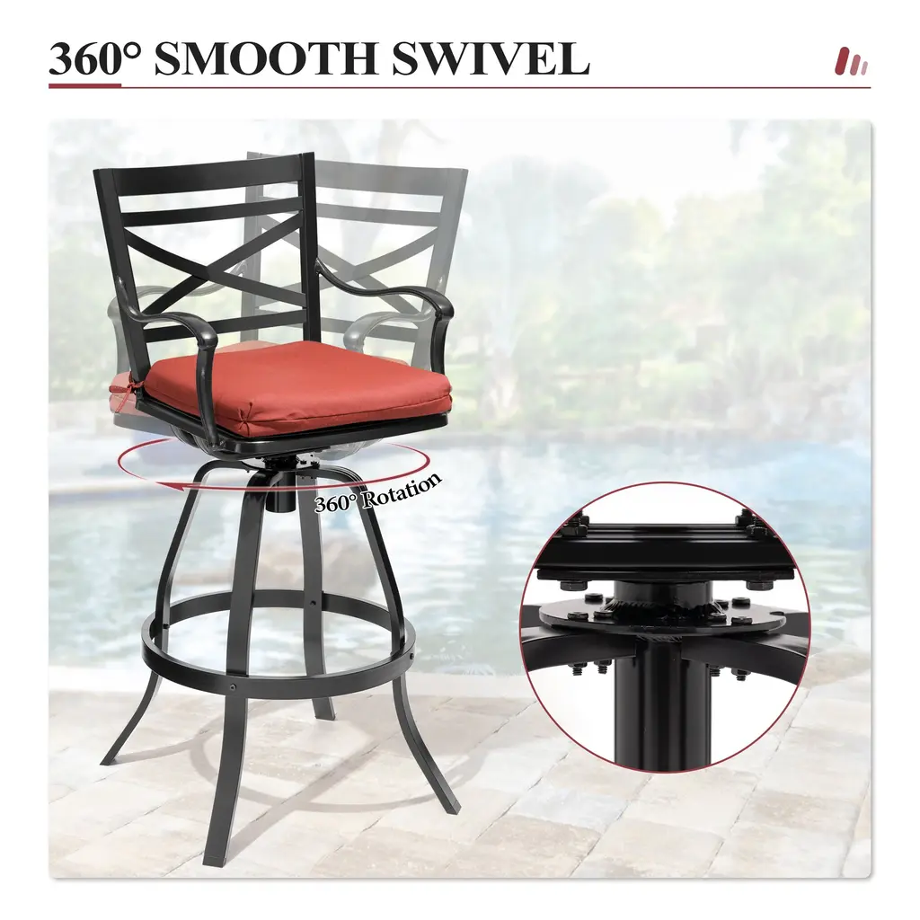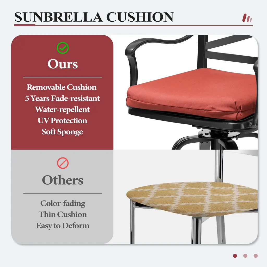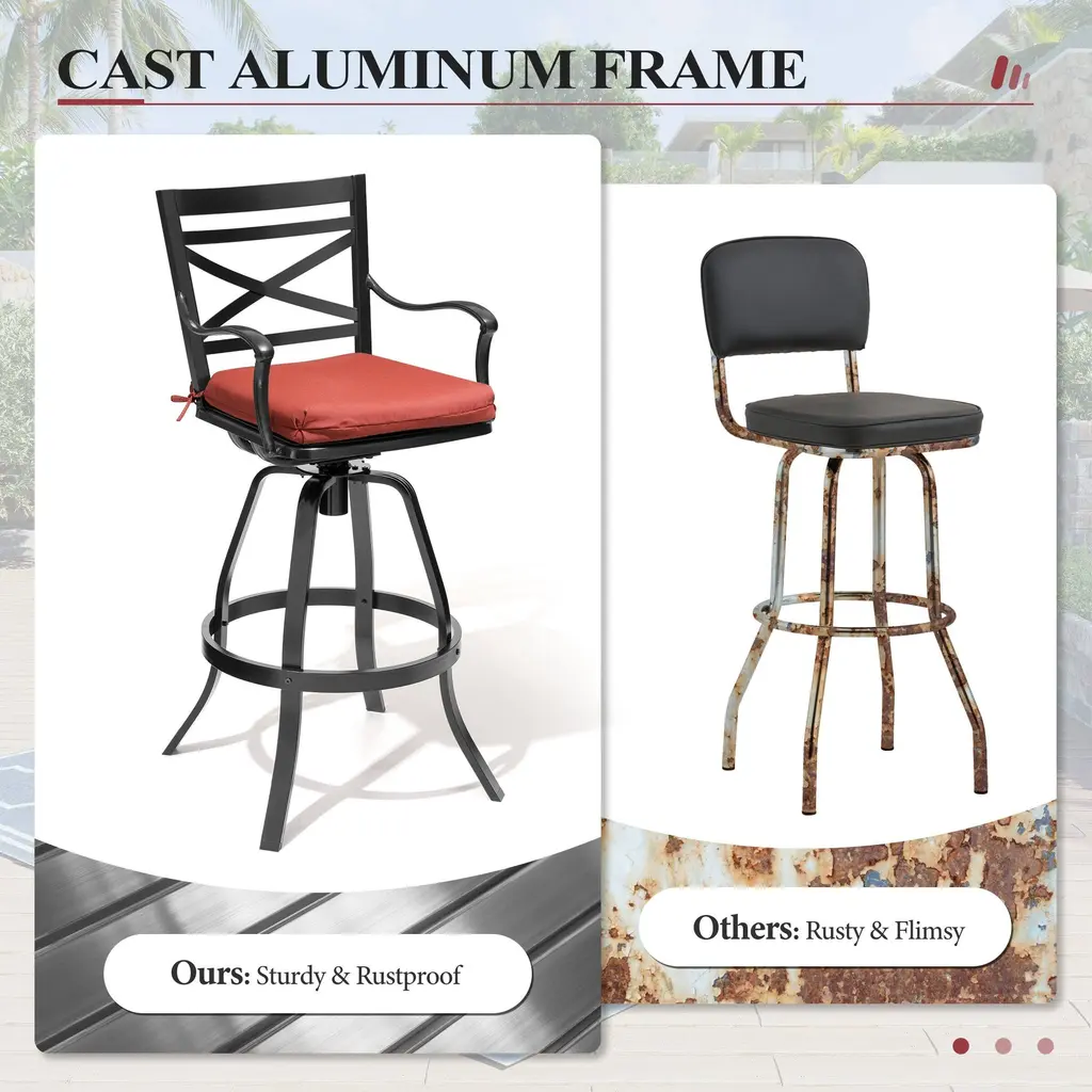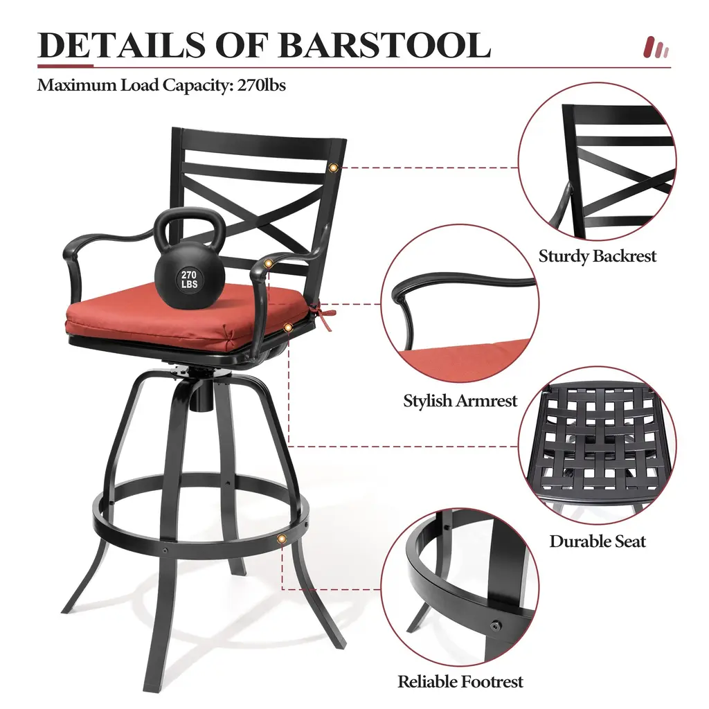 The patio swivel bar stools are made of sunbrella fabric and sturdy powder-coated cast aluminum frame. These stools have durable cast aluminum frames and sunbrella fabric seats for optimal durability and comfort. The armrest and backrest design of the bar stools are curved and designed to be ergonomic. These stools boast swivel seats for freedom of movement and come with soft cushion for added comfort. Enjoy a balmy dinner under the stars in your own backyard with this set. Features:Dimensions: