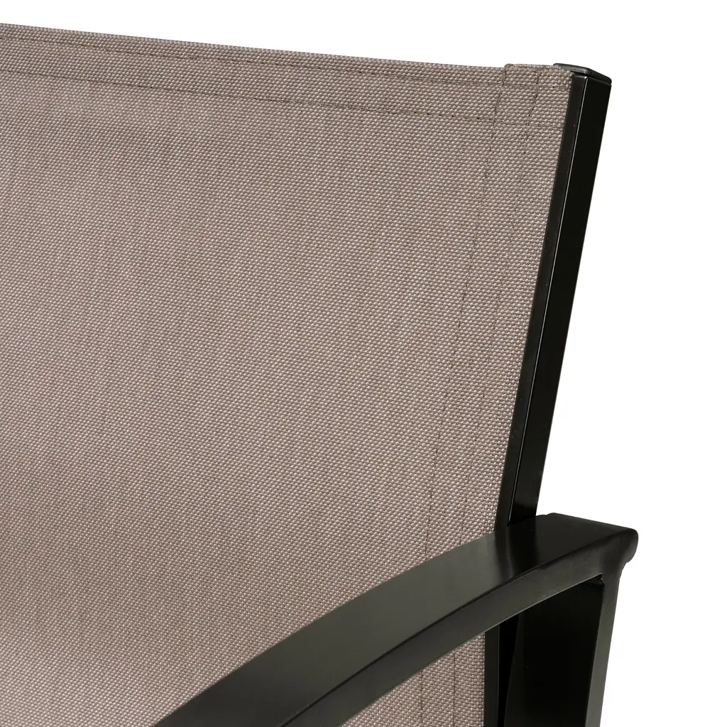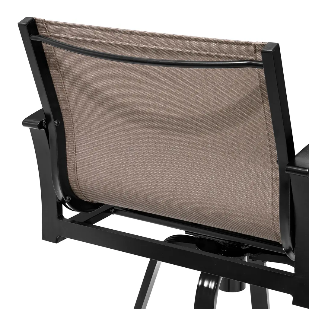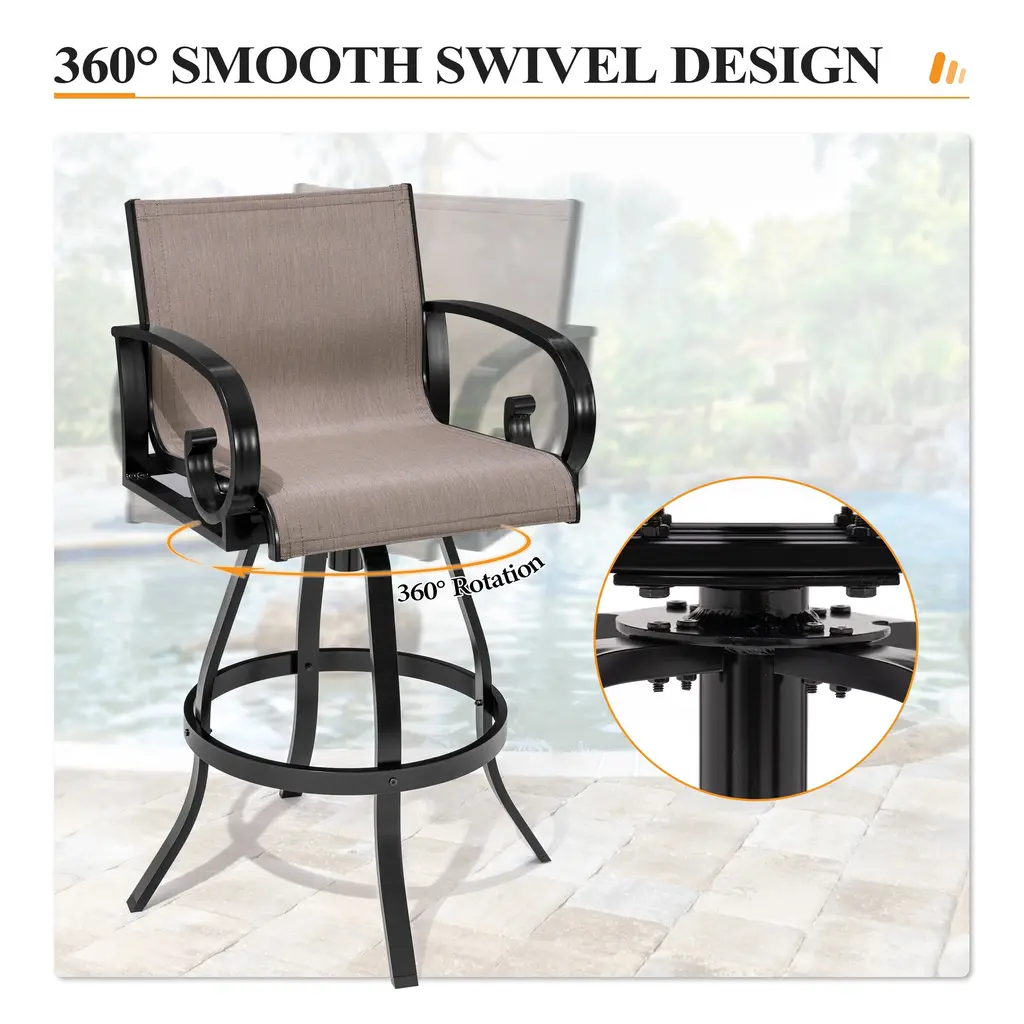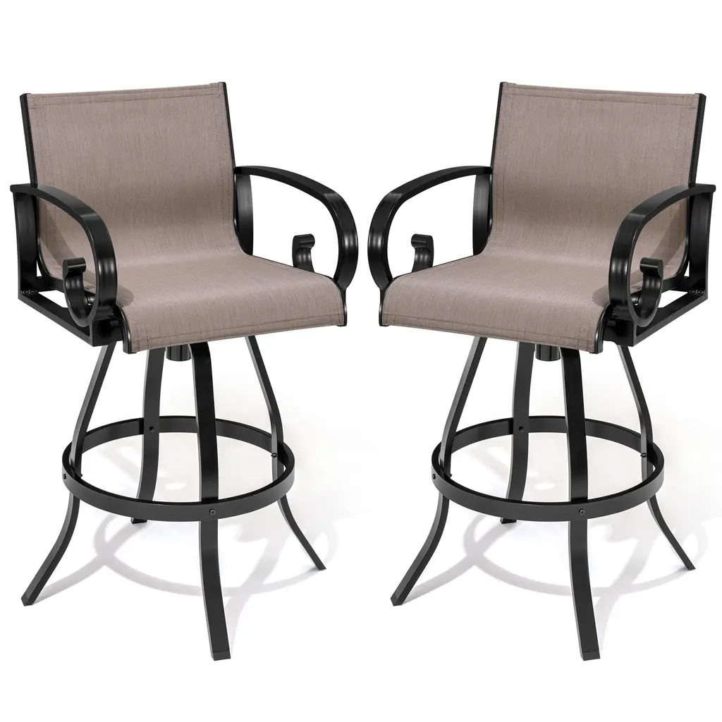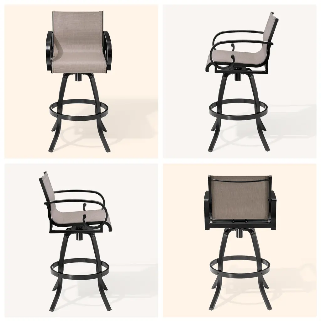 The outdoor indoor swivel bar stools are made of Sunbrella textilene sling and sturdy powder-coated aluminum frame. The Sunbrella textilene features 5-year fade resistant, easy to clean and maintain, UV-resistant and durable, breathable &quick-dry. The armrest and backrest design of the bar stools are curved and designed to be ergonomic. These stools boast swivel seats for freedom of movement and come with footrest for added comfort.Features:Dimensions: