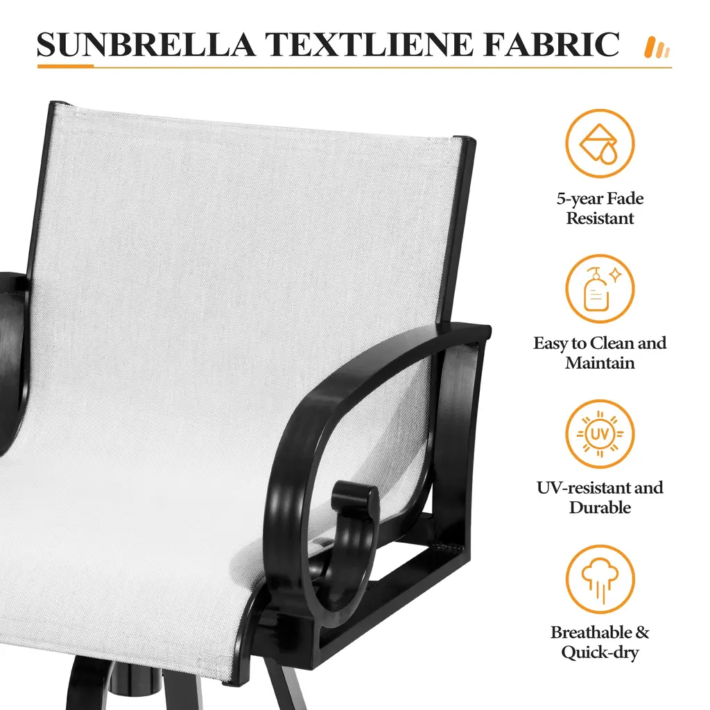 The outdoor indoor swivel bar stools are made of Sunbrella textilene sling and sturdy powder-coated aluminum frame. The Sunbrella textilene features 5-year fade resistant, easy to clean and maintain, UV-resistant and durable, breathable &quick-dry. The armrest and backrest design of the bar stools are curved and designed to be ergonomic. These stools boast swivel seats for freedom of movement and come with footrest for added comfort.Features:Dimensions: