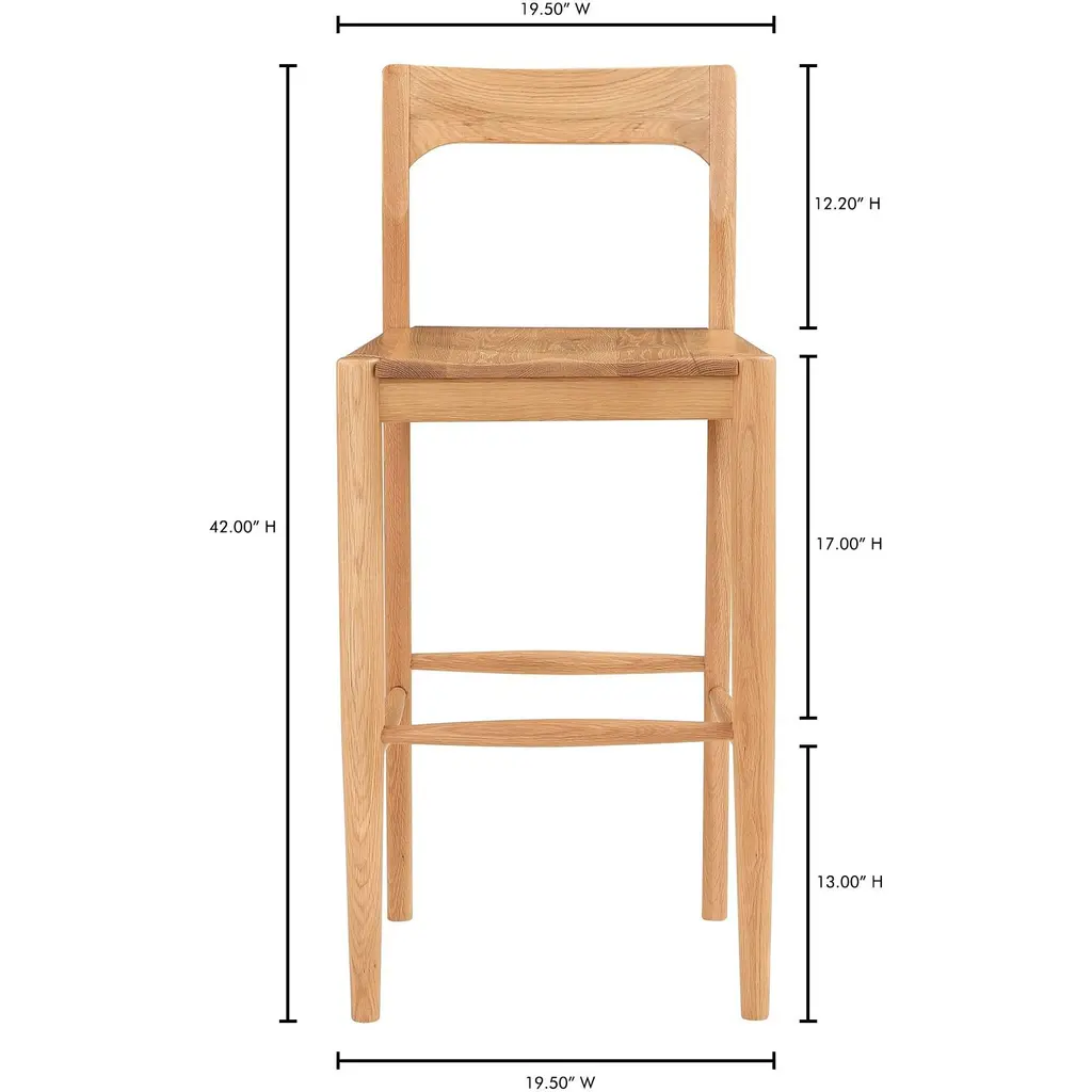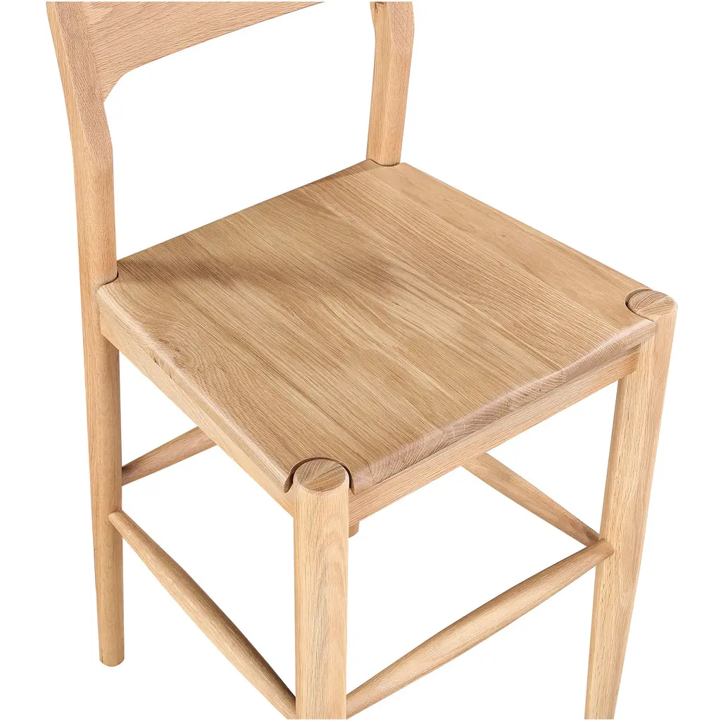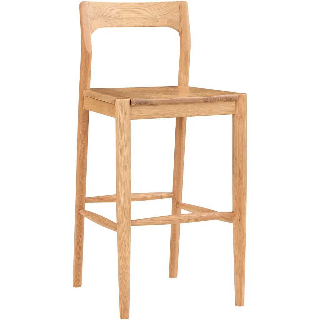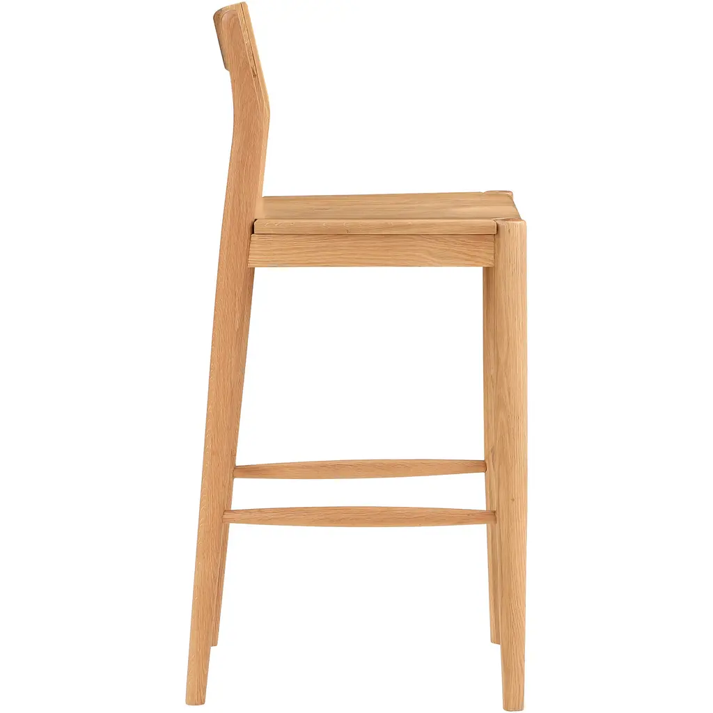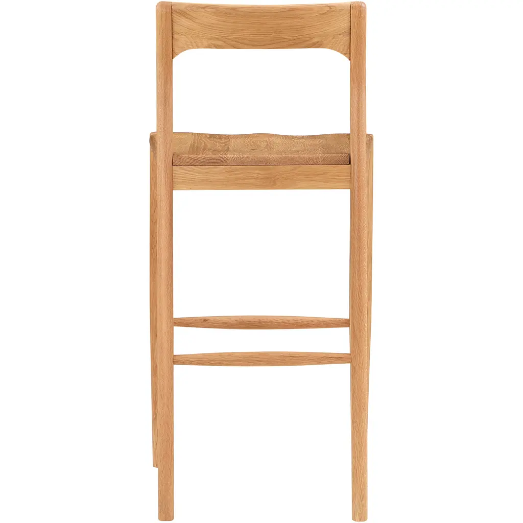 Available in oak, the Owing counter stool is a refined spin on the traditional. Its mid-height, curved, open-back design combines comfort with casual appeal, while its solid wood frame creates a timeless, mid-century silhouette.
