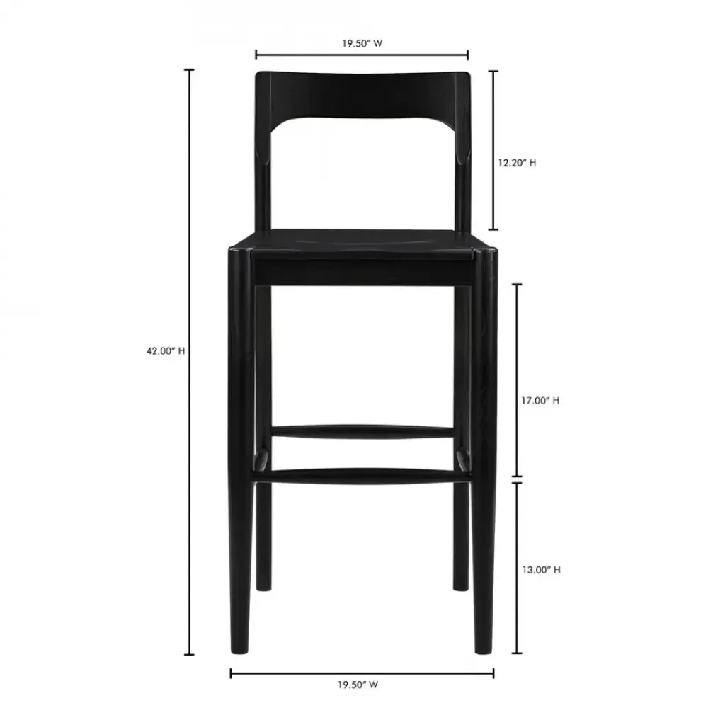 Available in blackened oak, the Owing counter stool is an updated take on a mid-century style. Its mid-height, curved, open-back design combines comfort with casual appeal, while its solid wood frame creates a timeless, mid-century silhouette.